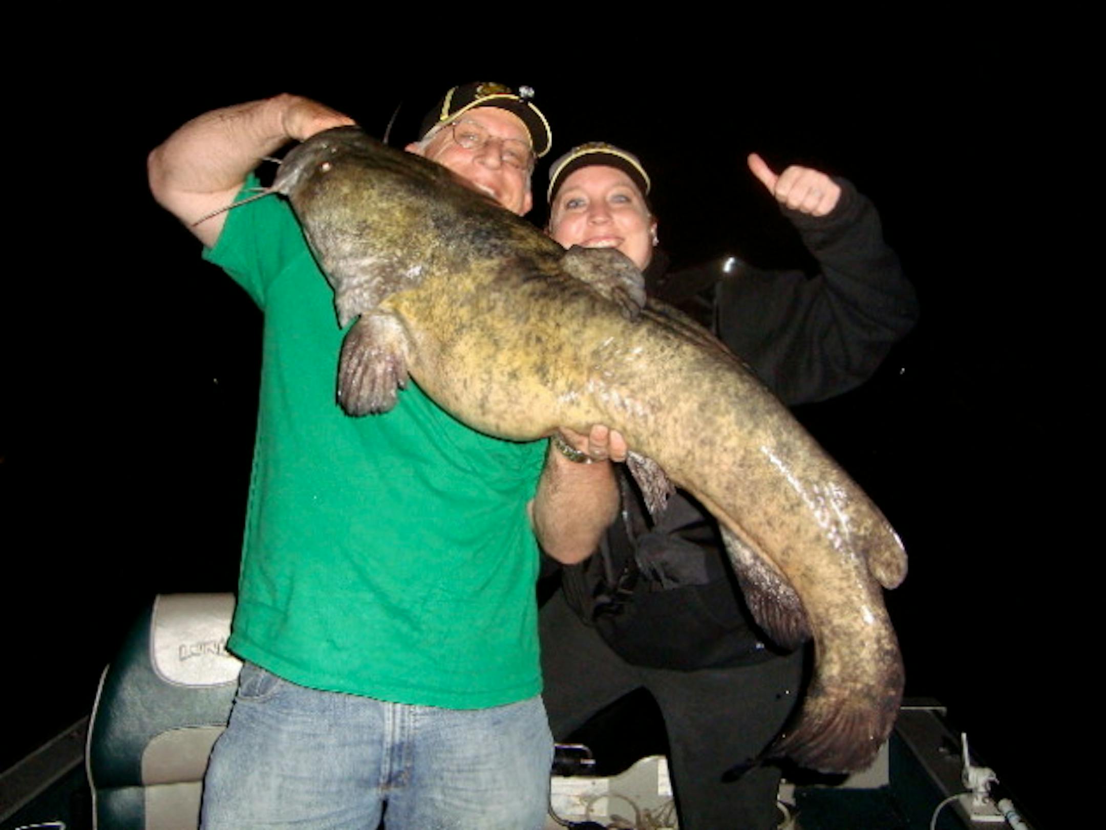 Our first fathers day flathead came at 8 pm. Niki landed her first fish of the year at 14 pounds. With all the hooting and hollering coming from our boat, you would have thought it was much larger. We weighed the little guy, snapped a couple photos then gave her a quick kiss good bye. I was a bit surprised we hooked into a fish that early in the night. I baited the hook with another live 8 inch bullhead and placed it next to the big log jam with the hopes of finding a little larger fish.