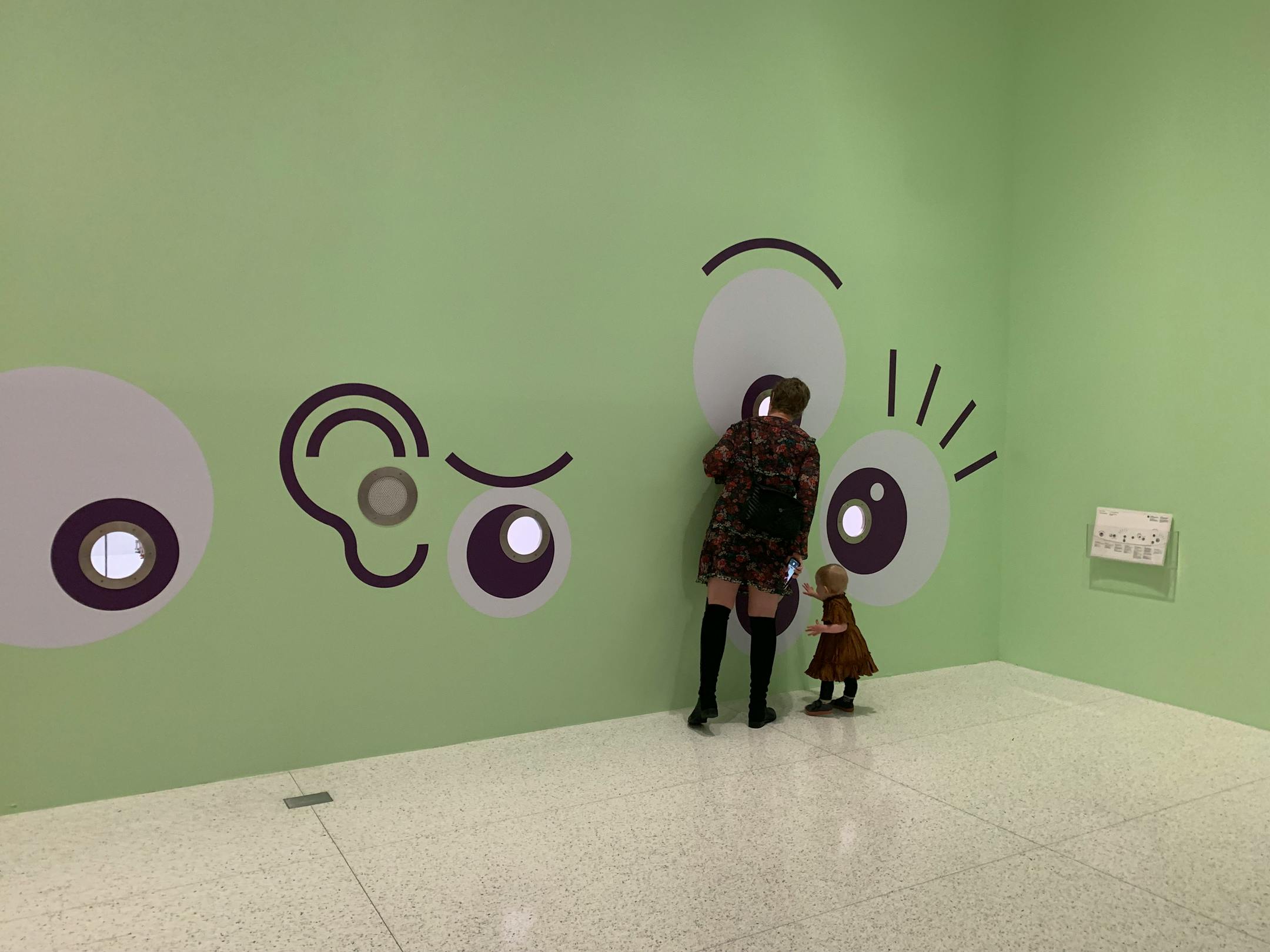 The artworks range from a dramatic animal painting by Minnesota’s Julie Buffalohead to a Roy Lichtenstein print depicting a screaming toddler. Kids especially delighted in peering through a series of portholes to discover sculptures — a model of “Spoonbridge and Cherry,” a pack of black rats — hidden in the wall.