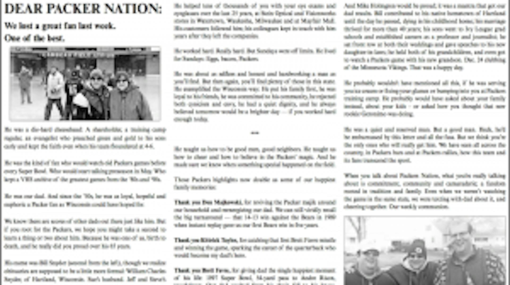 See, the family of longtime Packers fan Bill Snyder decided against a traditional obituary when he died recently. Instead, they took out a half-page advertisement in Sunday's Milwaukee Journal-Sentinel in which they shared stories about their dad that mostly revolved around his love of the Packers.