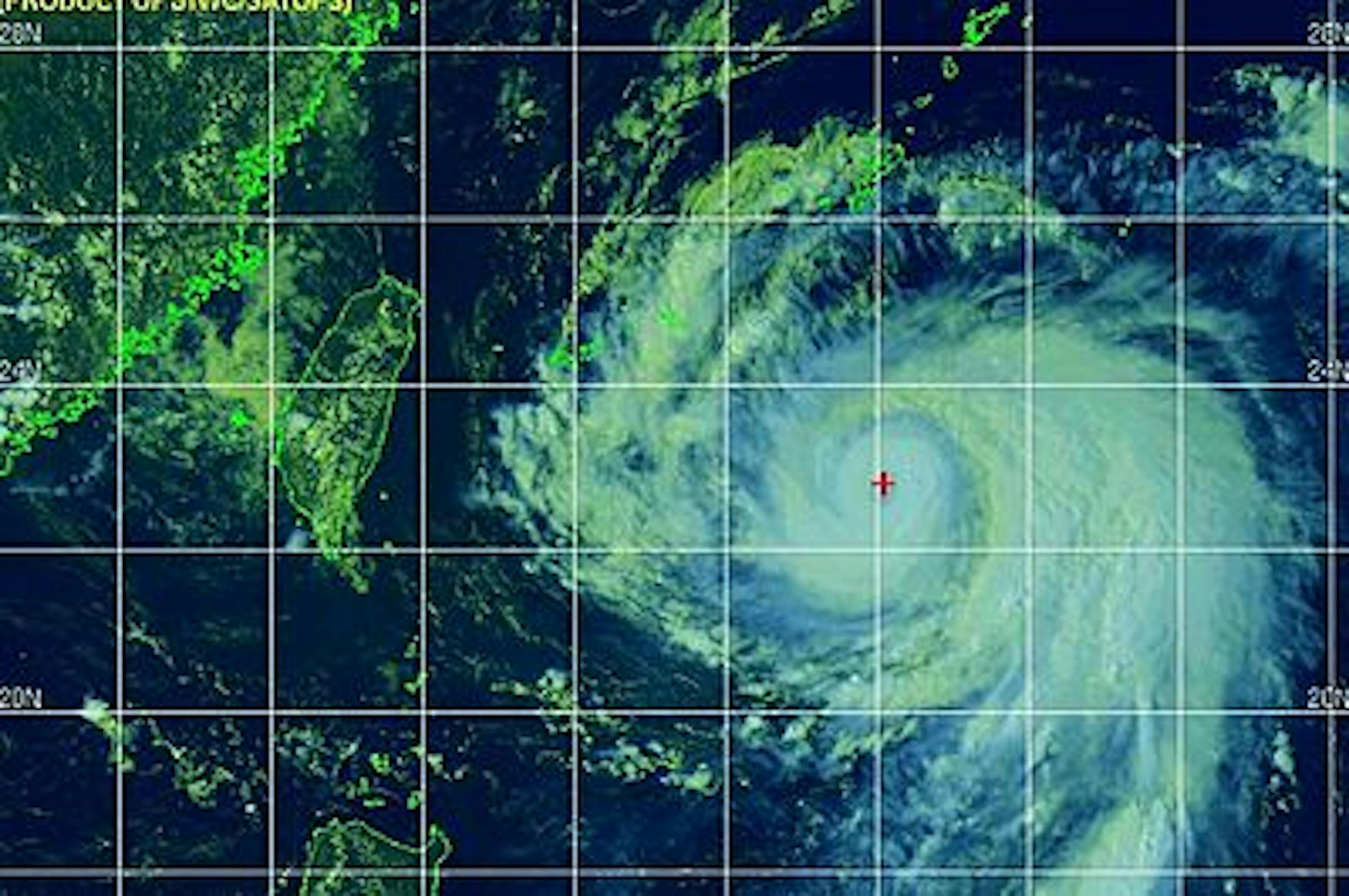 Satellite image: Navy Research Lab MontereyBut this sluggish behavior will give way to a committed westward drift thatwill culminate in a typhoon landfall upon eastern Taiwan between late Saturdayand Sunday.