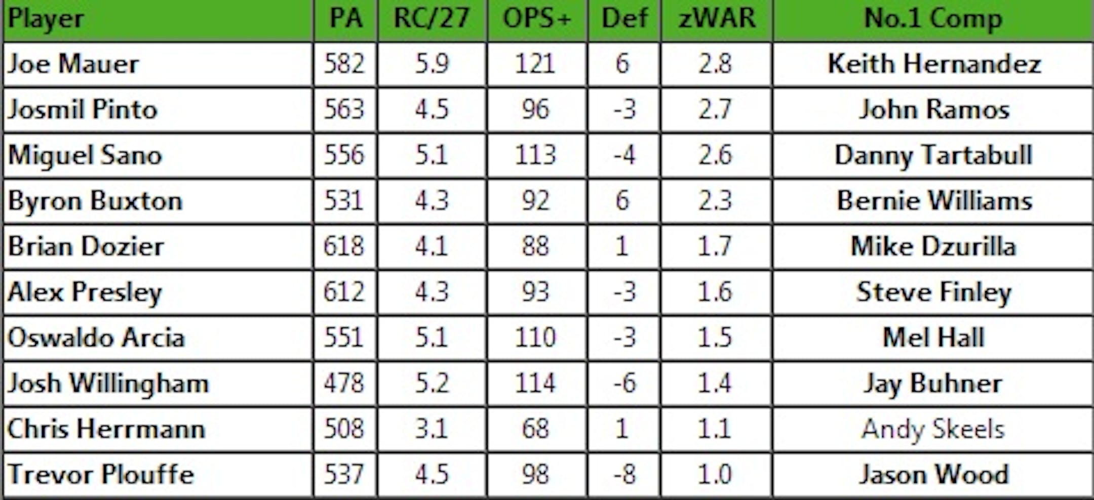Perhaps more alarming for 2014 -- but encouraging, we suppose for the future, which is the other way to read these projections -- are the players listed directly below Mauer in terms of projected offense. The site lists players ranked in terms of WAR, and the next three are Josmil Pinto, Miguel Sano and Byron Buxton.