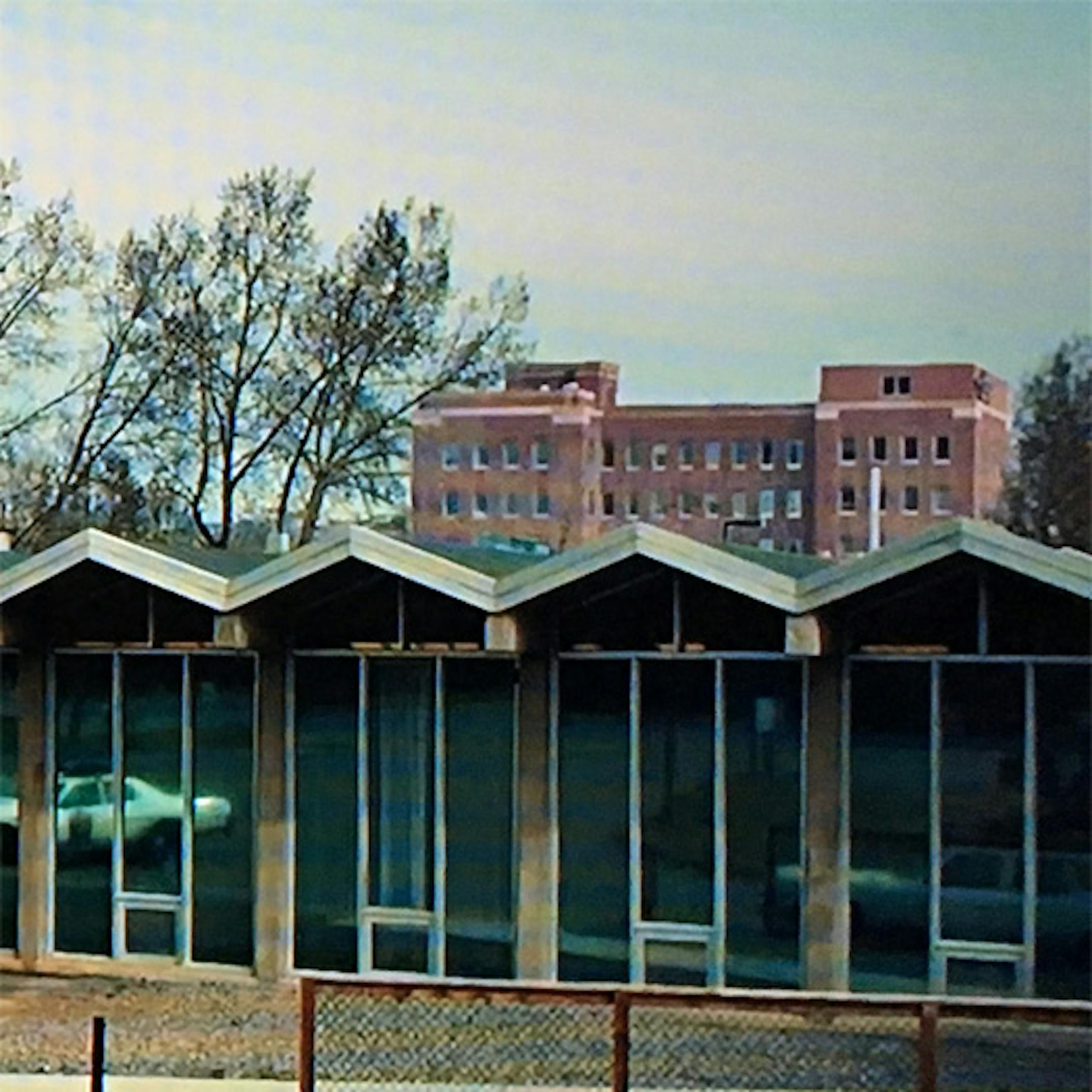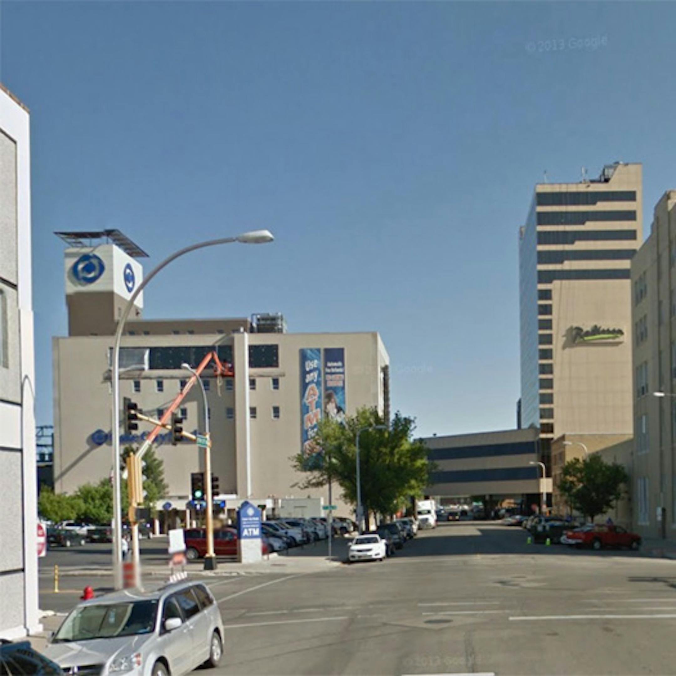 It's the old First National Bank, seen from Main Avenue looking north. From that perspective the other buildings would be on the right, not the left.
