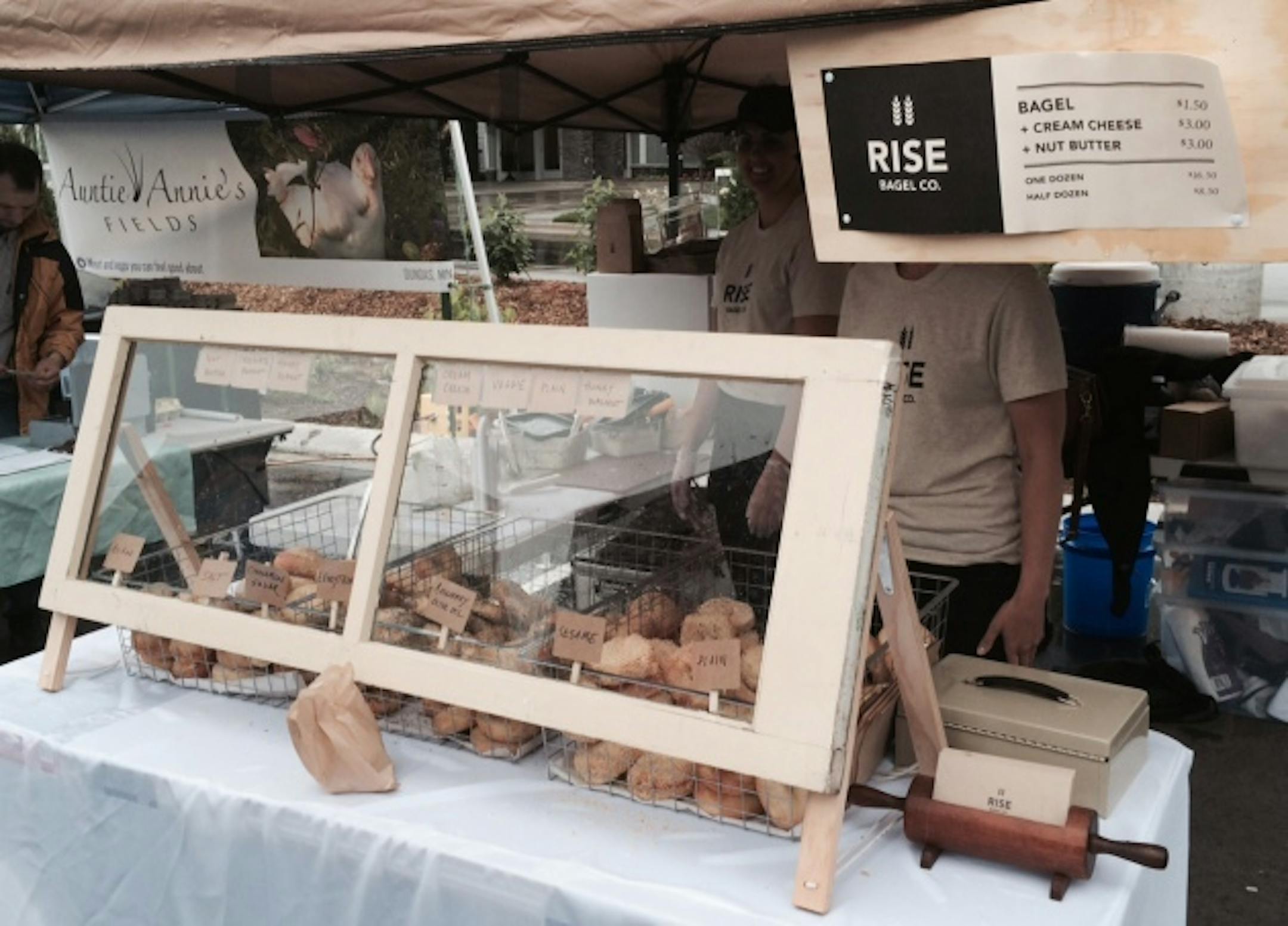 New to me, anyway. The market, too; the Rise Bagel Co. was in the middle of its second appearance. Sisters/co-owners Kate and Jen Lloyd (they call themselves "bread heads") were busy hawking a half-dozen varieties of bagels, and, seriously, wow.