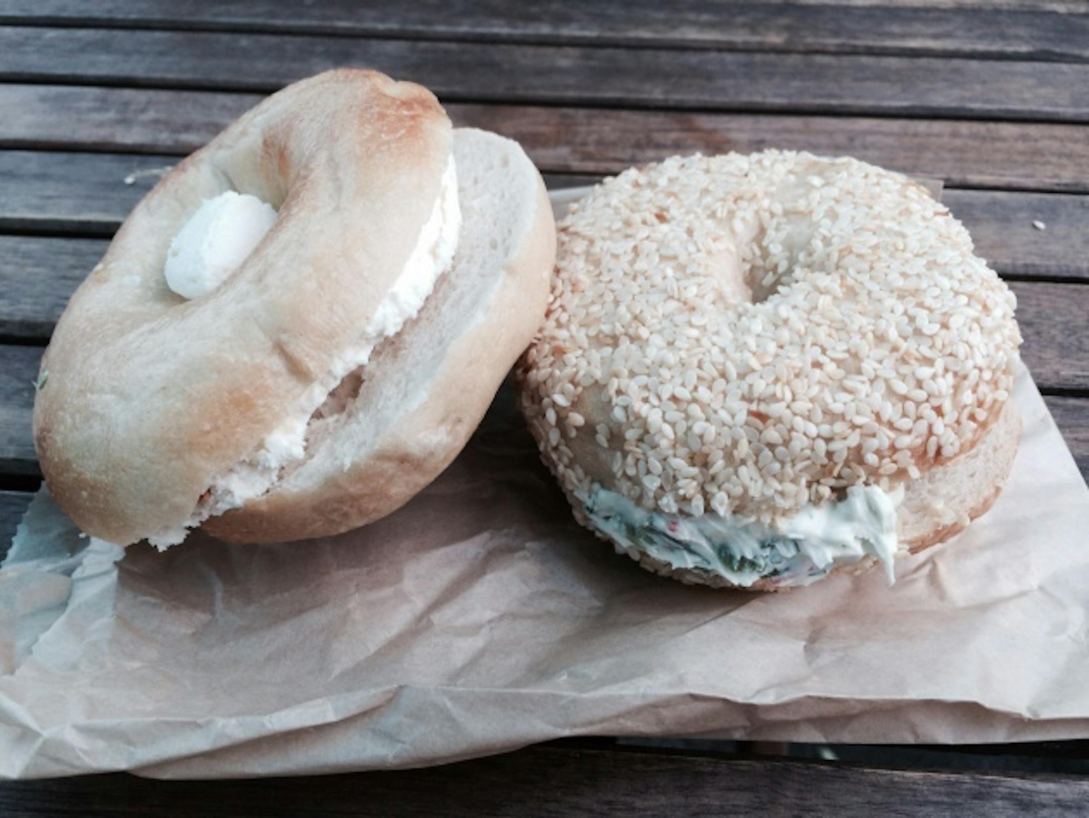 There's a handful of cream cheese blends, including a lively, dill- and garlic-flecked veggie mix that's heavy on the cucumber. Still, the most popular combination is total bagel Puritanism: Plain bagel, with plain cream cheese.