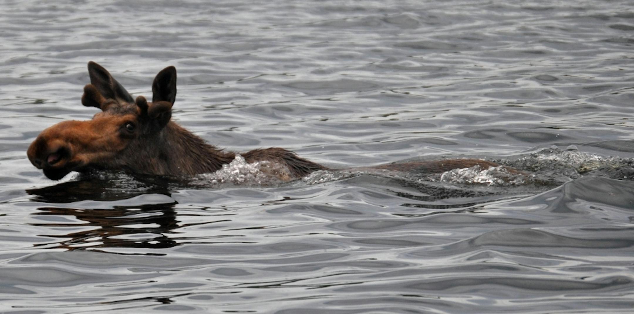 The dot looked out of place, so we motored over to check it out and quickly realized it was a young bull moose swimming across the lake! I had spotted its head from over a hundred yards away, and we were about to get an up-close-and-personal look.