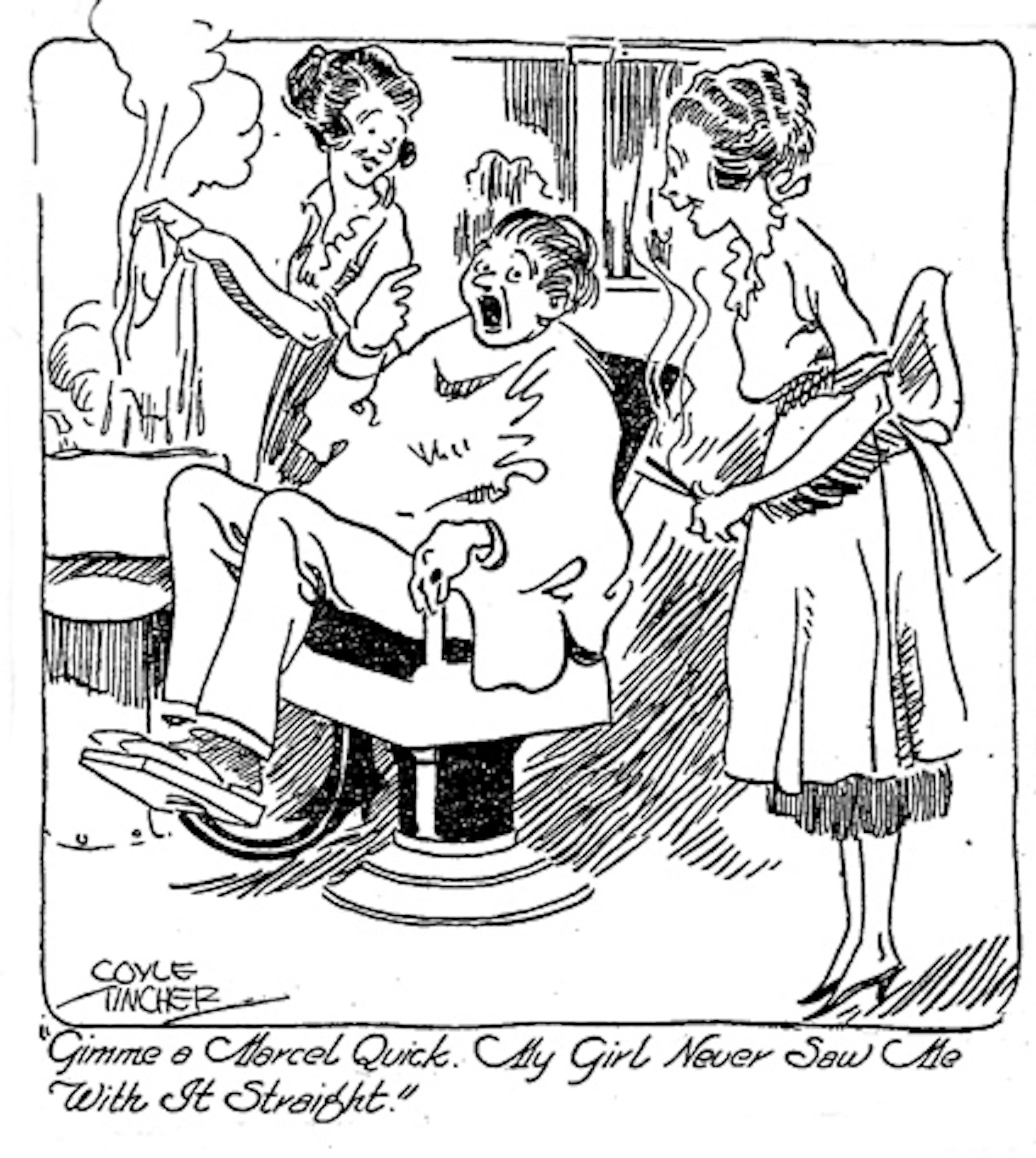 Hair May Get Straight Again But Will Never Look the Same. "THIS fellow Blackie said he had to have his hair marcelled because he was going to a dance." Miss Elizabeth Erickson, lady barber with a shop at Nicollet and Lake, was telling the Cub Reporter how if it wasn't one thing it was another in the means of livelihood she had chosen. "Blackie, that was what we called him because we didn't know his real name, was a handsome young man with long blue-black hair that was broken in tis glossy smoothness by a deep wave. The girls always enjoyed shaving him because he had such a pleasant way with him. "We hadn't seen him for a month or more. Then he came in in a tearing hurry, jammed himself into a chair, and demanded: 'Gimme a marcel quick.' His hair was as straight as yours. " 'What do you think this is, a beauty parlor?' I asked him. " 'Aw, have a heart,' he begged like a child. 'The place where I usually get it done is closed, and my girl never saw me with it straight. For the love of Mike, how can I take her to a dance like this?' "I didn't see what I could do, but one of the girls got a curling iron, and in half an hour he looked like himself again." It Would Surprise Women. "As Mrs. Mary Dahl says – she's a lady barber in the Allen hotel – women would be surprised if they knew how much time and money men spend to make themselves look nice." Miss Ida Marie, assistant lady barber at Miss Erickson's shop, couldn't keep out of the conversation here. "They're just awful the way they fuss over how they look," she told the Cub Reporter. And her dimples deepened as she smiled. "They come in and get a massage before they call on their girls, before they go to the theater, and before they go to a dance. And then they have the nerve to say they do it because it helps them in their business. "Me vain? Sure I'm vain, if you mean do I care how I look. But after all women kind of have a right to feel that way, haven't they? You expect something different from a man." The Cub Reporter, who had been a violent suffragist in the days when that was necessary, quoted sardonically, "We don't want 'em to be our equals or our superiors." They Purr Like Kitten. Miss Marie dimpled again. "They're supposed to have something bigger on their minds. But they try to laugh it off. 'Better sling some mud in my face, today,' they'll say. And then they sit there purring like a kitten, they're so comfortable." Miss Erickson had finished arguing with a youth who wanted pure olive oil rubbed into his fair mane. She thought Vaseline would create a luxuriance that would make him look like a free verse poet, but he said that nothing gave the luster like olive oil, the olive oil from Greece. She dusted him off maternally, and he went out slowly, peeking at himself in every mirror he passed. Miss Erickson caught up Miss Marie's word "comfortable." "That's it with the older men, I think. They like having somebody fussing over them to make them comfortable. You'd like it yourself, and a good massage would take that tired look off your face." "But men are vain," insisted Miss Marie, and the other girls assented vigorously. "Men are vain," the Cub Reporter told the editor when she got back to the office. "Other men," said the Boss, absentmindedly. "I'll never let the tailor press these trousers again." "And they get their hair marcelled." "Where?" "I don't know. A lady barber told me." And the Cub Reporter told the whole story. Job for Cub Reporter. The Girl Reporter winked at the Editor. "Why not send the Cub around to the beauty parlors with an expense account? She can get marcelled herself the while she's finding out where you folks get your manly locks curled." The editor looked hopeful. The Cub clutched the little knob of straight red hair, which to say it in the kindest way, was innocent of artifice. "It won't hurt you to lose it," the Girl Reporter said cruelly. "It always looked like a doughnut slipping off a shelf." "Slipping's the word," the Boss continued the attack. "Here's a sheaf of hairpins you spilled on me yesterday when I was conferring with you about that story. You go to the beauty parlors, and start today." "But," the Cub Reporter quavered, "my nice straight hair, it's never had an iron on it." "And never kept a hairpin," spat the Girl Reporter. "Have you no devotion to the paper?" the Boss roared. "Go out and do what I tell you. You can wash the marcel out if you don't like it. Now go out." "She can wash it out," chortled the Girl Reporter. And to the music of office laughter, the Cub Reporter went her way. She Gets a "Facial."