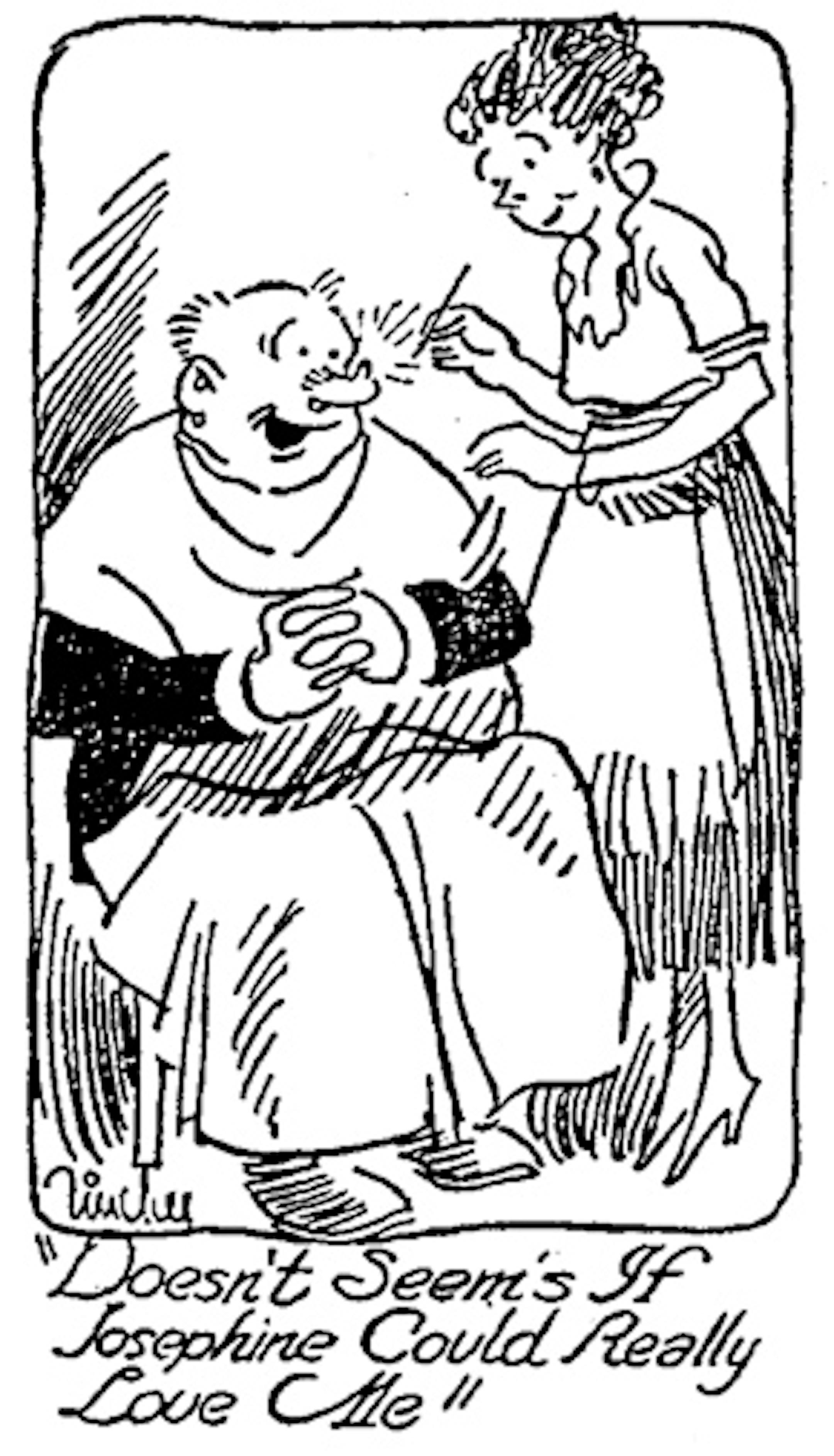 " 'Doesn't seem's if Josephine could really love me. But I guess girls are more finicky than they used to be when I was a young fellow. Mary and Emma were both good women, but they couldn't hold a candle to Josephine. " ' Josie,' and then the poor boob gets red, 'Gotta stop sayin' that,' he says. 'Josephine don't like it. Ouch, damn.' The electric needle does hurt a good deal, you know. 'Josephine's worth it." Poor old goof. Same Silly Smile. "Your hair's all dried now. Do you want me to dress it? Better have it marcelled, don't you think? You've got beautiful hair; it'd be nice for a change. You've done it so simple." The heart of the Cub Reporter grew warm in her breast. "Shelf and doughnut" indeed. Here was somebody who appreciated her. As she nodded assent to the marcelling she caught sight of the same silly smile on her face. "There can't be three mirrors built wrong in the same way," she reasoned. "It must be there. Well everybody said I'd be ruined for life if I started working on a newspaper and maybe it's true." "Lots of old men come in to have their bald spots rubbed for hair. And they're not so old, either. Funny what a lot of young fellows think they're gettin' bald. They don't trust their barbers; barbers have bald heads themselves. "Talkin' about hair, did you know that men come in here by the dozen to get waves put into it?" The Cub Reporter jumped so that the iron burned her ear. "Not really?" "I'll tell the world they do. Say, you are an innocent if you think all the curls you see your men friends wearing are made by old Mother Nature." "What kind of men come in for curls?" Even Newspaper Men Do It. "About all the kind there are. Not so many old men, of course, because they haven't enough to curl. That old goof with the wart I told you about was trying to make us think he'd heard of some new way of planting hair on a bald pate. Said a doctor told him about it. I'll say the guy that invents a thing like that is going to have a good chance of dying too rich to get to Heaven. They'd come to us with bags of money. "I was tellin' you about fellows that come in for marcels. There's a newspaper man, works on the (naming a prominent daily), writes poetry or something for it, he's a regular customer. And men from the Symphony orchestra, lots of them. There's one comes in that looks like a big black bear; his hair's kinda curly already, so he gets a water wave. "I never get surprised at anything that musicians or newspaper people do, though. You expect them geniuses to be sorta foolish, don't you? But business men come, too. They wouldn't be ashamed if they met their own wives. "When I was a kid a boy that had curly hair was ashamed of it. Well, the world changes. Your hair's hard to curl, miss, it's so fine. I'll have to try that wave again. I hope you've got lots of time, but you know after you've neglected your hair a long time, it's bound to act this way. There's Much to Be Had. "Your eyebrows ought to be plucked, they're so thick. They ought to be blackened a little, too. Bein' so light the way they are, you can't see them 'less you look close. Your lashes are kinda long, 's a pity they are so pale. "I always say a woman owes it to herself to do the best she can for herself, and beauty counts more'n you'd think if you haven't been out in the world. "Where'd you say you work? Oh, in an office. Well, I bet you ain't got any women friends in there that'd tell you what to do for yourself. You keep on getting' your hair curled, and take my word for it something's sure to happen. "Want your hair inside or out? Well, maybe you're right. It would be kind of hard for you to do yourself with it in. "Do men come in here to get their eyebrows plucked? You tell 'em, funnybone, you made the hit. As far as I know there's just one thing they don't come for, and that's the rejuveniler treatment that takes away wrinkles permanently. And they say that they get that in Chicago. Men Are Vainest.