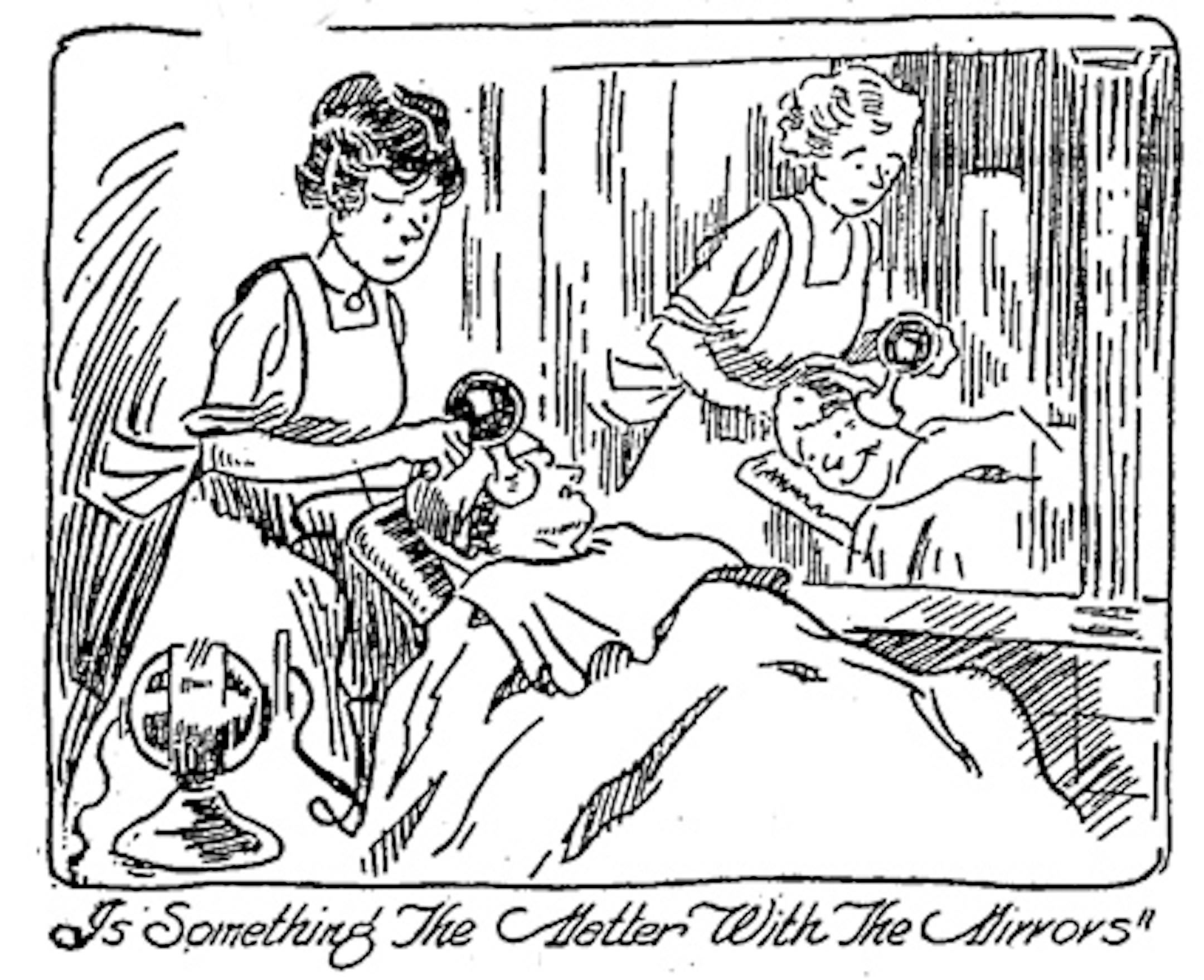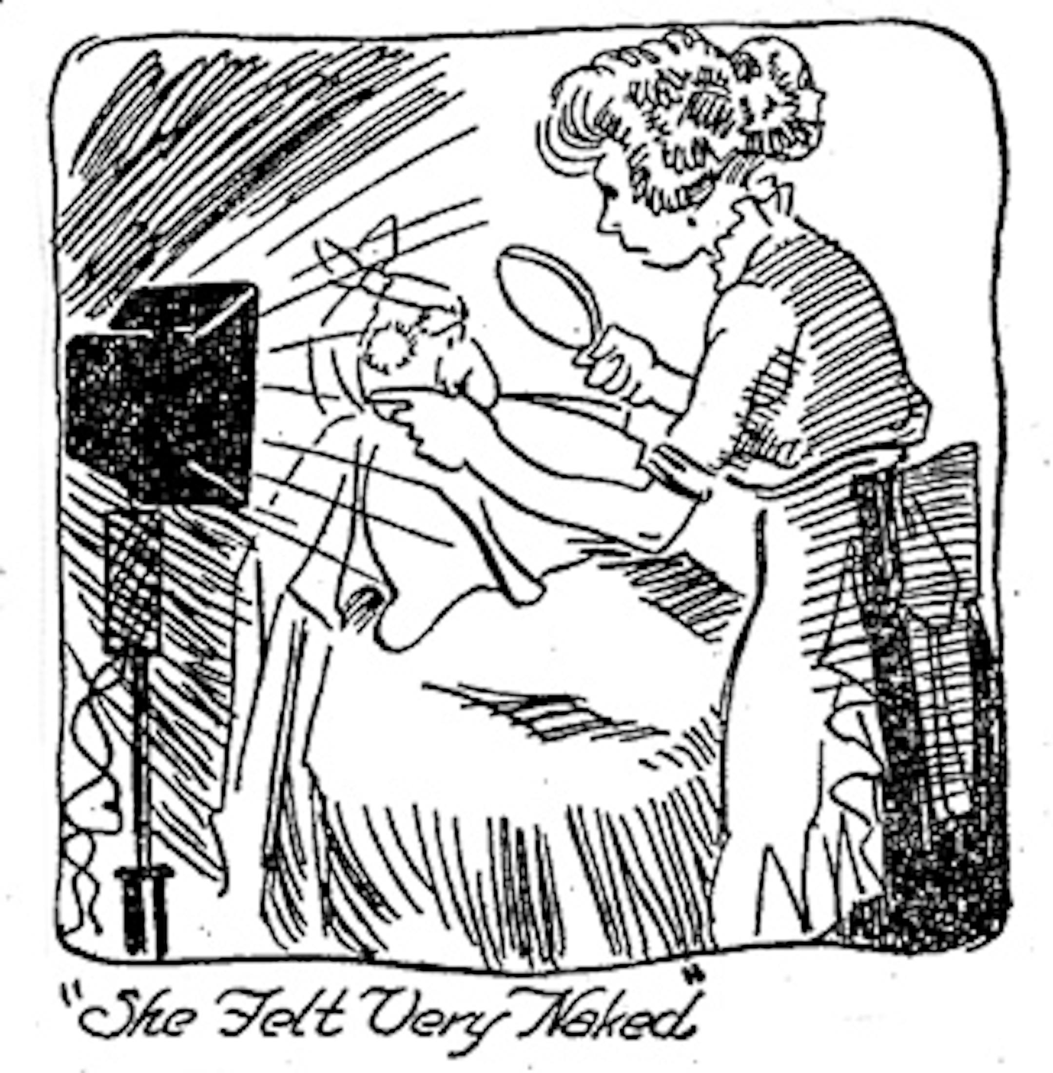 On the way down in the office elevator, she took a look in the mirror that was to have been a farewell to that nice straight hair. But she was puzzled to see on her lips a fatuous smile. Could it be? "H'm, we're all funny people," mediated the Cub Reporter, picking up a hairpin. Because of that smile, she didn't dare have her hair done first; she stepped into a little shop on Nicollet, thoughtfully named the "Sanitary," and demanded a massage. "You mean a 'facial'?" the girl asked a little contemptuously. "Whatever you call it, I'm not up on modern slang." She was gently lowered into the chair, protected with dry towels and swathed in hot wet ones. She wondered wherein men found the comfort which the lady barbers had mentioned. While she lay and steam-burned, the girl was sitting in a low rocker, embroidering on something that looked dainty and feminine. All around were screens with figures of happy children prancing and playing. It was an exceedingly domestic shop in which to lie and suffer. Men Barred – Keeps Place Nice. "I have heard," the Cub Reporter ventured, "that men come in to get their hair done." "We don't take gentlemen," the girl answered, rubbing great gobs of pink cold cream into the Cub Reporter's skin. "Gentlemen muss up a place so, and we like to keep it nice here." She didn't appear shocked at the idea of a man's having his hair done. Only it mustn't be in her shop. The Cub Reporter kept quiet for awhile during which the girl wiped off all the cream she had rubbed on, and with it perhaps a speck of dirt. "Dear me," she thought, "was that what my friends meant when they said I should powder to cover my deficiencies? I must find out if they knew that I was as dirty as I am. And I must continue the search for the marceller of males. Ouch." The vibrator was brought into play, and the Cub Reporter felt just like going to the dentist. But she got a peek at herself in the glass, and through the depths of grease she could still see that silly anticipatory smile on her face which she had first noticed in the elevator. "Good Lord, am I that much of a fool or is there something the matter with the mirrors? Funny idea that about men getting themselves fixed up, isn't it," she asked the operator.