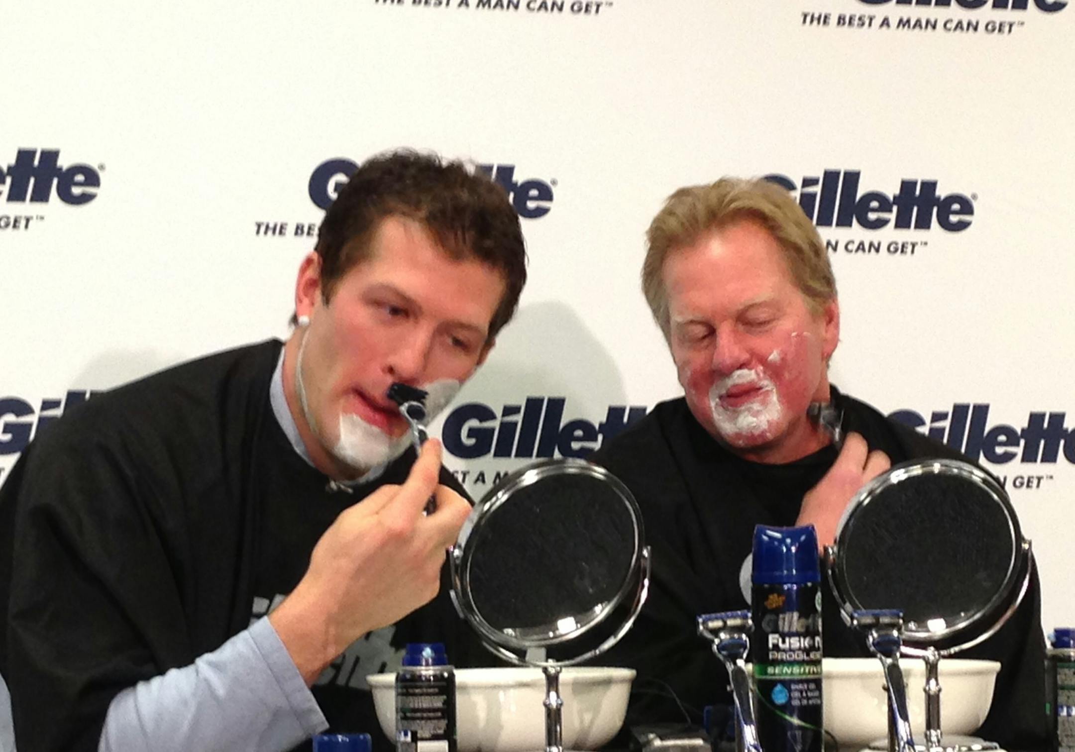 Father and son were gathered in the bowels of Xcel Energy Center on Wednesday morning for a pre-Olympics "ceremonial shave" hosted by Gillette. The quiet, laid-back duo self-consciously donned shaving cream and ran blades across their faces as cameras clicked away.