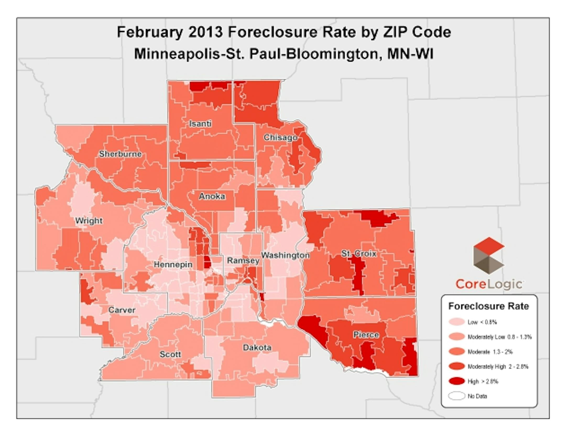 Foreclosure activity in the Twin Cities metro took a healthy dip during February, but mortgage woes remain a serious problem. CoreLogic said that the foreclosures rate in the metro was 1.15 percent for the month, a decline of 0.82 percentage points compared with last year when the rate was 1.97 percent. That's well below the national rate of 2.85 percent. Delinquencies - loans that were 90 days or more late and an indicator of future foreclosures - also declined, falling 1.06 percentage points to 3.65 percent of all mortgages compared with 6.2 percent nationally.