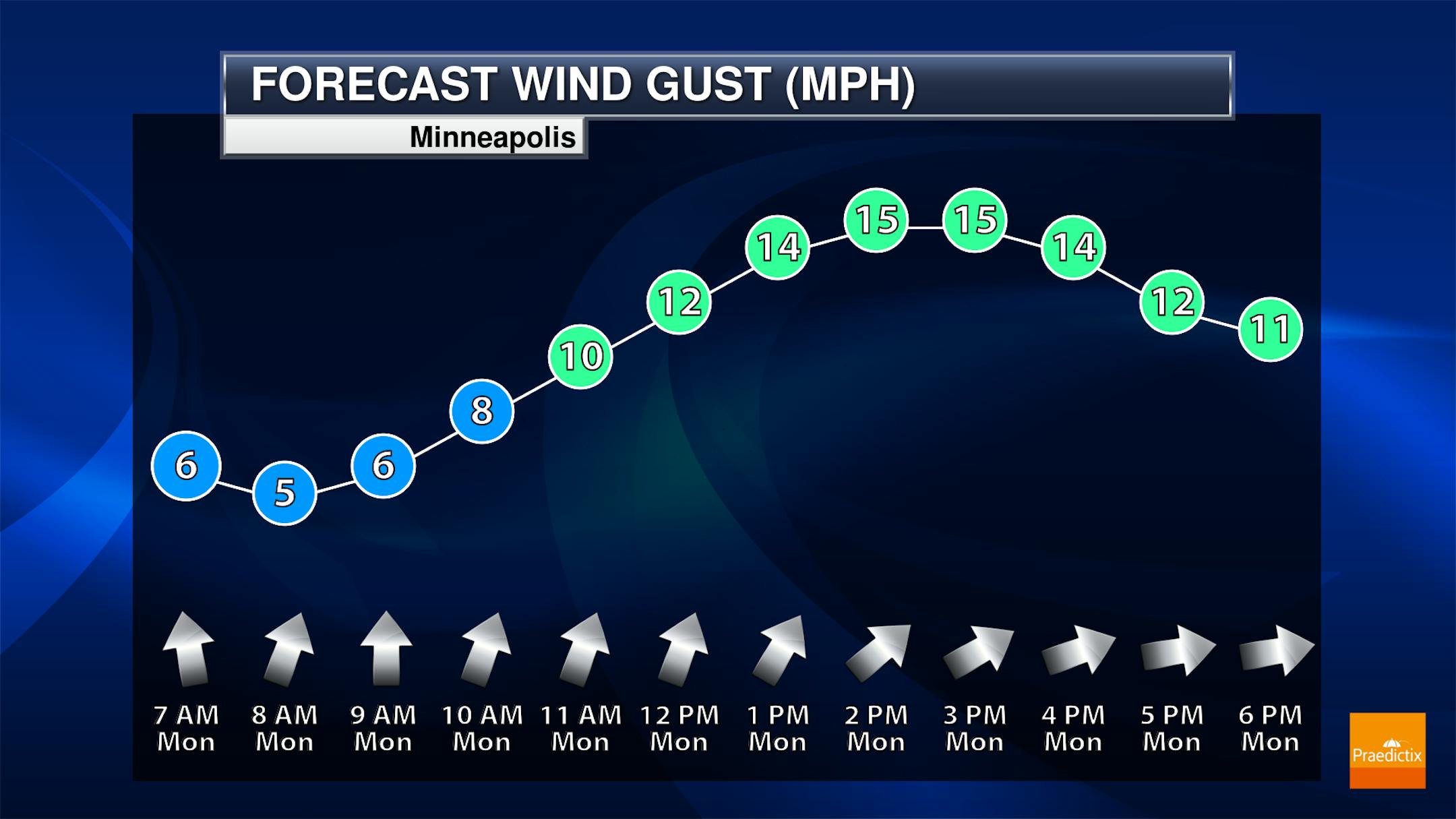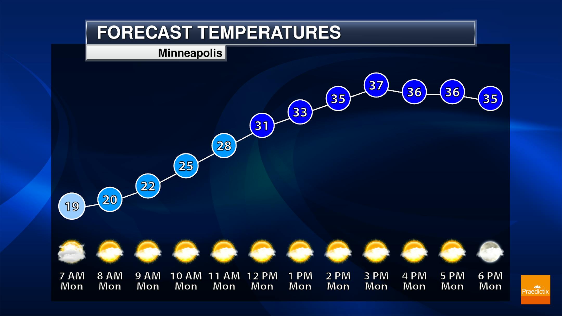 The hourly temps for Minneapolis on Monday show temps starting around 20F in the morning and topping out in the mid/upper 30s by the afternoon. West to southwesterly winds will blow around 15mph through the day.
