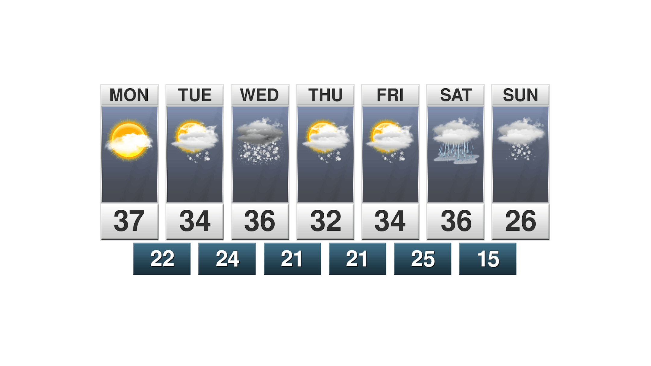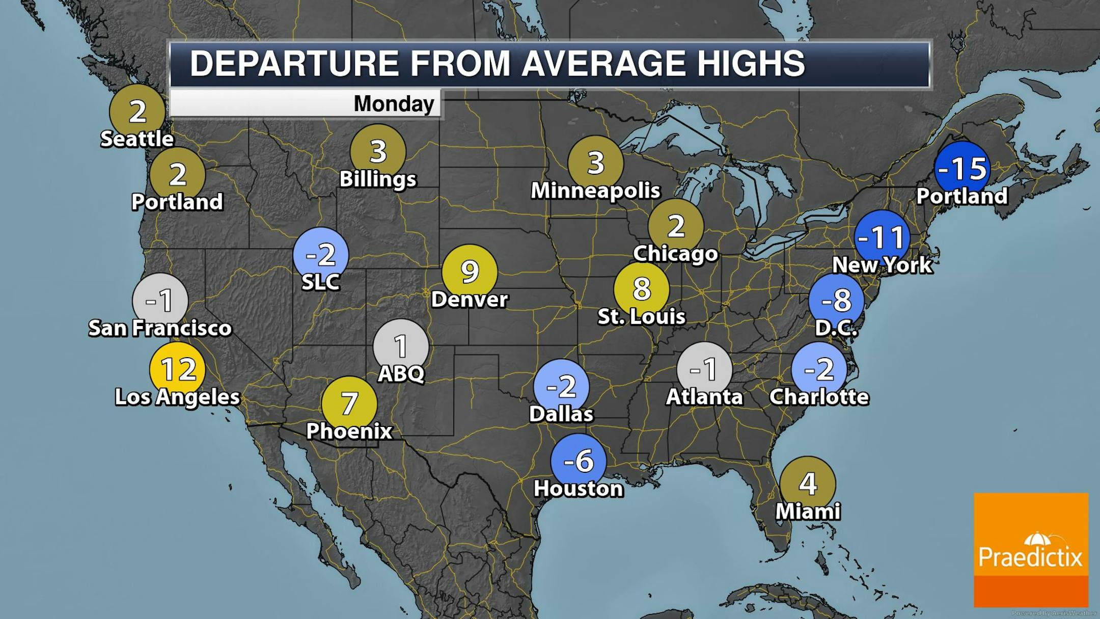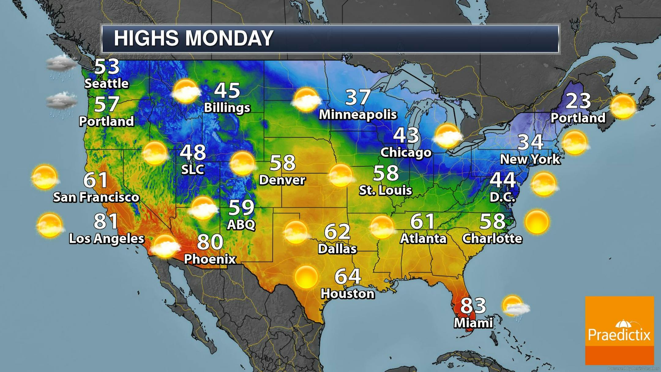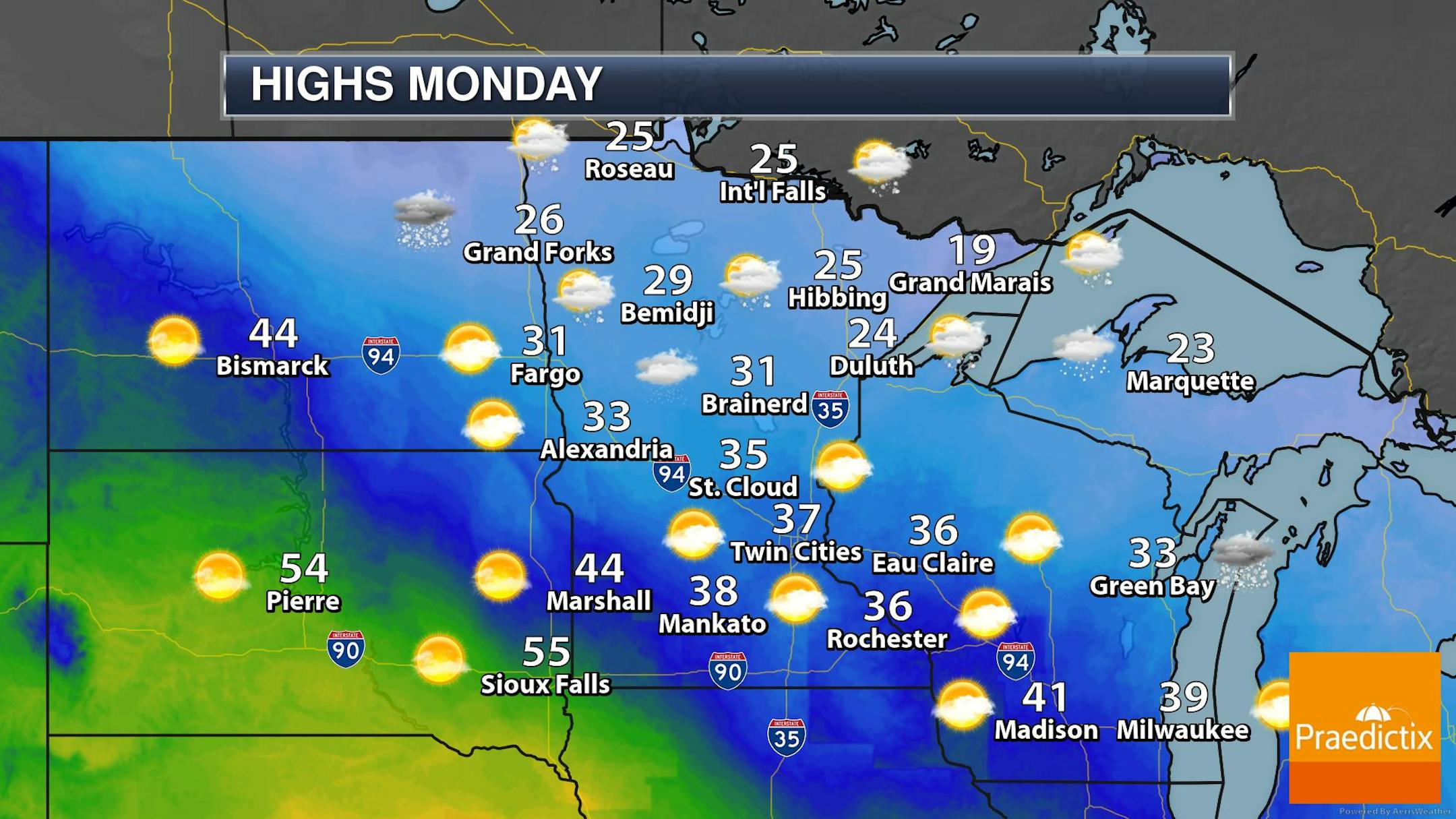 Monday temperatures will be close to average in the central part of the state, but there will be lingering chilly temps in the Northeast with highs running nearly -10F below average. Highs in the southwestern part of the state will be much warmer with temps approaching the 50F mark by the afternoon.