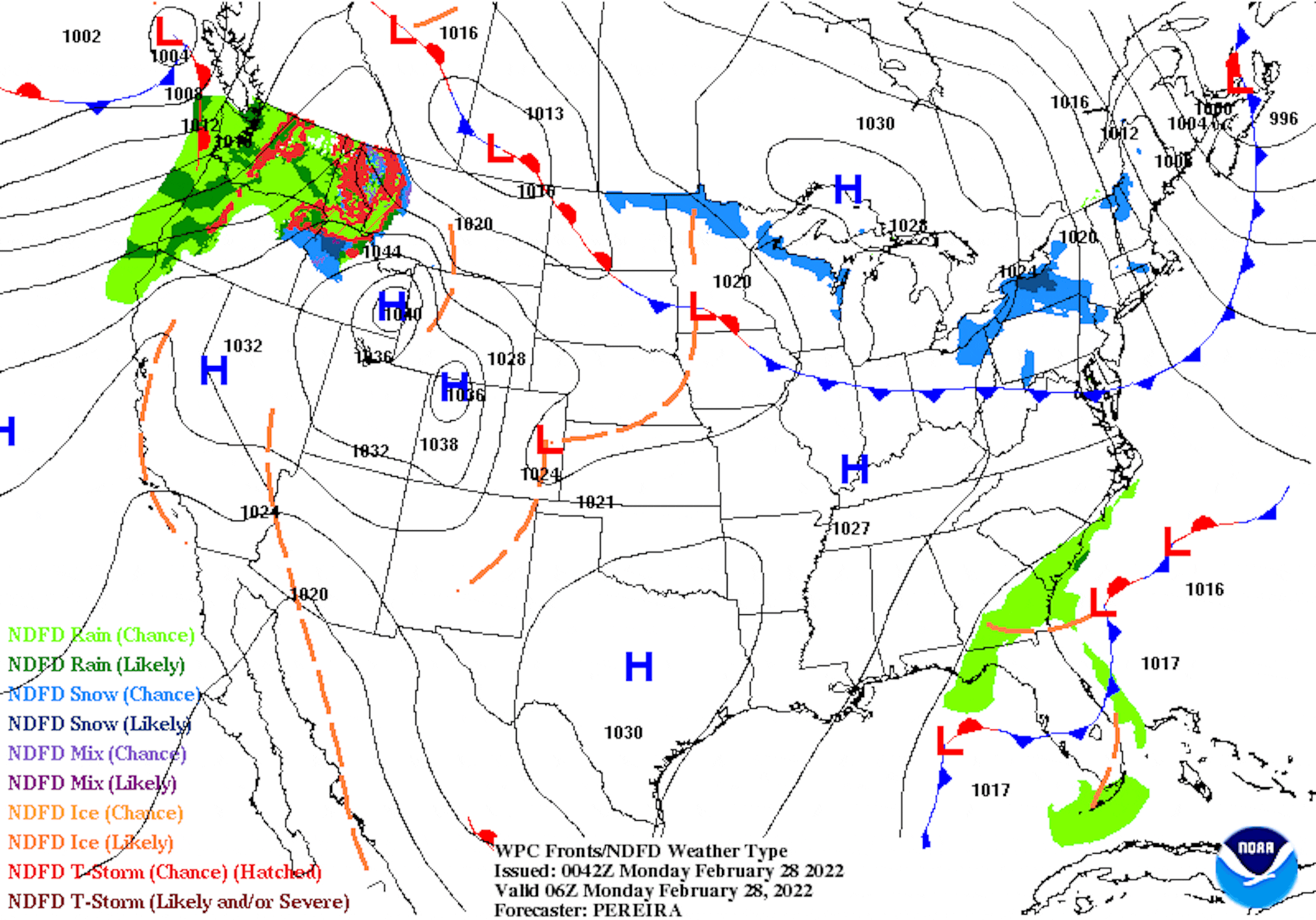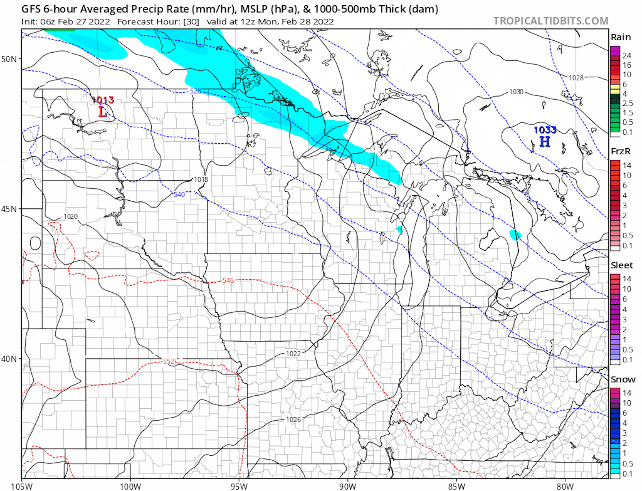 The weather outlook for Minneapolis on Monday shows quiet weather in place for the last day of February. Highs will warm into the mid/upper 30s with partly cloudy skies in the afternoon.