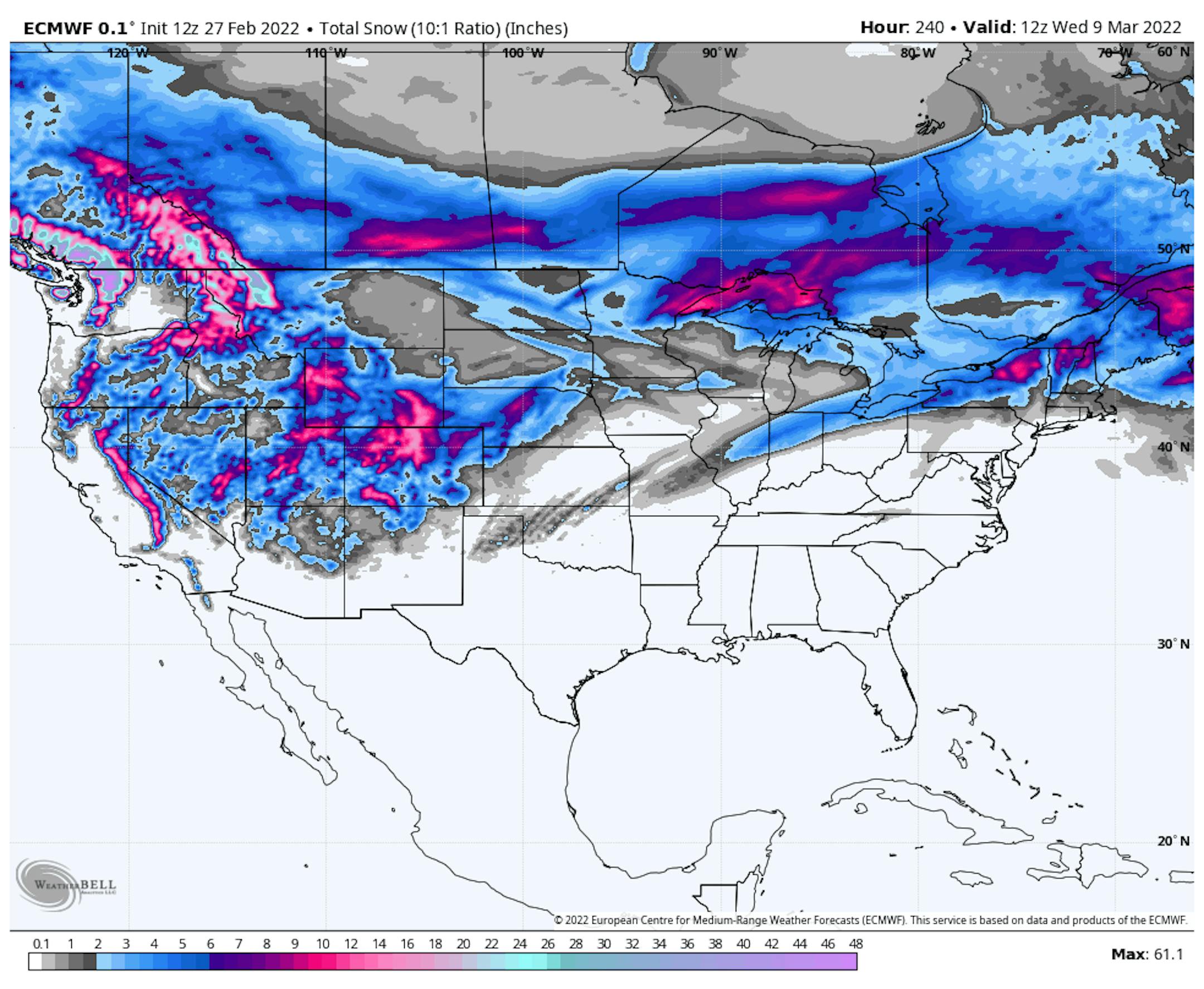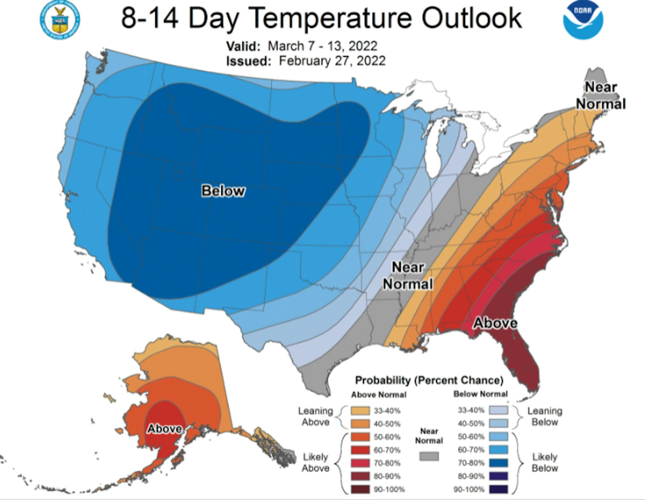 According to the ECMWF & GFS extended temperature outlook, readings will be quite a bit warmer than they were at the end of February. There appears to be a string of 20s and 30s with a couple of near 40F highs possible.