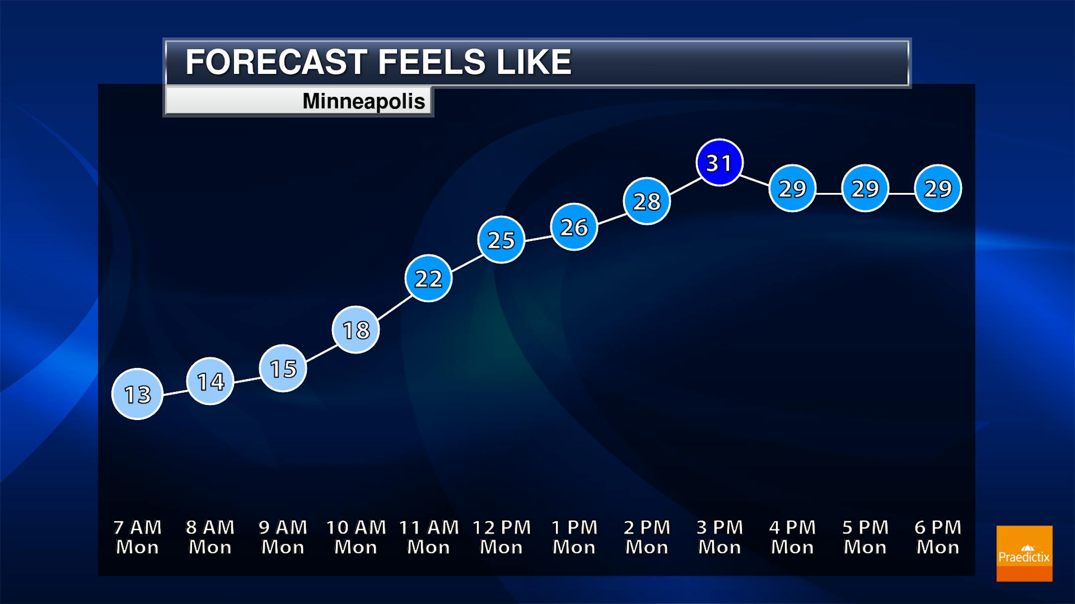 Feels like temps for Minneapolis on Monday will be in the 10s in the morning, but will warm to near the freezing mark by the afternoon.