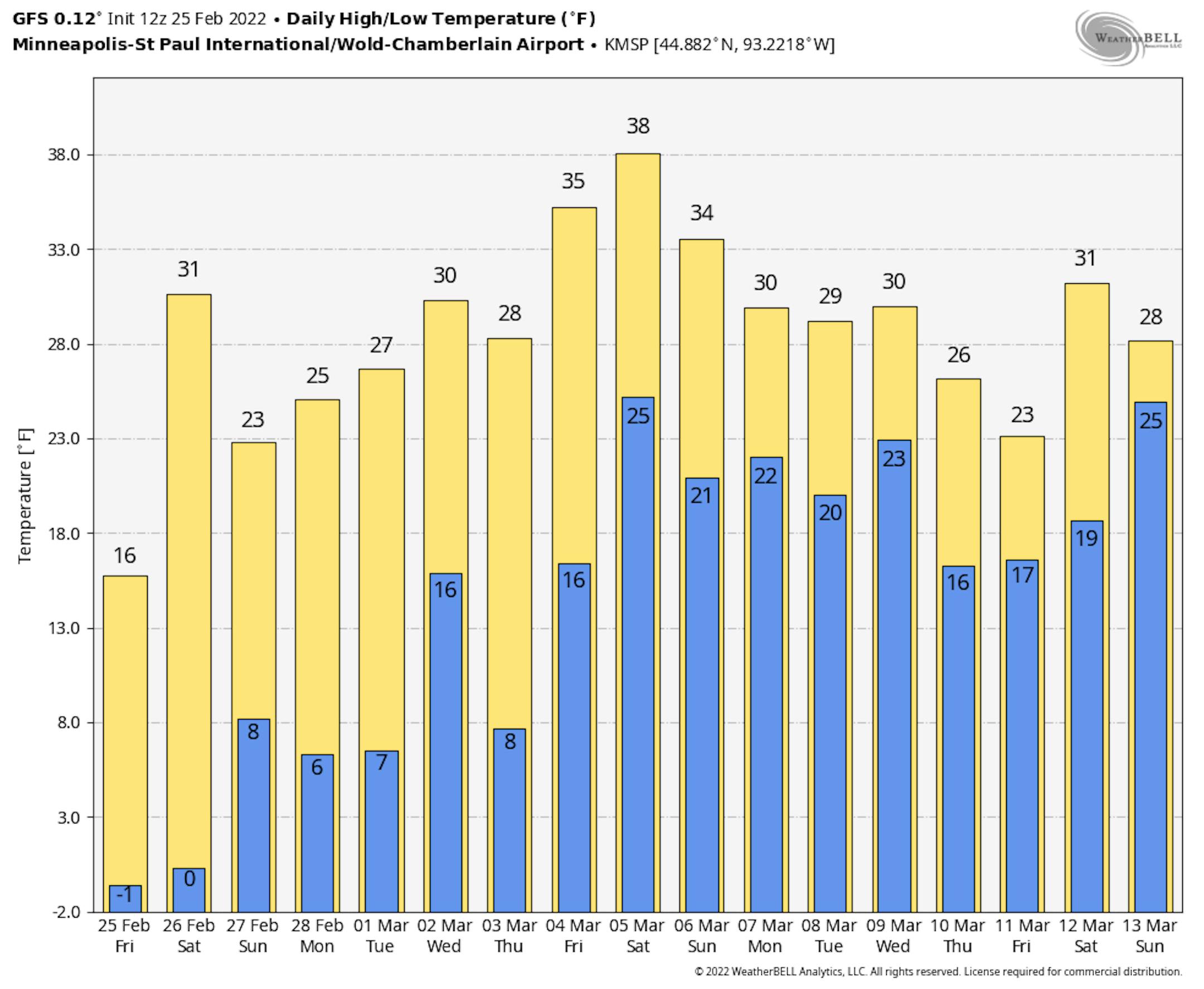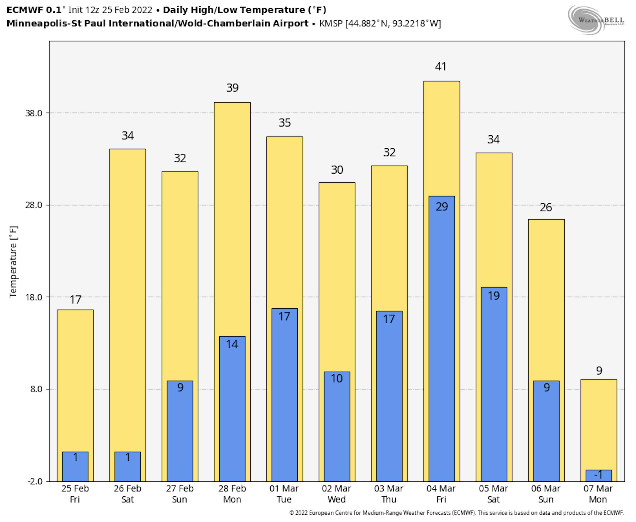 The extended temperature outlook for Minneapolis over the next several days shows near average temps over the next several days with highs warming into the 30s.
