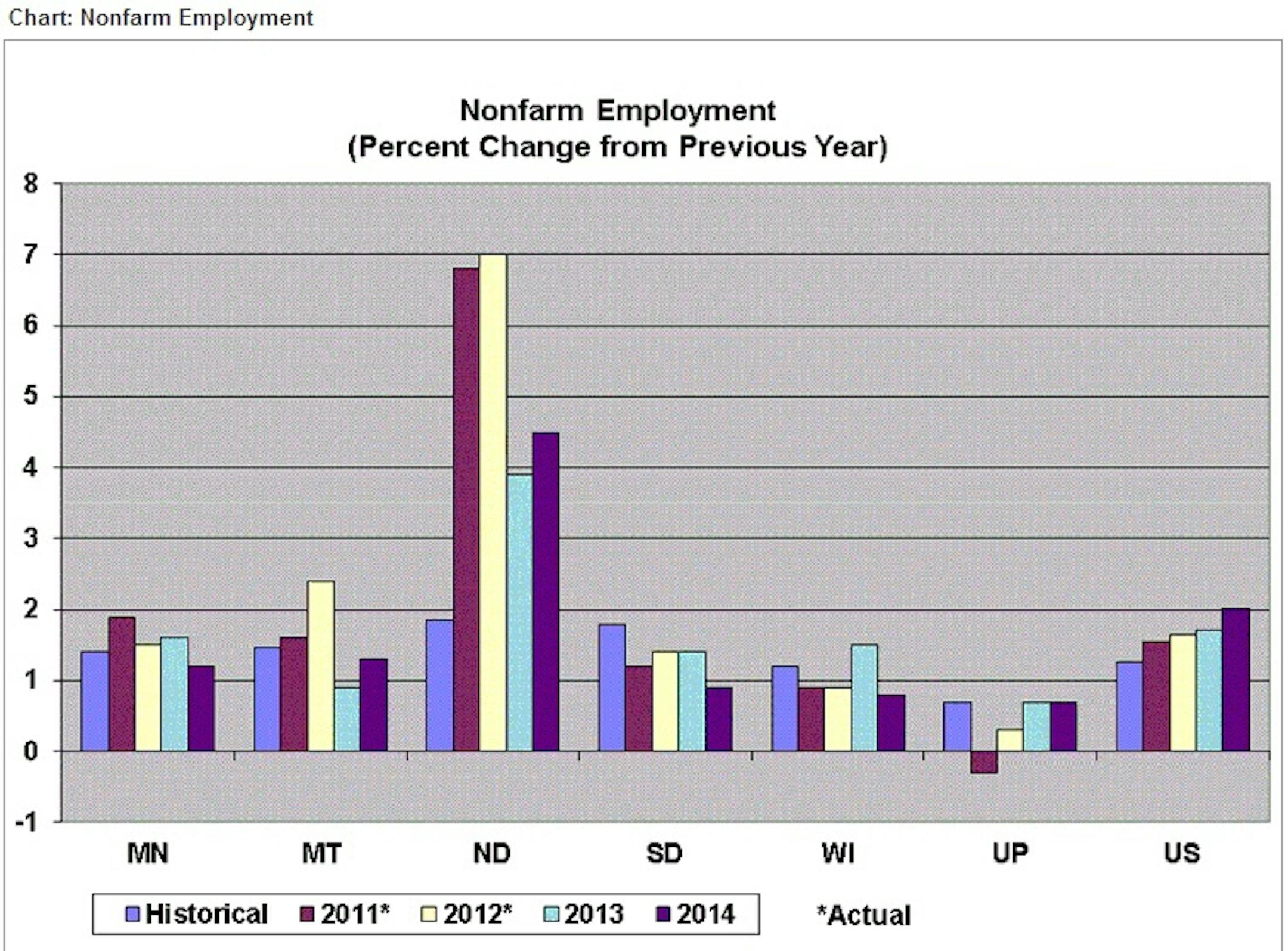 The projection for most states in the Ninth District of the Federal Reserve is slower job growth than the national average. The one exception is North Dakota, which is projected to add jobs at a 4.5 percent growth rate, and where the Fed expects unemployment to fall to 2.3 percent.