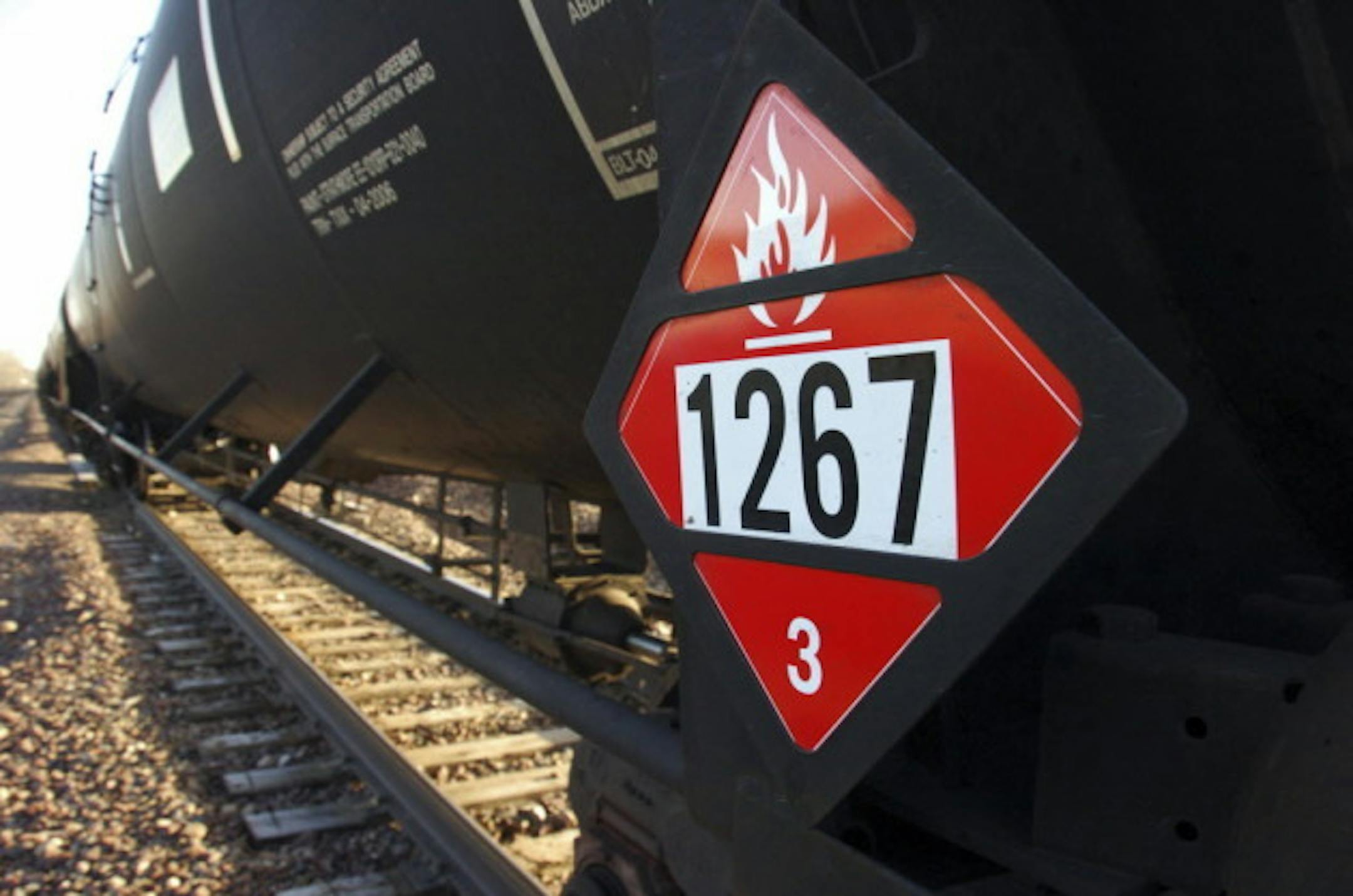 Above: Placard on an oil tank car in North Dakota, 2013/Associated Press file photo by Matthew Brown