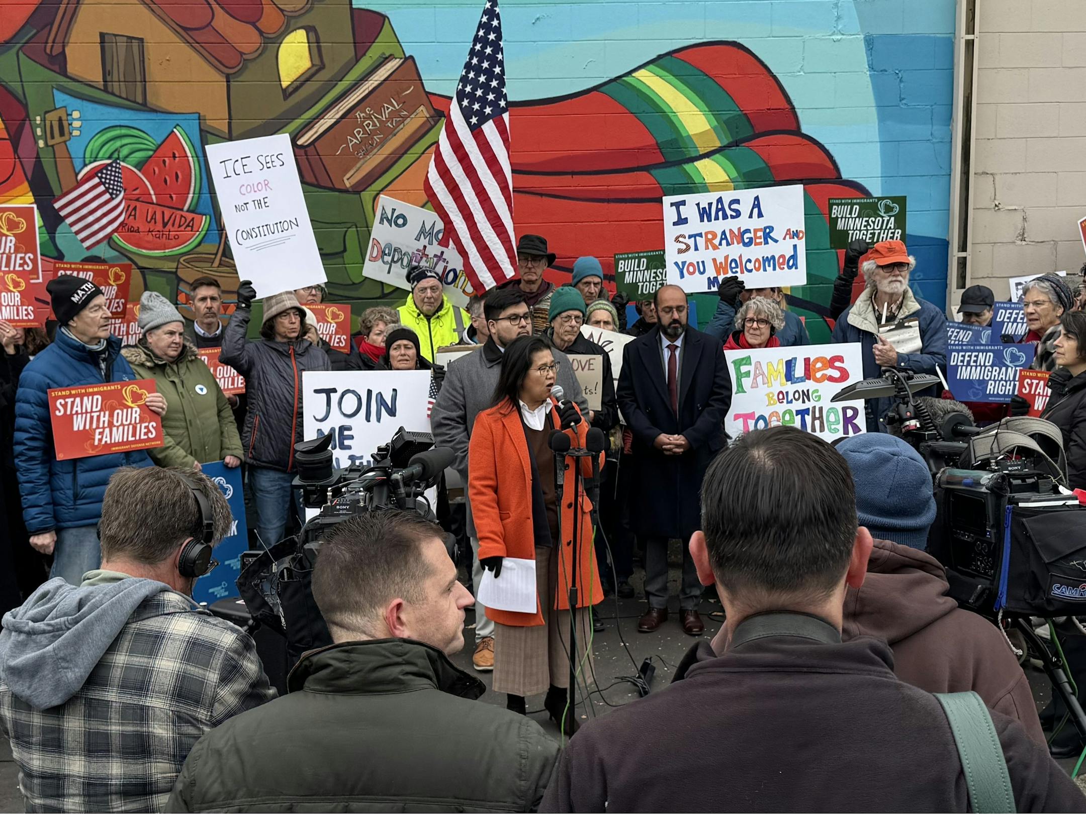 On Wednesday morning, St. Paul Mayor-elect Kaohly Her joined a crowd of close to 200 community members and advocates at a vigil outside of the Bro-Tex Inc. warehouse, where federal agents arrested an unspecified number of workers Tuesday morning. The crowd on Wednesday held signs that read “Families belong together” and “ICE sees color, not the constitution.”