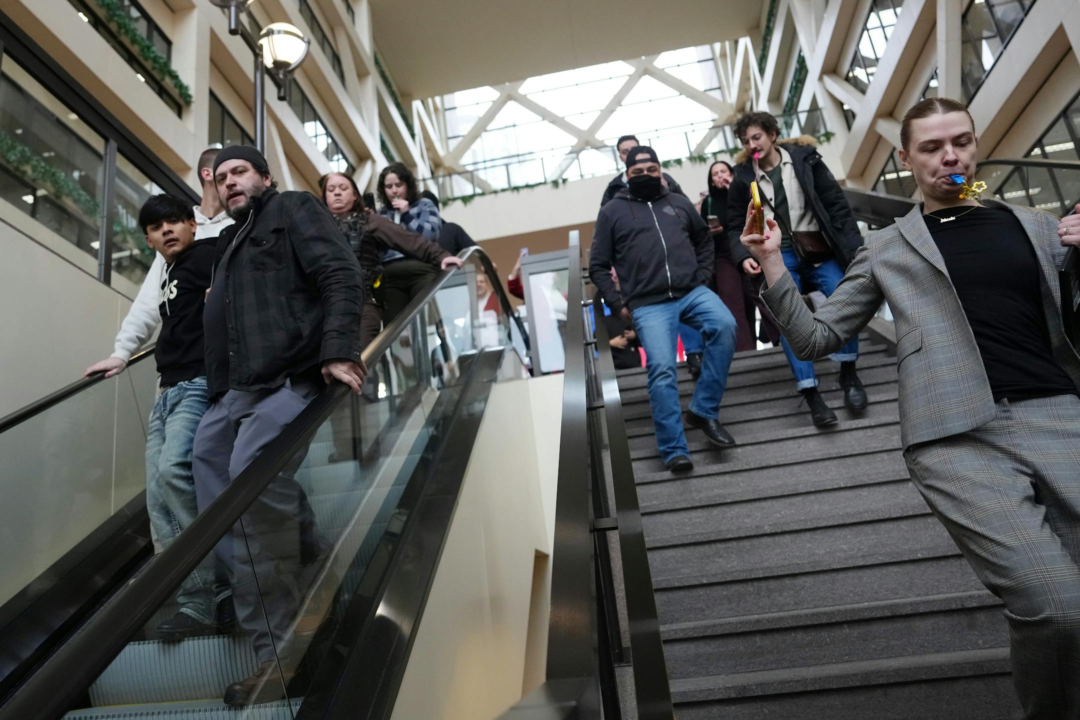 At 11:45 a.m., a young man, later identified as Junior de Jesus Herrera Berrios, an 18-year-old from Burnsville, sprinted through the lobby with federal agents on his heels. He went around a large, shallow fountain in the center of the lobby. Two of the agents, who had been waiting in the lobby, closed off his path and slammed Herrera Berrios to the ground and pinned him against the marble base of the fountain. A crowd of approximately two dozen people swarmed the officers while whistles and screams echoed through the building and curses were hurled at the officers. The officers handcuffed Herrera Berrios and propped him up on his feet.