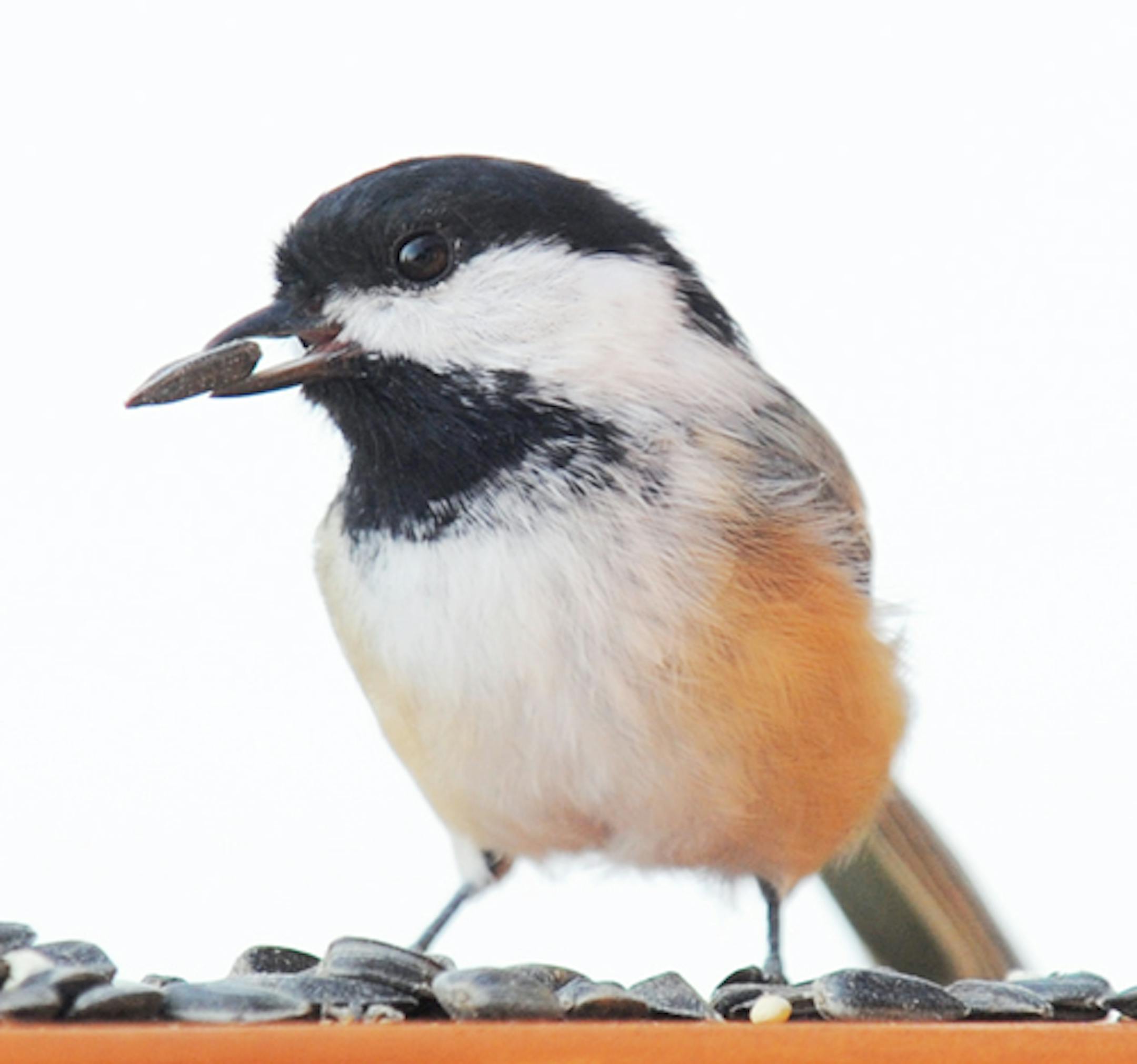 Below, a Black-capped Chickadee with a black oil sunflower seed, probably a small, thin one.