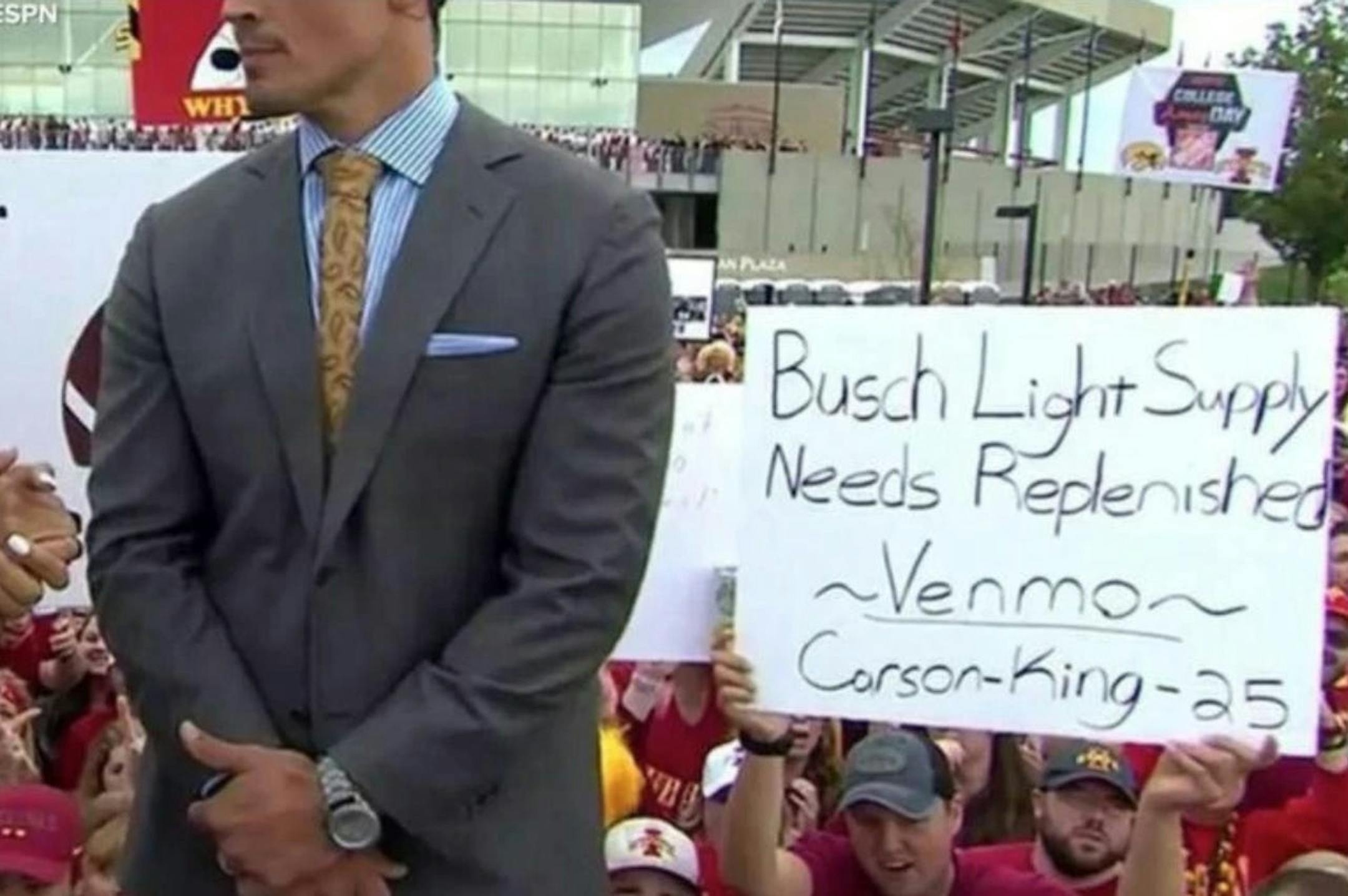 Carson King, an Iowa State fan, held up a sign that said his Busch Light supply needed to be replenished and included his Venmo account information for people to send him money. And … people took him seriously — so seriously that more than $1 million has poured into his account.