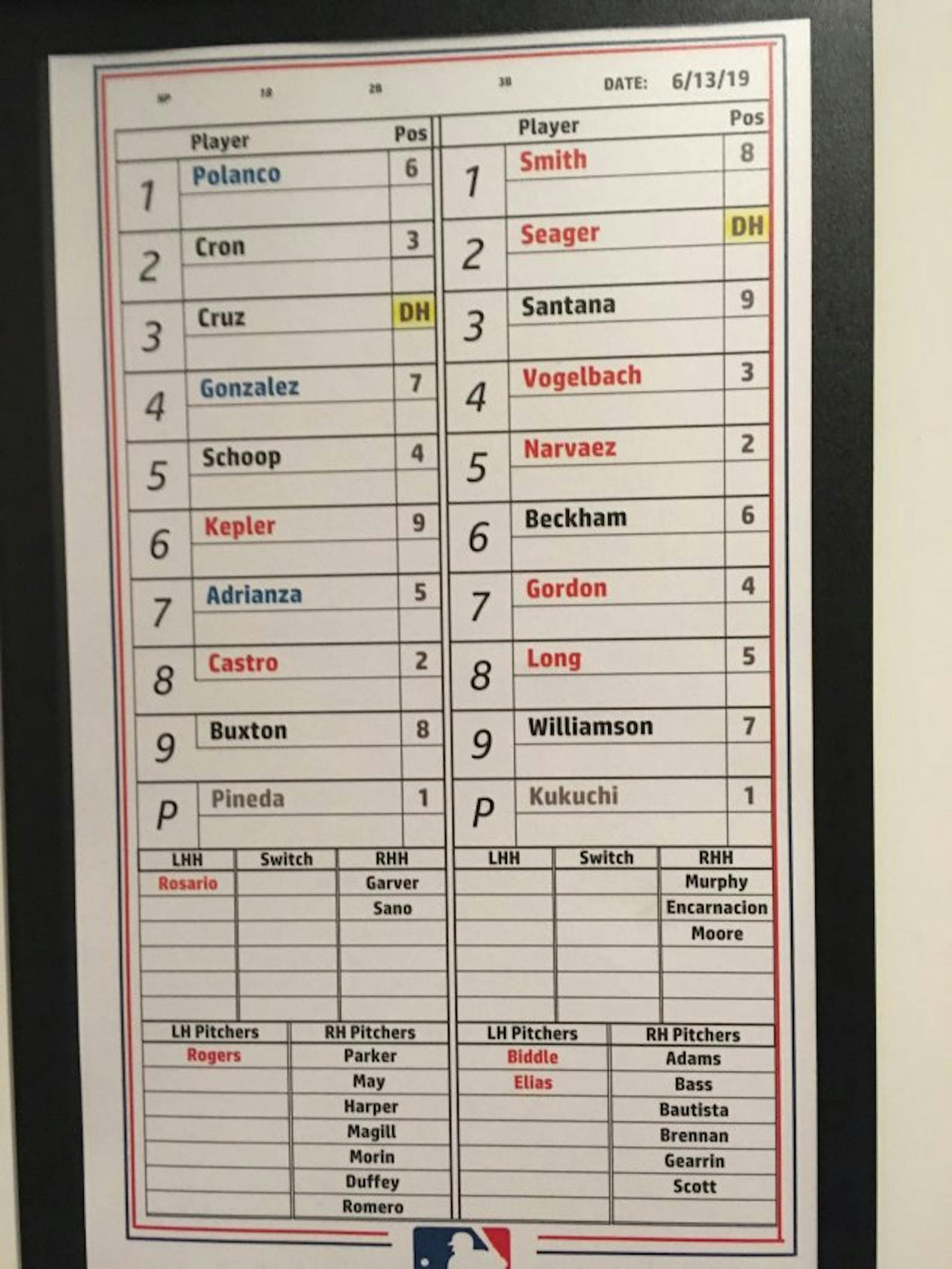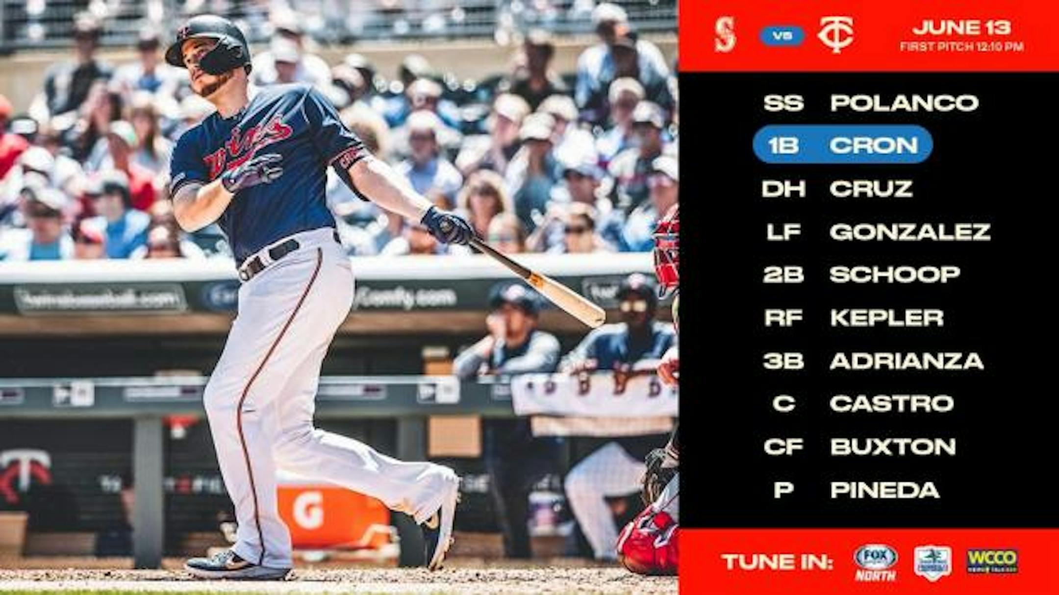 Here is the Twins lineup, with C.J. Cron moving to second in the order. Miguel Sano is out of the lineup, and Ehire Adrianza will play third.