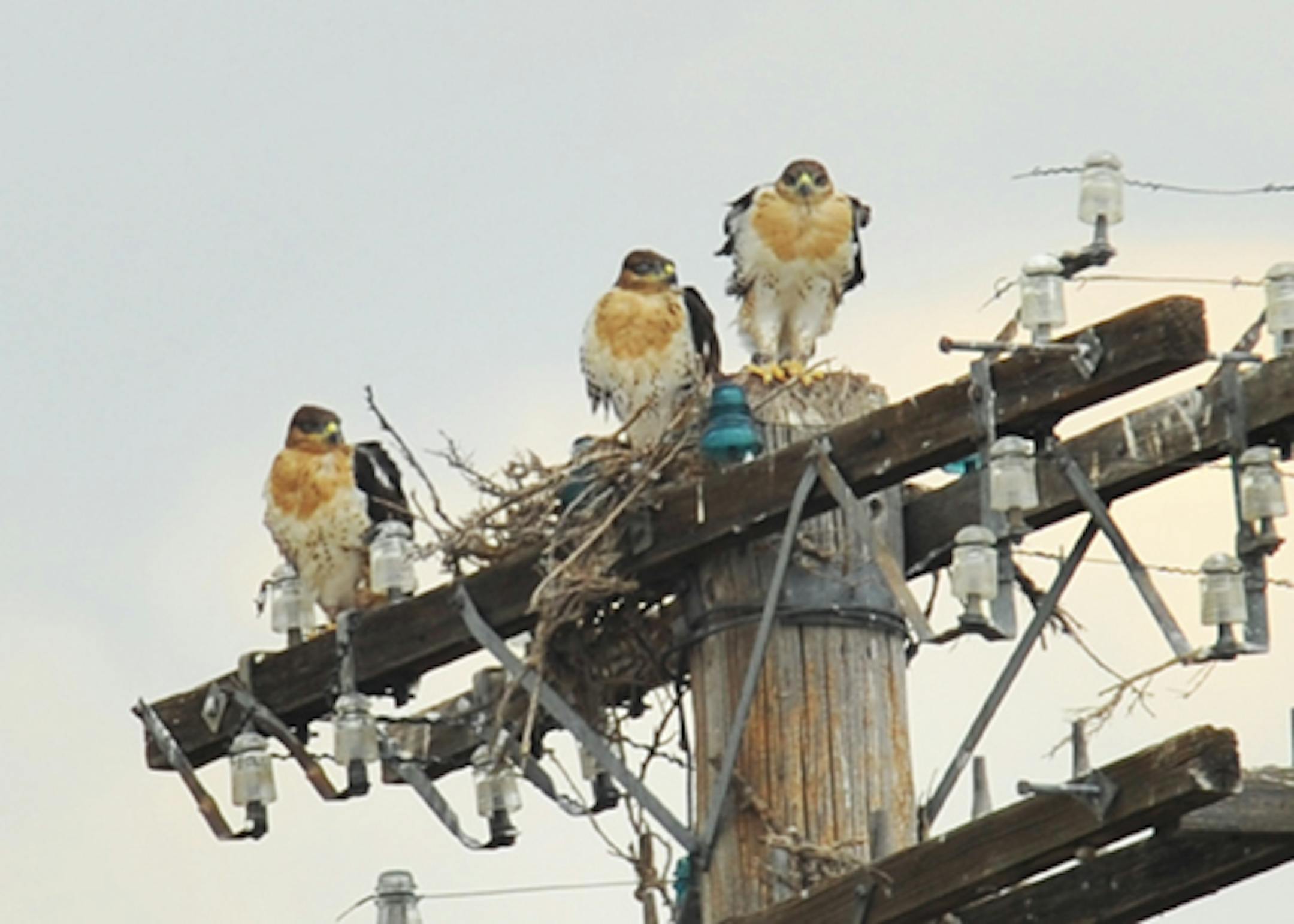 Seeing birds not usually seen in Minnesota is one of the pleasures we -- Jude and I -- enjoy when we travel west. A few days ago in Wyoming, on a beautiful drive from Laramie to Casper, we found a power-pole nest containing three young Ferruginous Hawks. If they hadn't fledged they were very close to it. The nest was ragged, no doubt reflecting the movements of three large fledglings. The post was 80 yards beyond that usual fence that borders highways. I took photos from the fence. Two minutes into shooting, two adult Ferruginous Hawks appeared from nowhere, flying directly to the nest from some distant point, circling above me as I worked. The young birds stayed put, watching me closely.
