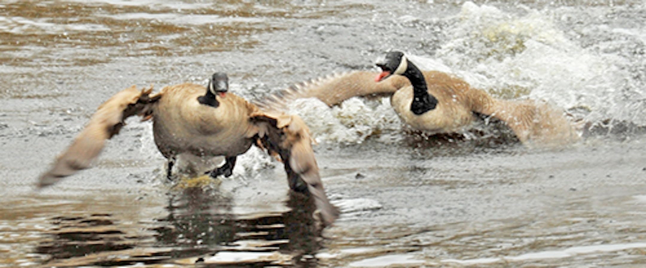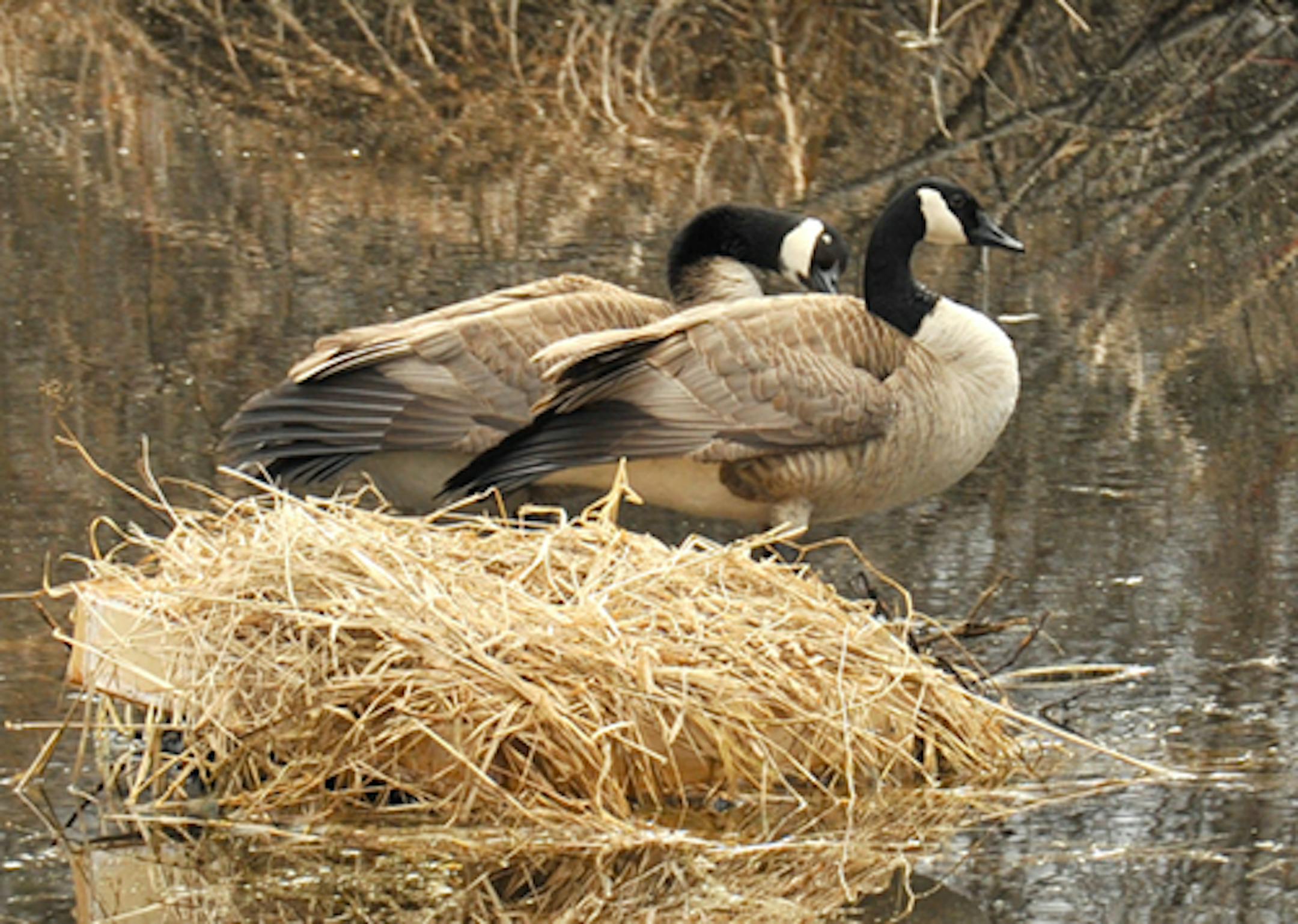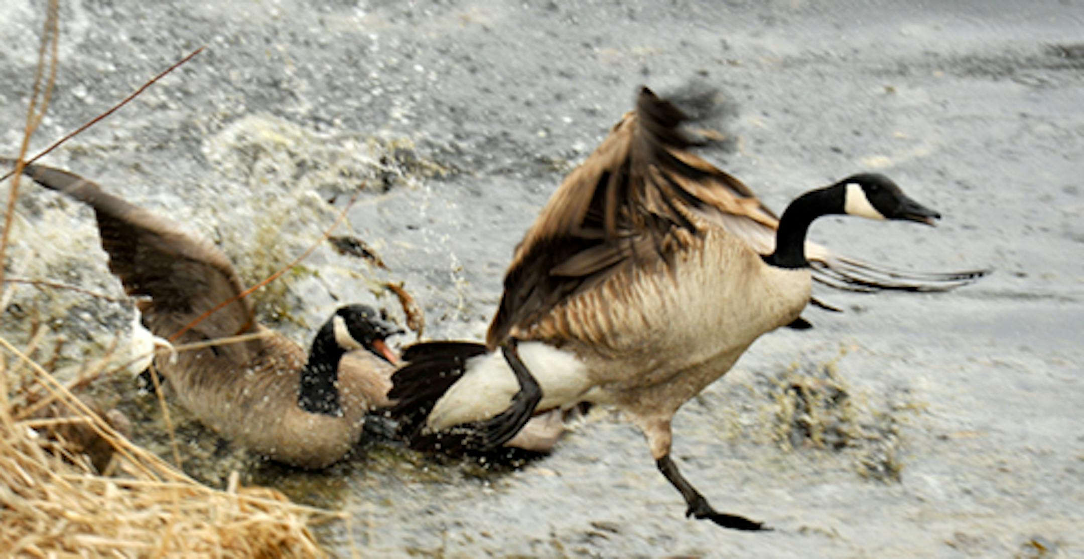 Before the ice was off the small pond in our backyard a pair of Canada Geese showed interest in nesting here. Geese have nested on the pond in previous years. As soon as I had open water I did some repair work to the floating nest platform. The pair appeared to be settling in. Yesterday (Wednesday) a second pair of geese arrived. The fight between goose couples began at 3 o'clock in the afternoon. The main event lasted an hour, not that they stopped then. I heard and watched them at 11 p.m., and at 1:15 and 3 in the morning. It's now 10:45 in the morning, and the squabbling continues into its 20th hour. We're down to verbal exchanges, a big difference from the loud, serious, physical encounters earlier. We had chasing, biting, attempts at dunking, and much flapping of those large wings. The pairs worked together. They fought mostly on the water, but occasionally in our yard. They stopped fighting now and again for intense preening. All feathers in place once again, it was back to the battle. The resident pair has spent some time on the nest platform; I assume they are and will be the winners, although the challengers remain at the edge of the pond. It was a great photo op. (Addendum: at 6 p.m. Thursday both pair remain at the pond, awake after naps on the sun, back on the honk.)