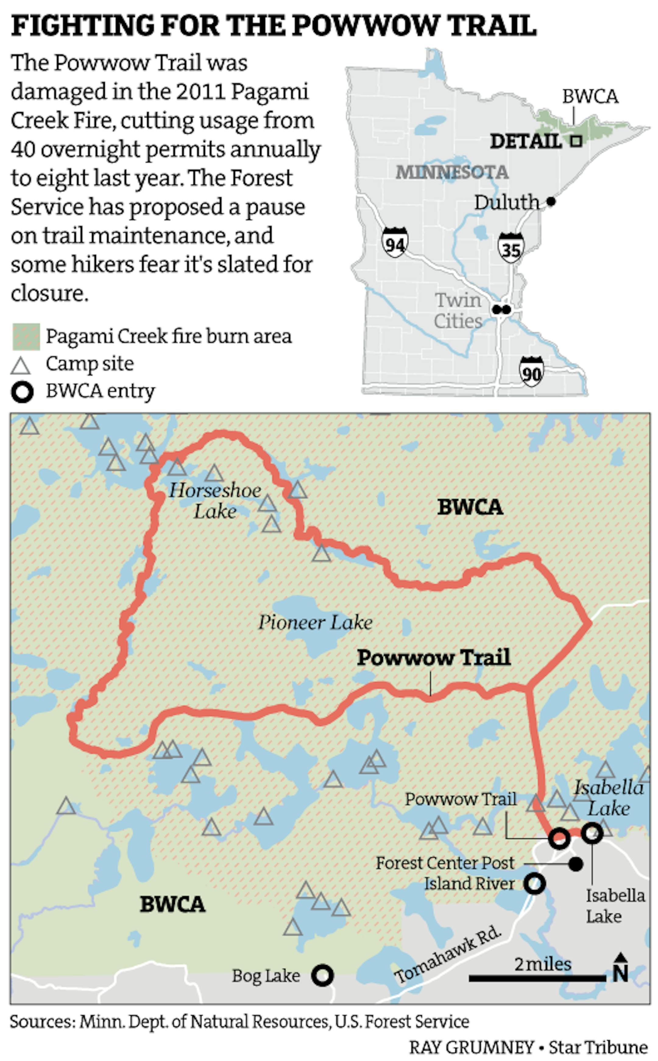 The Powwow Trail was damaged in the 2011 Pagami Creek Fire, cutting usage from 40 overnight permits annually to eight last year. The Forest Service has proposed a pause on trail maintenance, and some hikers fear it's slated for closure.