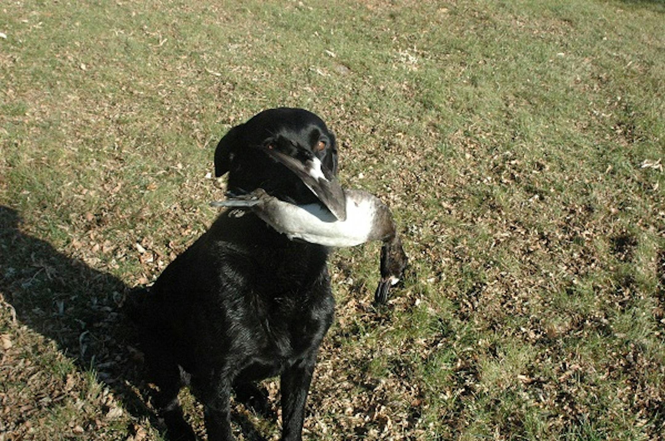 Most of the ducks were bufflehead which we passed on because of their questionable table fare. But the odd small flock of bluebills, and they were the greater scaup variety, made for a brief but productive shoot. Mallards that actually decoyed told us they weren't locally raised. And we'll be confirming that because one carried a U.S. Fish and Wildlife band. The downside of the hunt was the ice made dog work impossible thereby precluding a major pleasurefor me. But Doc took great joy in posing with a boat-retrieved duck.