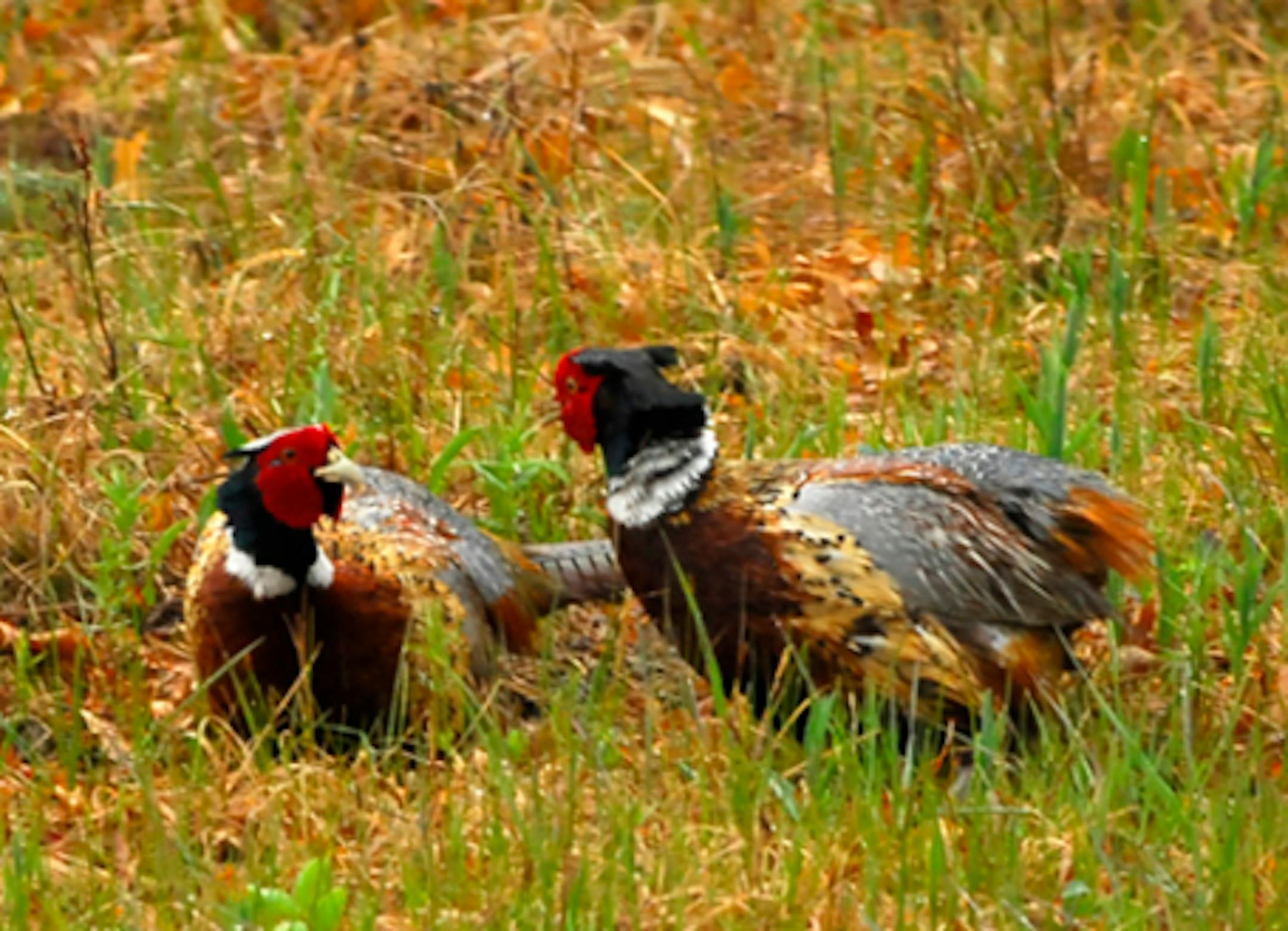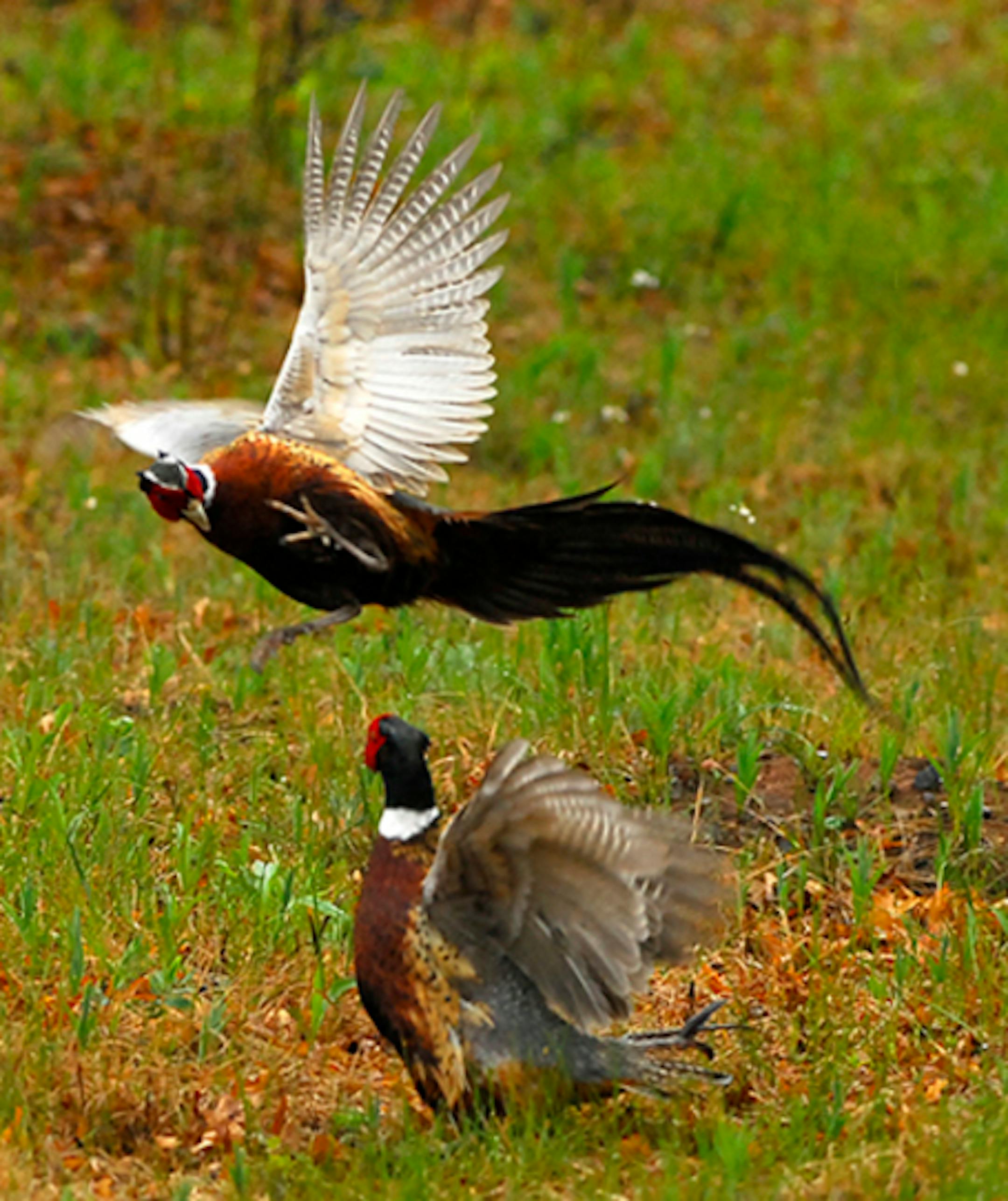 Birding in the rain at Crex Meadows (Grantsburg, Wis.) today we found a pair of roosters Ring-necked Pheasants fighting. It's that season. First, make war. Then, the victor makes pheasant love. The birds cirlced each other slowly, like boxers. Then, one would leap and strike. I've never seen these birds battle before, but I have seen the spurs they carry on what passes for bird ankles. They look like deadly weapons. These birds struck at each other and wrestled five times before one decided to call it quits.