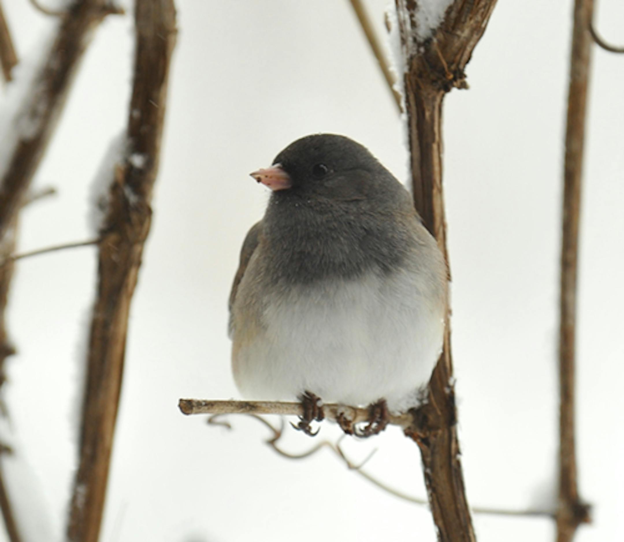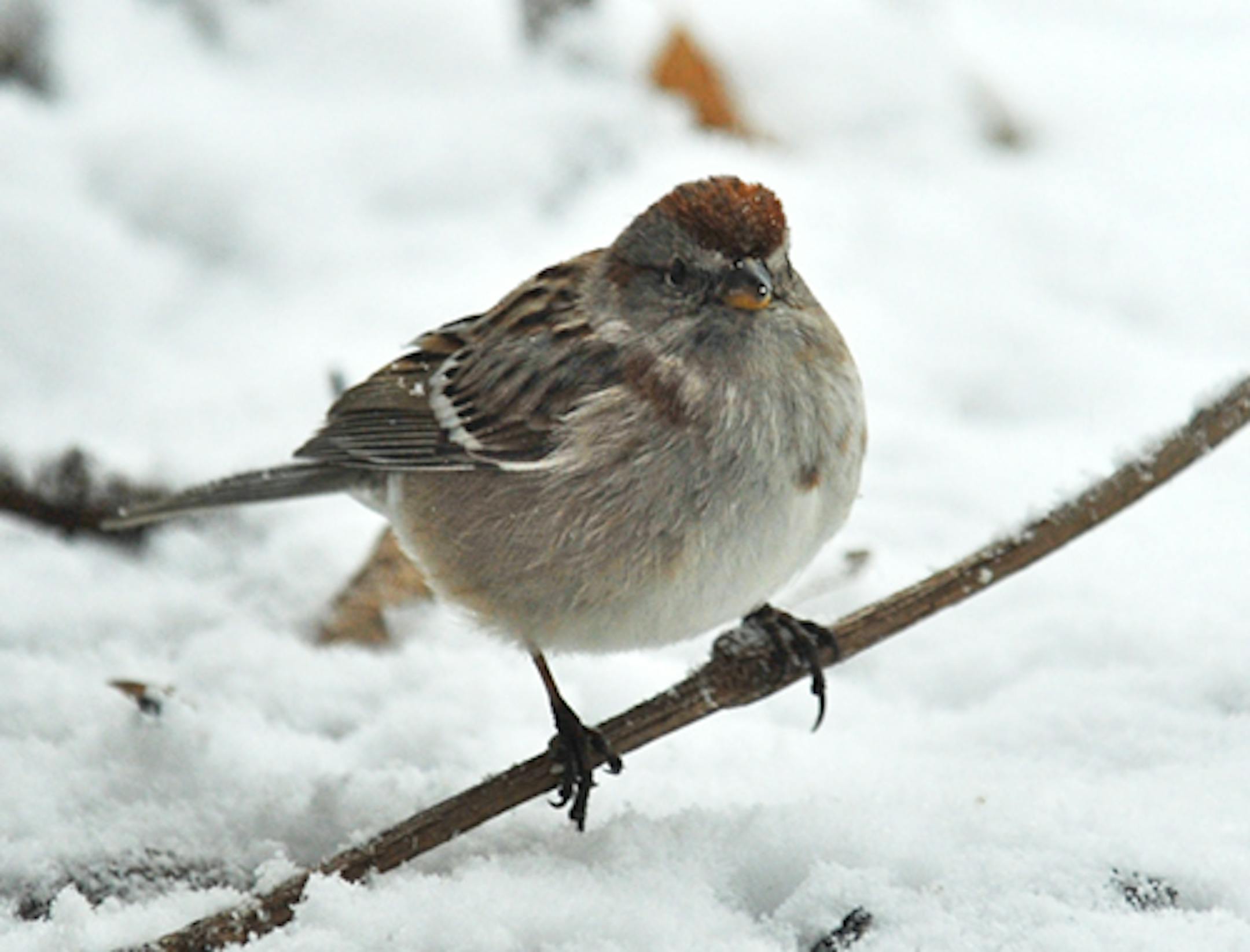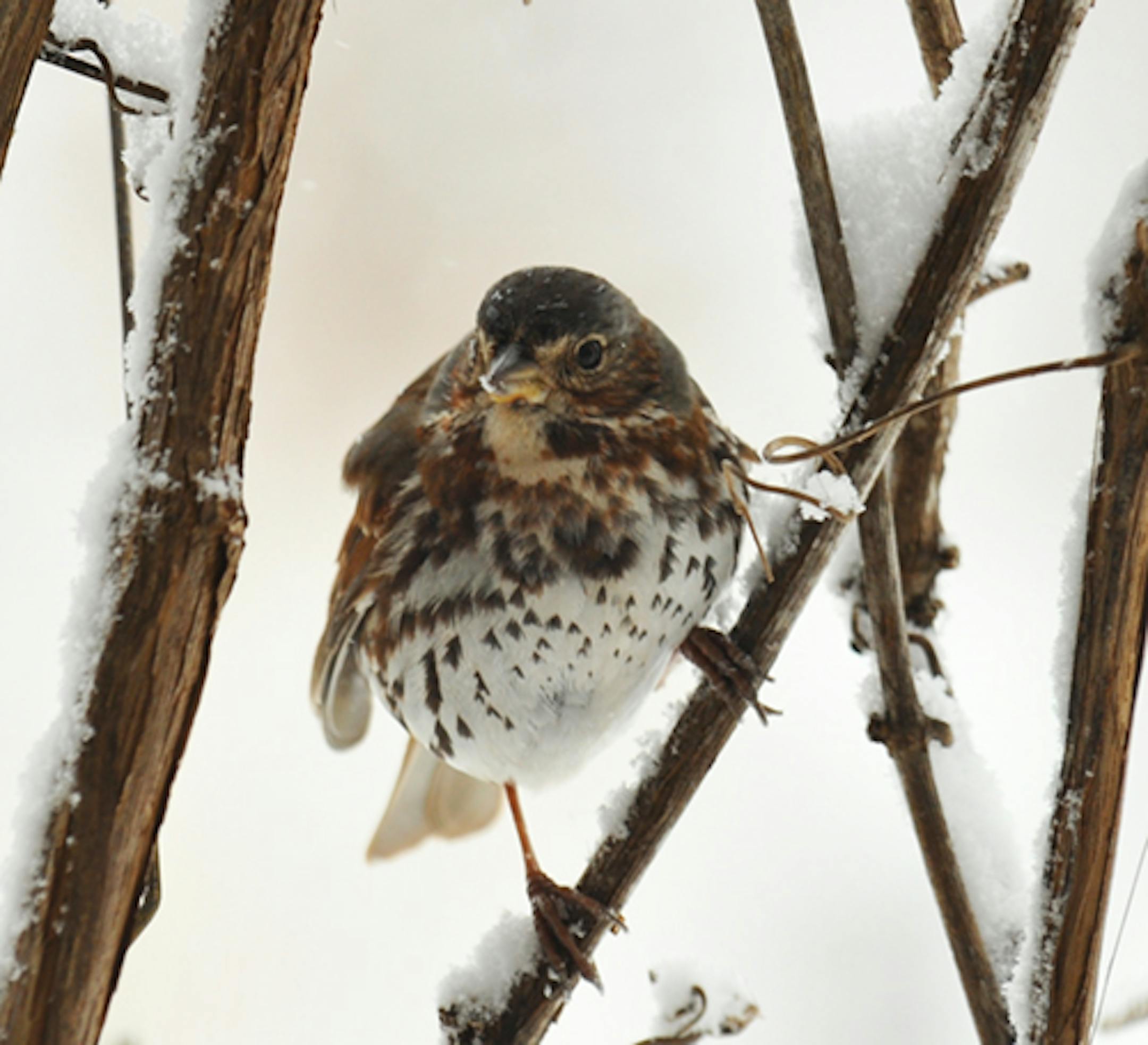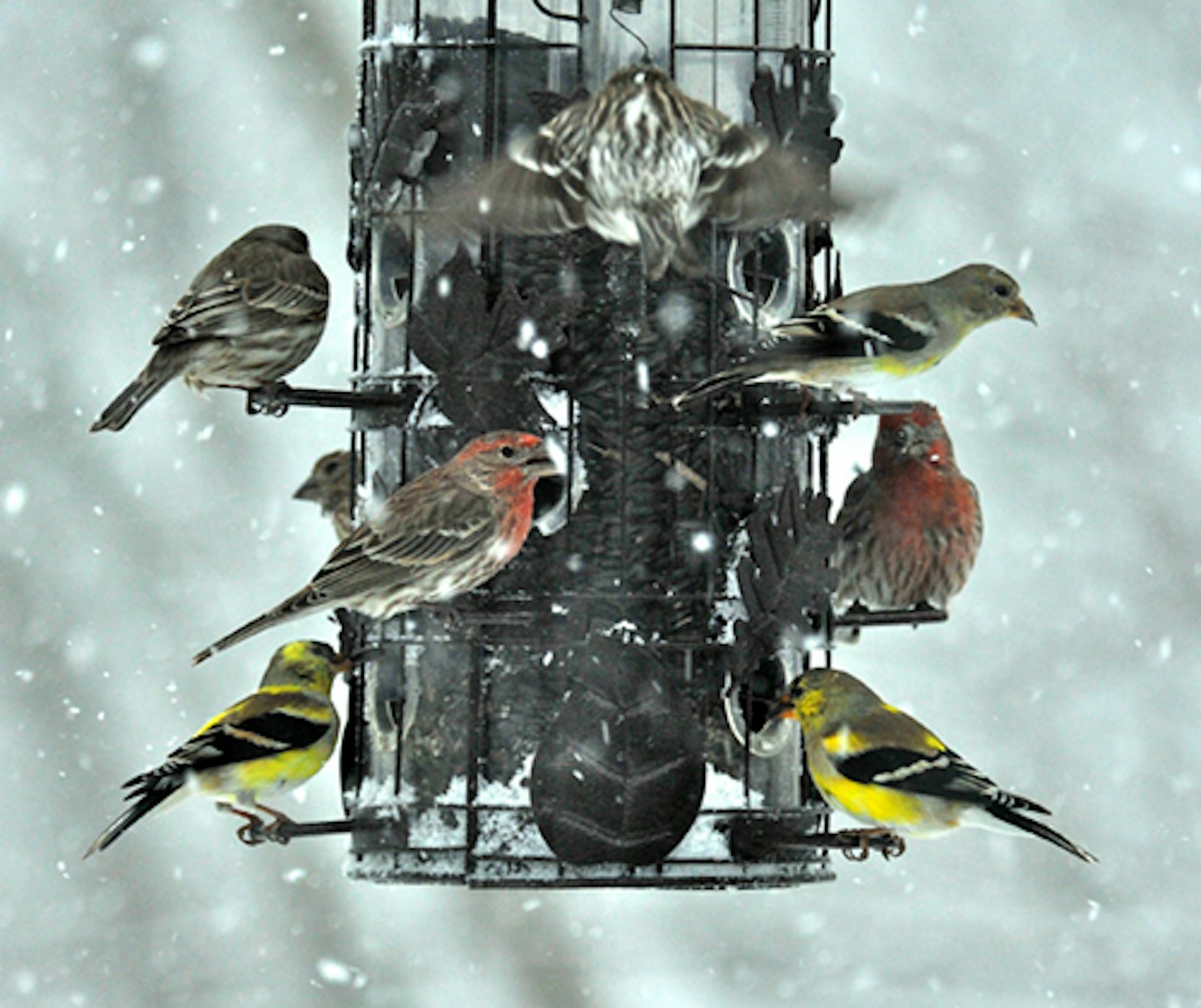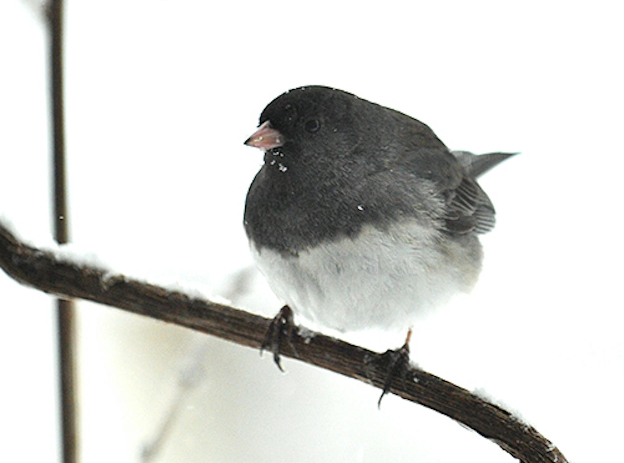 This is Thursday afternoon, the heavy snow of this morning pausing or passing. It has been the best feeder day of the year. Dozens of birds: Fox Sparrow, Song Sparrow, Tree Sparrow, House Finch, Purple Finch, goldfinch, cardinal, Red-winged Blackbird, chickadee, White-breasted Nuthatch, Common Redpoll, Red-bellied Woodpecker, robin, crow, Blue Jay and Dark-eyed Junco, both the pink-sided and slate-colored subspecies, the two common here. Our usual feeders are busy. I put two pieces of plywood out, one on the deck, another sheltered beneath an overhang. Sunflower chips were scattered there, the board keeping the seed from disappearing in the snow. These spots are busy, too. Keep your feeders full, and clear the snow from trays and feeder ports.