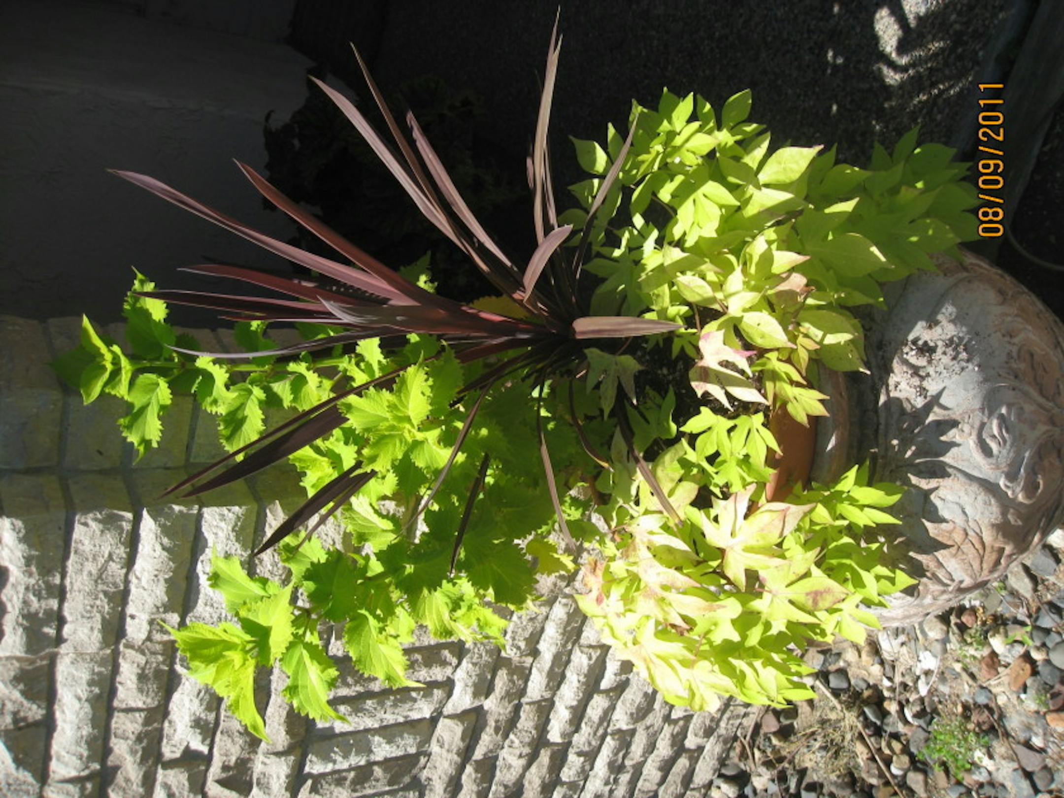 Grumble! The two big urns flanking my front door were just starting to look the way I'd imagined them when I planted them. The sweet potato vine was trailing and curling just so, the coleus and spikes were tall and stately, and the mocha-leaved begonias were blooming brightly.