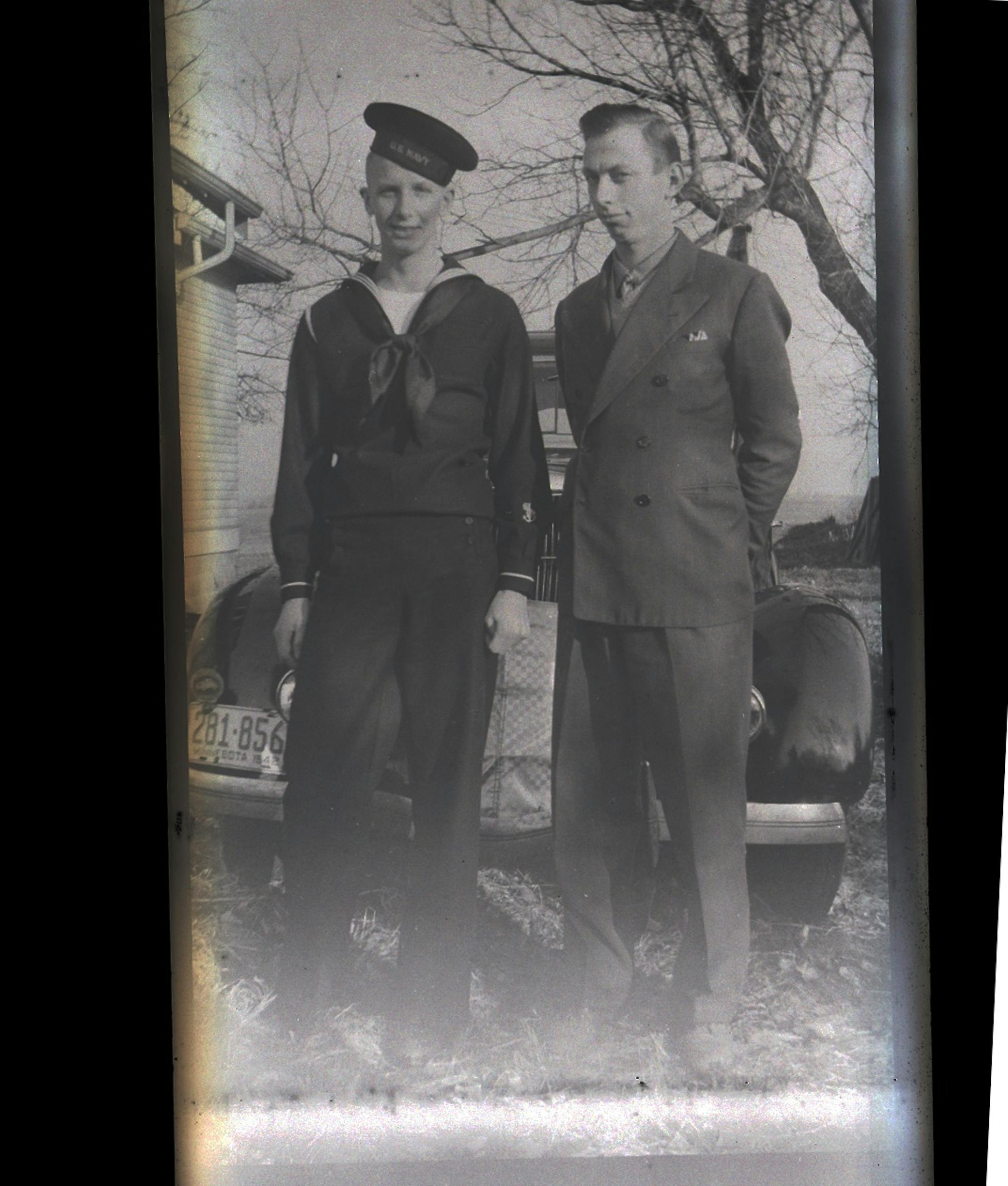 Click. The sailor stands next to another young man with a familial resemblance. Perhaps it's an older brother, looking dapper in a double-breasted suit.