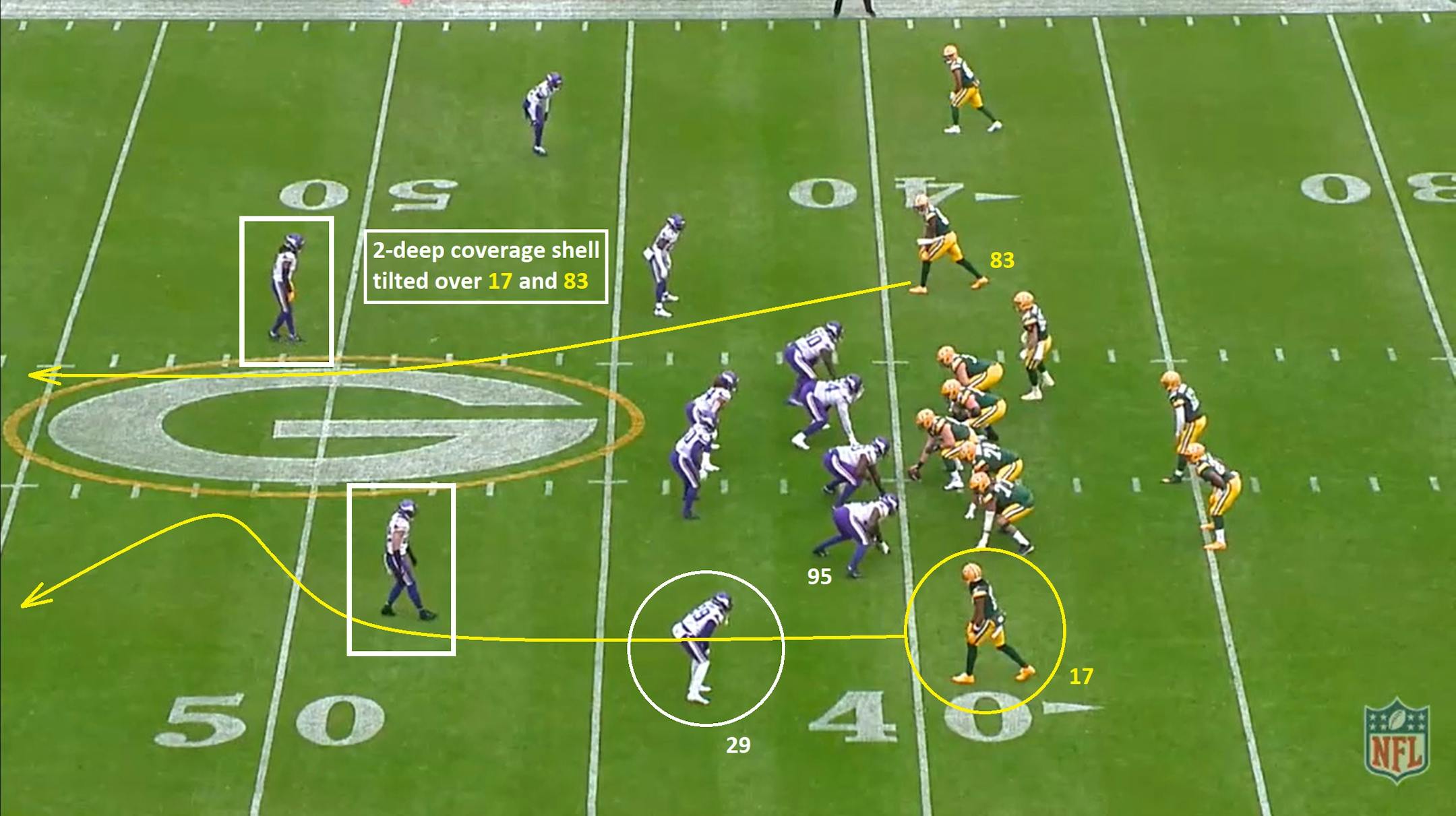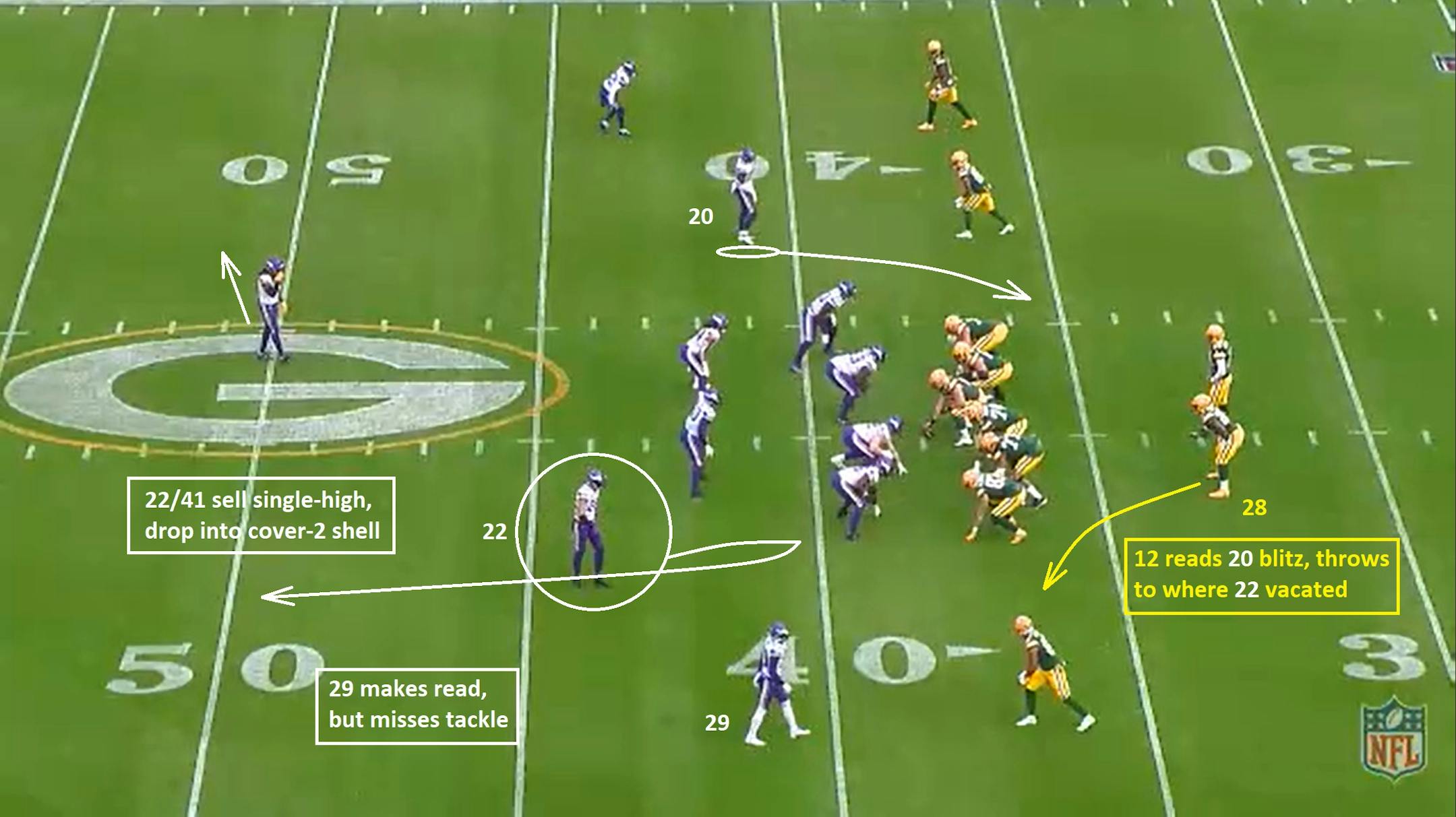 1. Zimmer called a form of two-deep safety coverages on 61.5% of the Packers plays, by my rough count, and leaned on zones, which is a huge contrast to the Week 1 loss when safeties spent a lot of time near the line of scrimmage with a 73% single-high rate. Corners were burned deep. Rodgers threw for 364 yards. Zimmer said he could do a "better job" with the young cornerbacks.