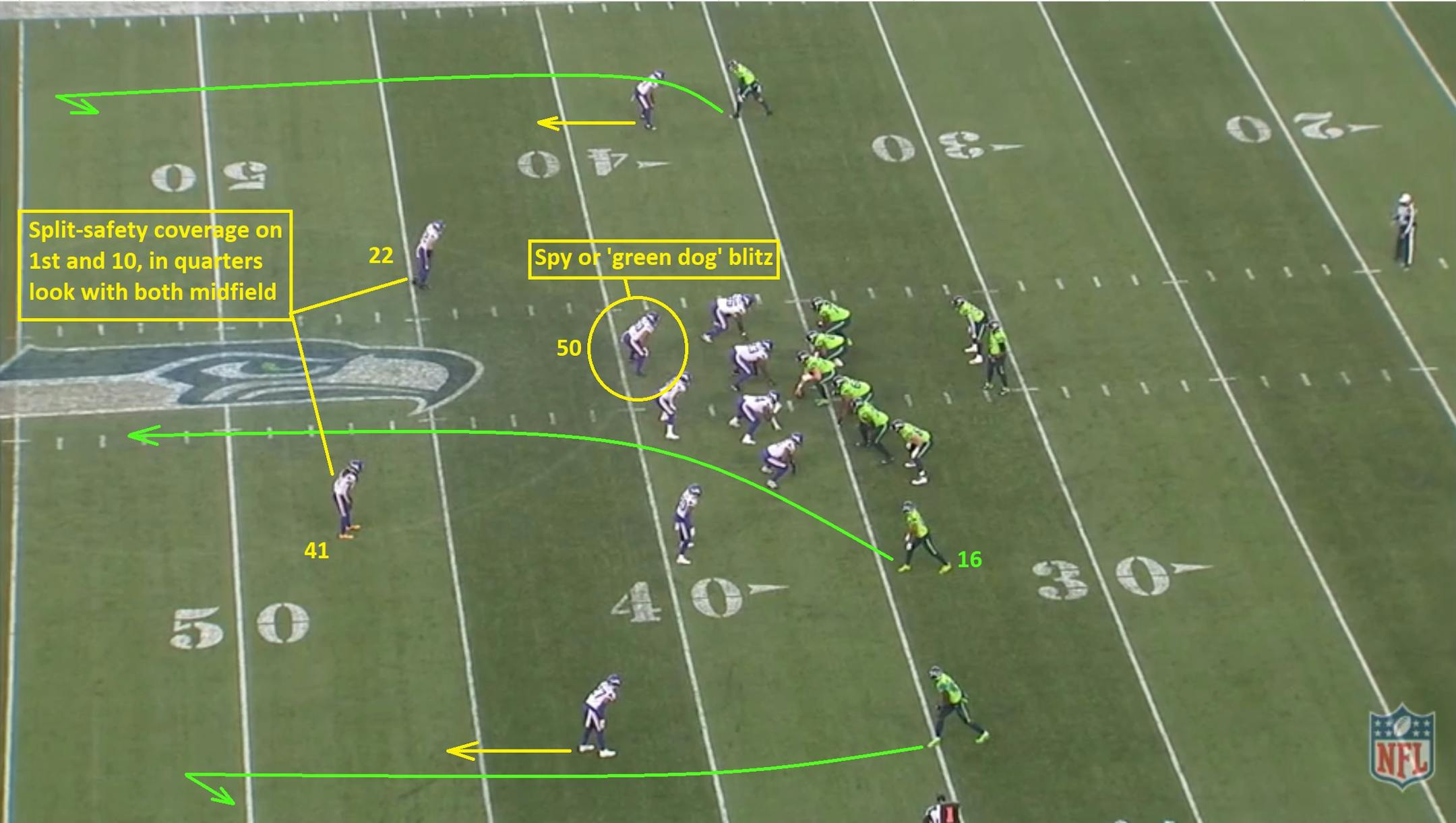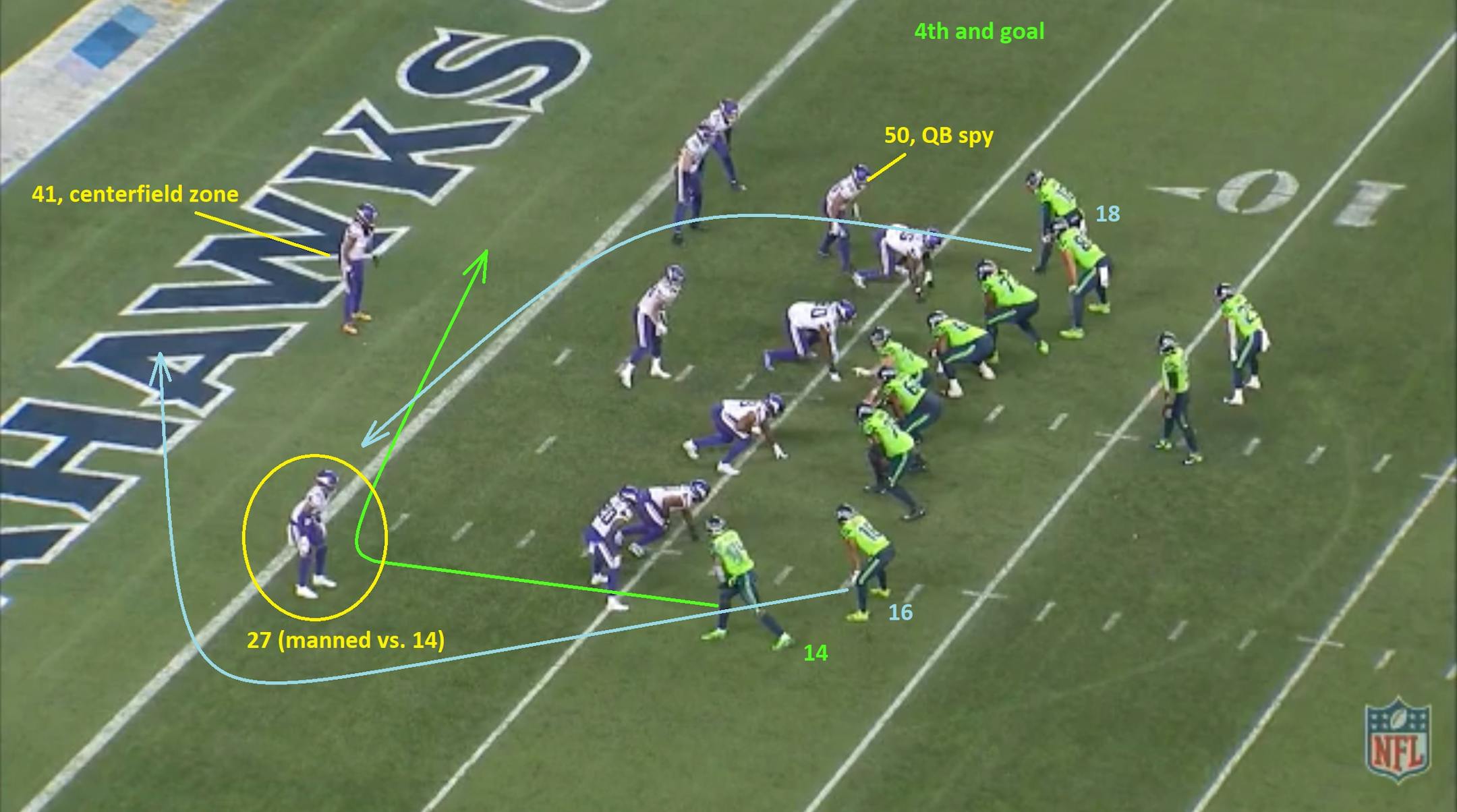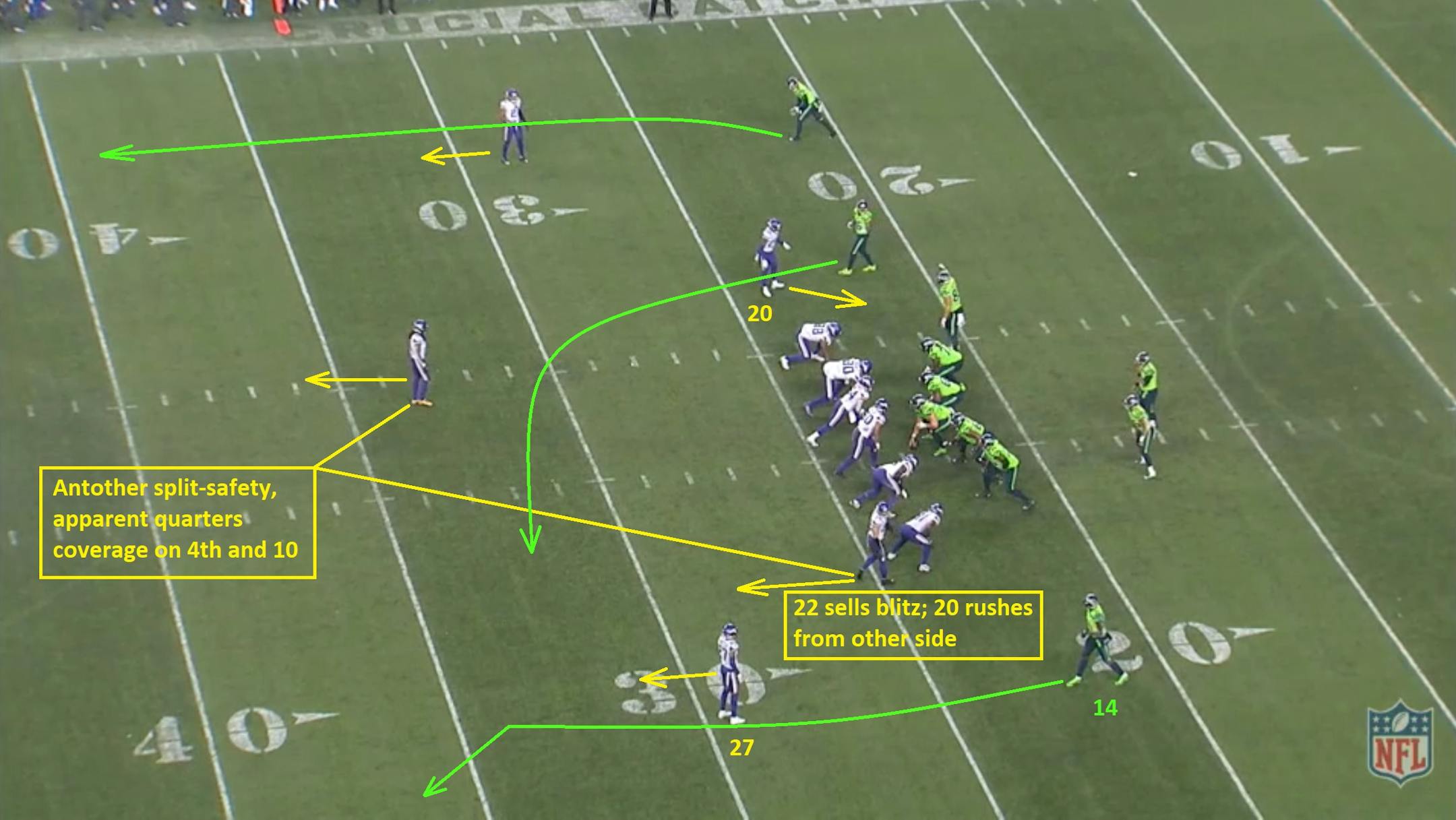 With Mike Zimmer pulling his safeties back for much of the night, often two-deep coverages smothered downfield sparks and trusted the defensive front to win. Even with Wilson's game-winning, 94-yard drive, he was held to season lows in passing yards (217) and average gain (6.8) to a depleted defense starting two rookie corners.