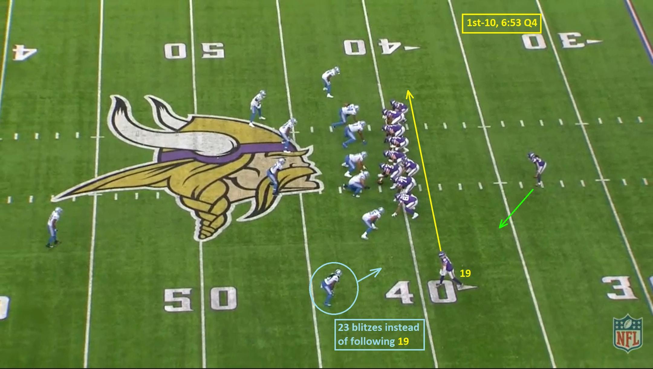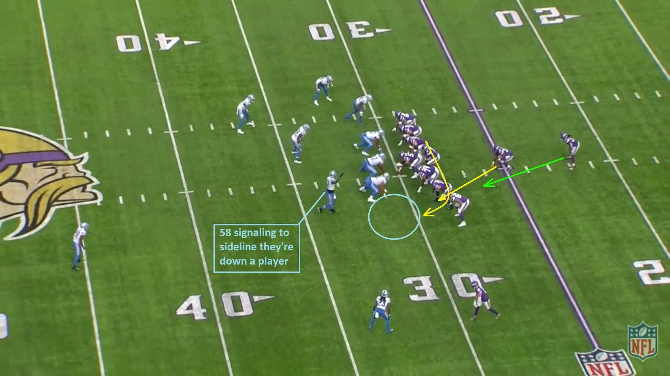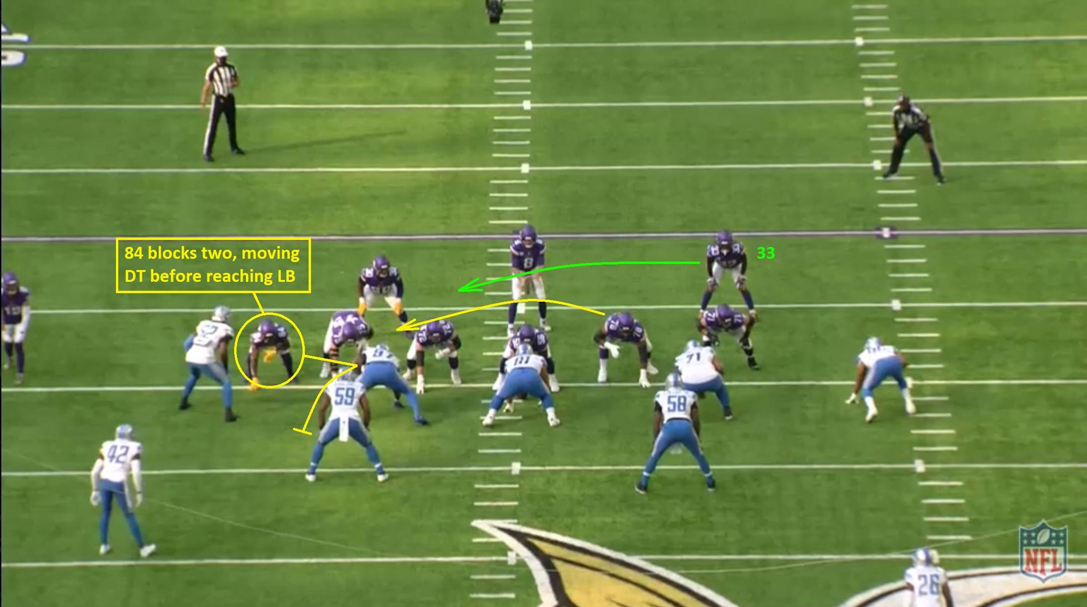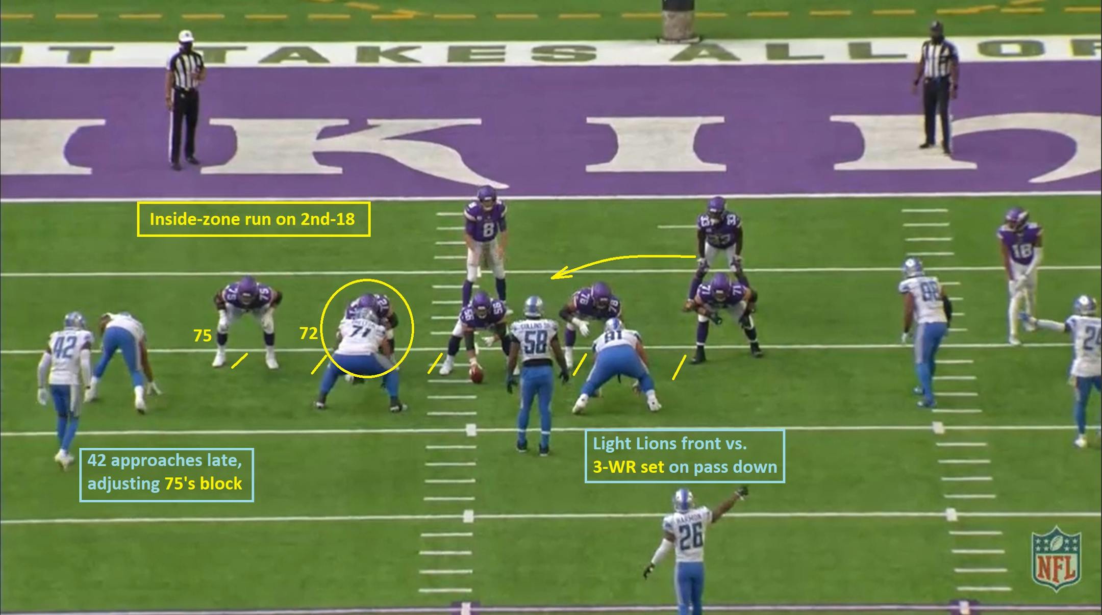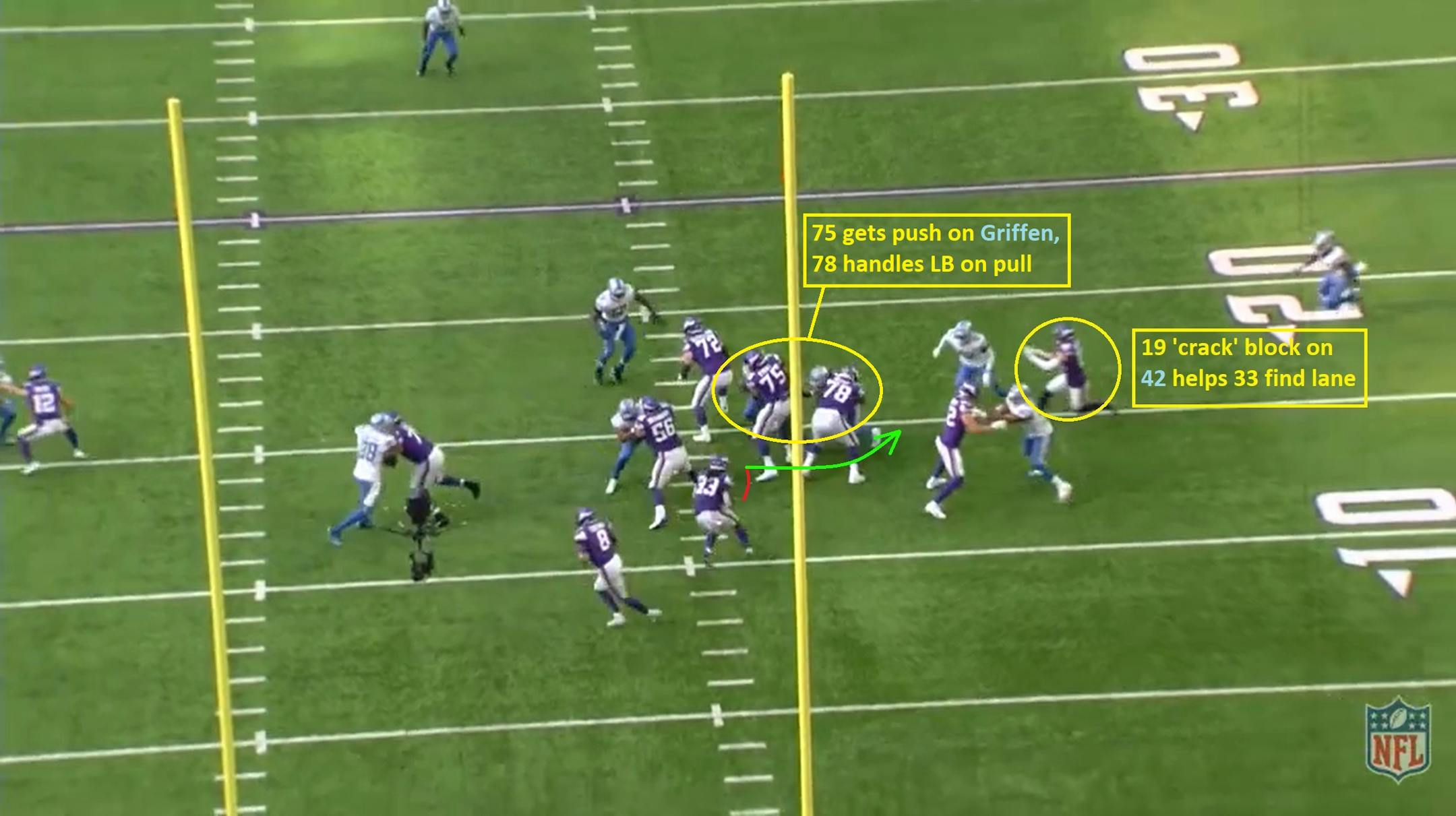 With fullback C.J. Ham joining Cook in the backfield, the Vikings have a numbers advantage (7 blockers vs. a 7-man front) and simply need to win their matchups. Left guard Dakota Dozier (#78) pulls right, but this play starts with tight end Irv Smith Jr. (#84).