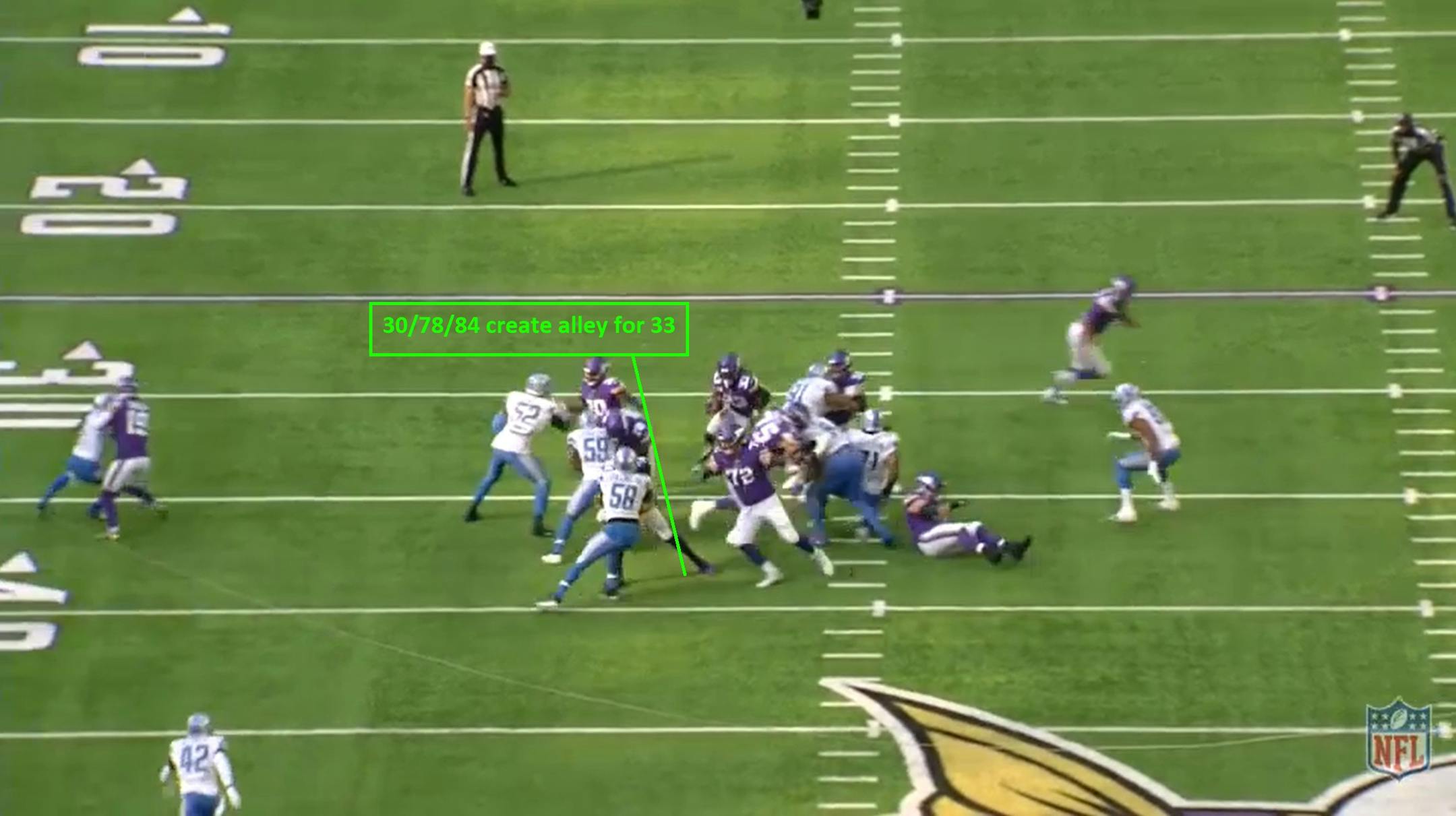 Ham (#30), Dozier (#78) and Smith (#84) create the playside alley for Cook while rookie right guard Ezra Cleveland (#72) does a good job looking for work downfield, hitting linebacker Jamie Collins.