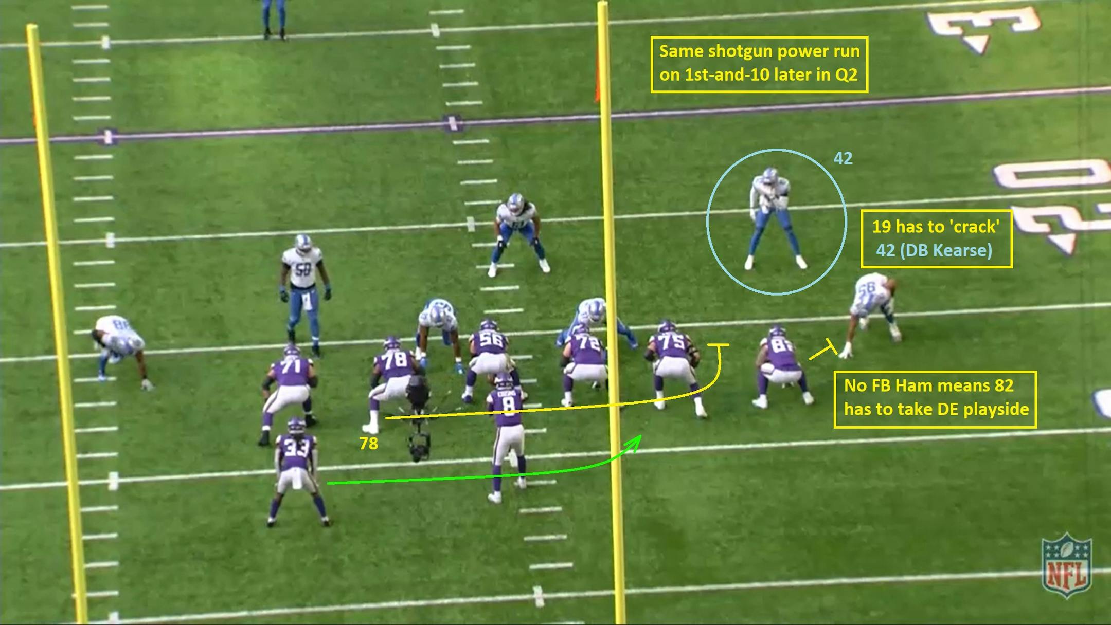 1. Cook didn't have to be a magician for each of his career-high 206 rushing yards against the Lions, as the Vikings offensive line soundly blocked a typically hapless Lions front on plays like this shotgun power run in the first quarter.