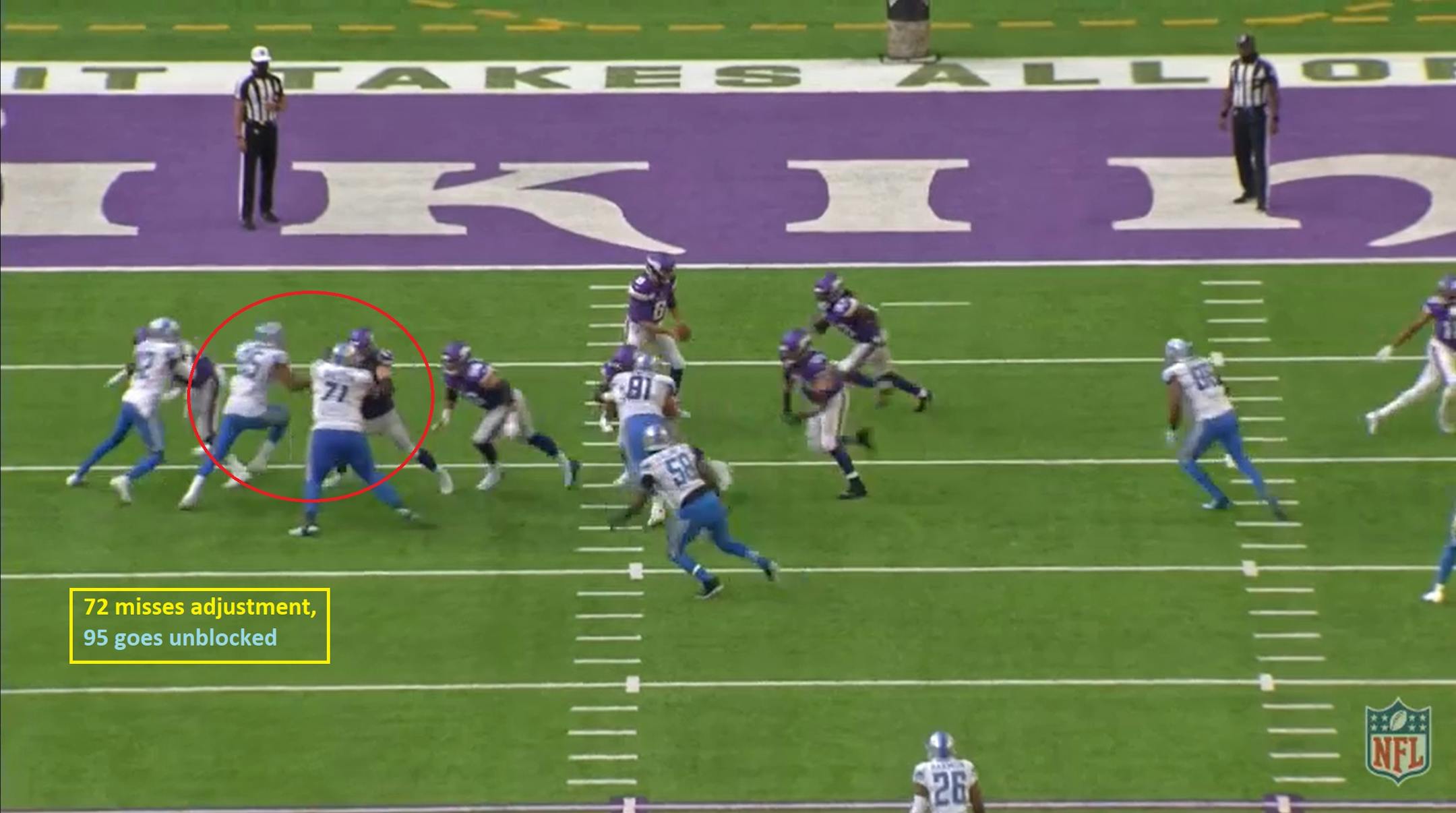 Smith gets a tremendous push on Lions DL Nick Williams (#97), which helps right tackle Brian O'Neill wall off that side of the alley for Cook. Smith helps again by climbing to the linebacker level.