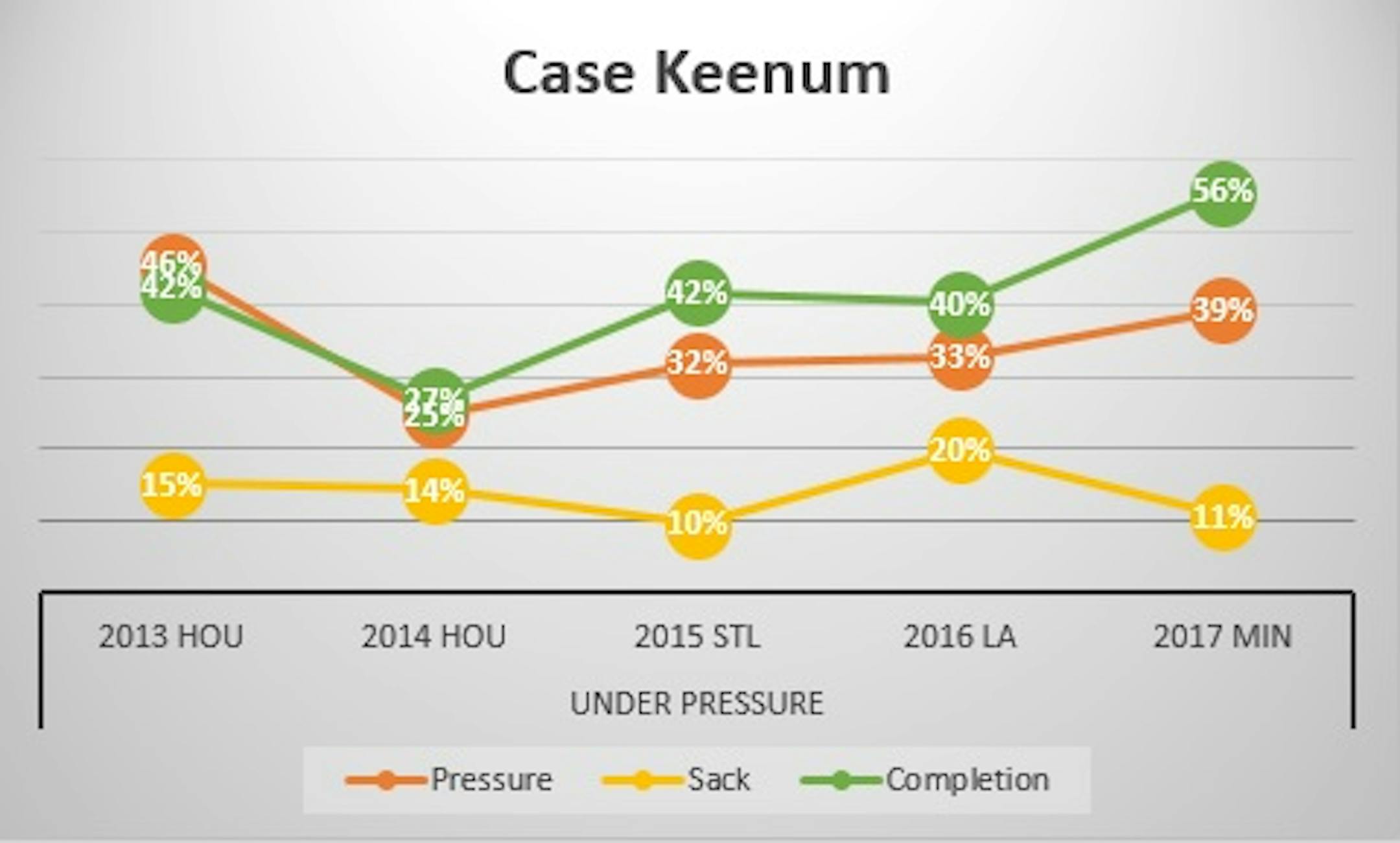 Despite immense production in college, Keenum was overlooked because of his smaller stature and his thriving in a spread offense at Houston. Then a first shot as an NFL starter ended with an 0-8 record, losing seven in a row with the Texans by an average of 4.1 points. The iron also didn't heat up under Jeff Fisher's Rams.