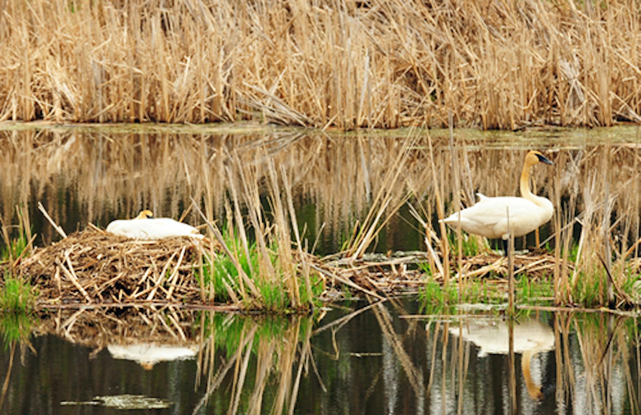 Nesting Trumpeter Swans is not unusual in Hennepin County. Usually, you see spots of white at a distance across the open water of a large marsh. Yesterday, driving west on Highway 12 toward Delano I came across this pair of swans. The nest, on which the female, I presume, sits, is about 120 feet off the roadway, clearly visible. If the birds remain there after the hatch, watching the signets grow will be interesting. Traffic on that highway is killer-busy. Shoulders are too narrow for parking. Take a slow-down look when there are no huge trucks behind you (big, fast trucks are too common). Disturbing the swans could mean they will abandon the nest and eggs.