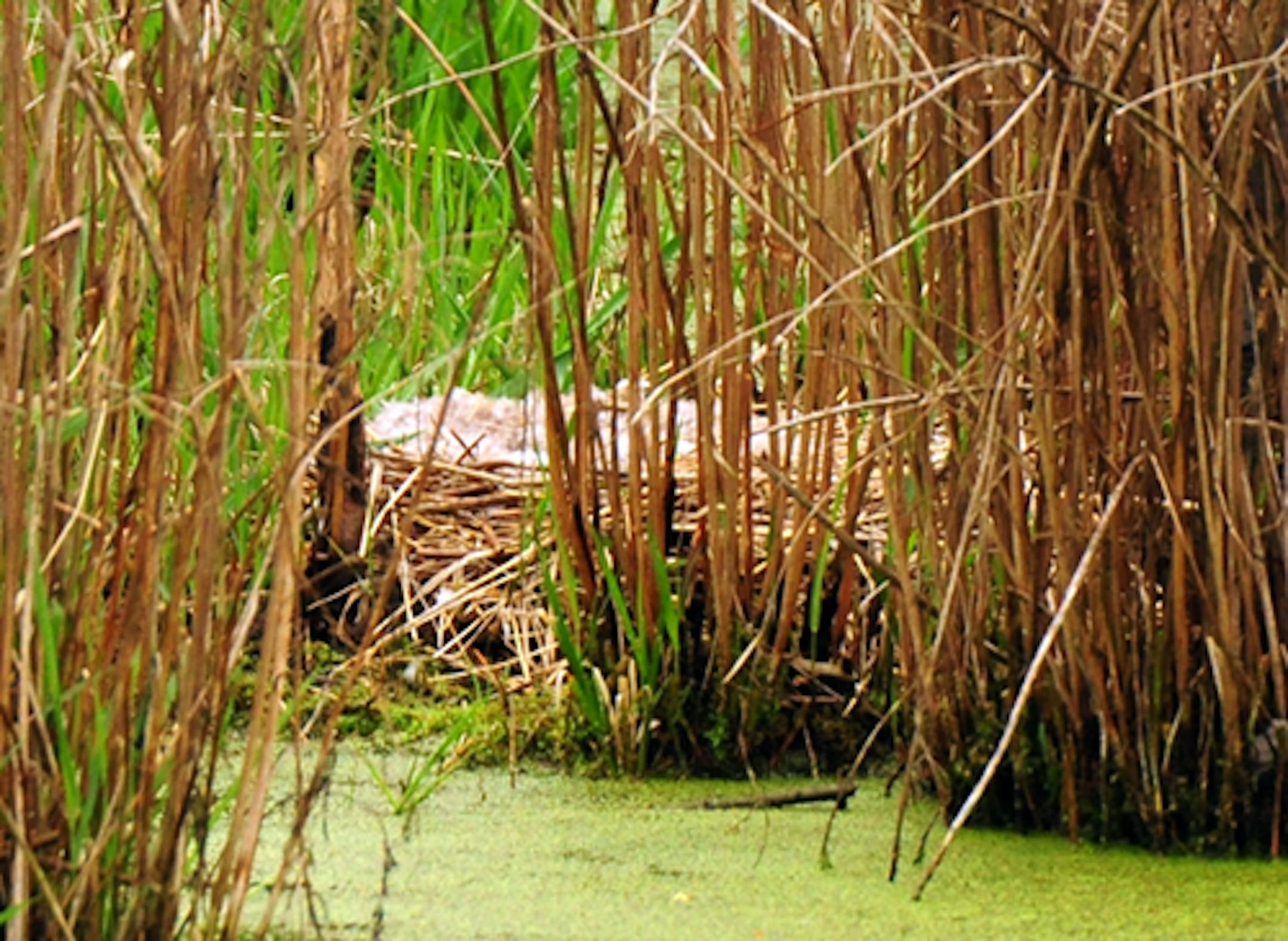 The Canada Goose nesting in our backyard pond built her own nest this year. It resembles a tightly woven basket. Nice work. Last year, when she didn't build, but just hung around, I knocked together a floating platform, filled it with marsh grass, and she used it. She was eating beneath our bird feeders when I took this photo. I was interested in the down that fills the nest, covering the eggs in her absence. When she sits, she fills the nest.