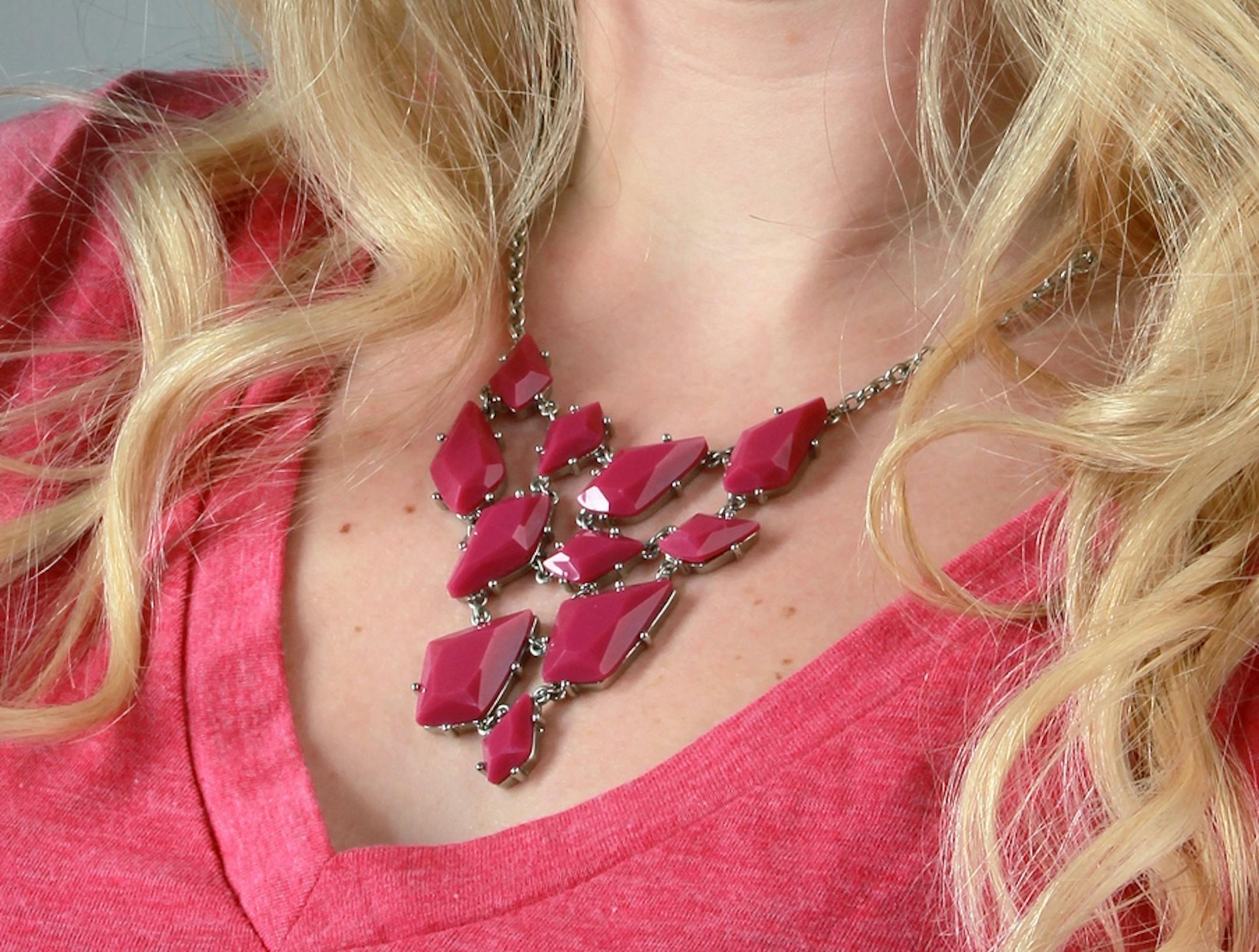V-shaped necklines are among the most popular, because they are considered almost universally flattering. However, choosing a choker or short strand necklace counteracts the face-framing and bust-flattering properties of this shape by cutting off the V at its very top. A general rule for pairing necklaces and necklines is to utilize mirrored shapes. With a V-shaped opening, select a V-shaped necklace. Triangular bib necklaces fill the space and mirror the neckline, but pendants worn on chains also will work beautifully. Make sure there is one-half inch to one inch of space between where your necklace ends and neckline begins.