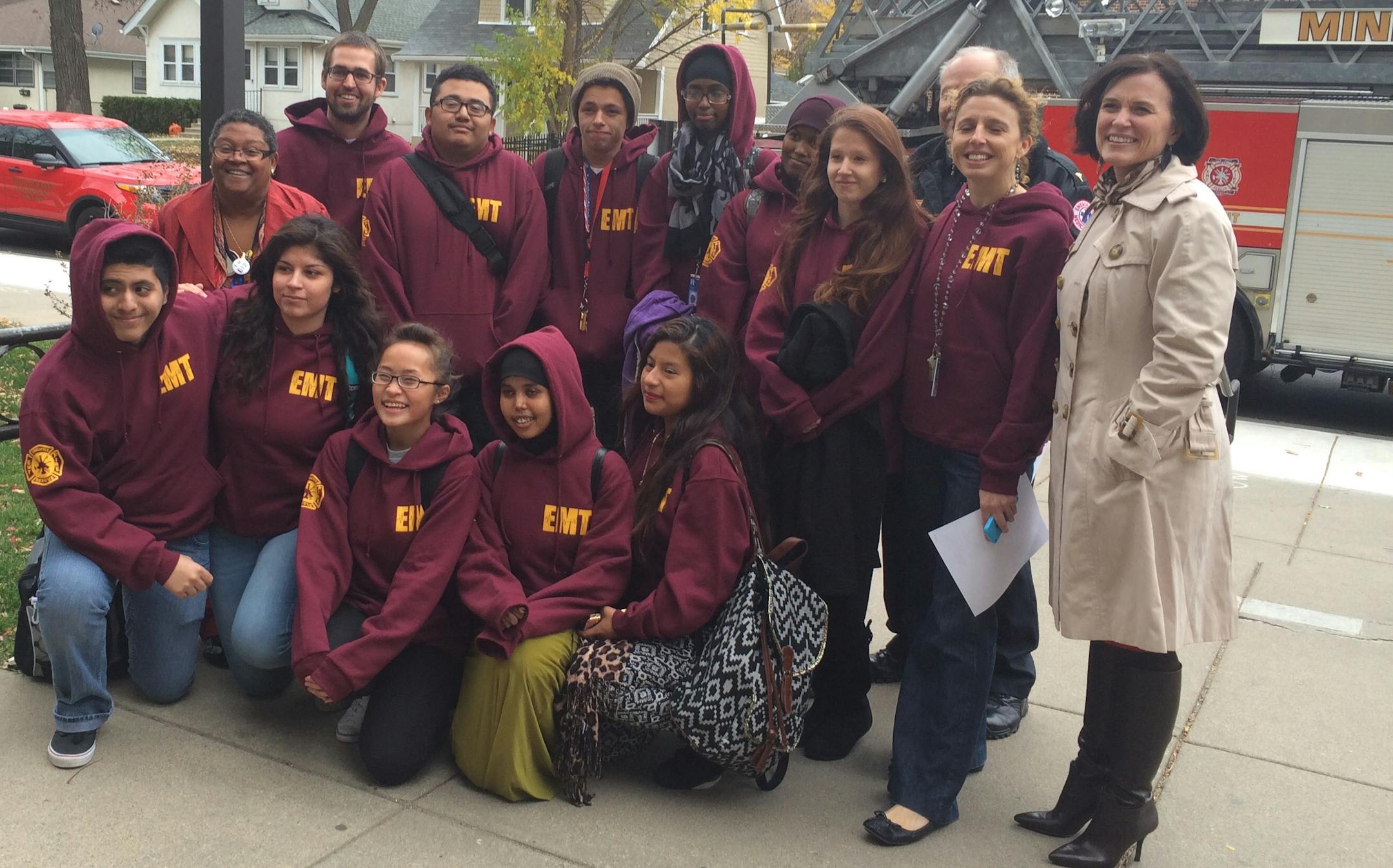 Eleven students at Roosevelt High School were recognized Tuesday by Mayor Betsy Hodges, Fire Chief John Fruetel and Minneapolis Public Schools Superintendent Bernadeia Johnson as they completed the first step in a course that will end with a chance to receive EMT certification. Alaready, the students have completed enough coursework to earn EMR --emergency medical responder -- status.