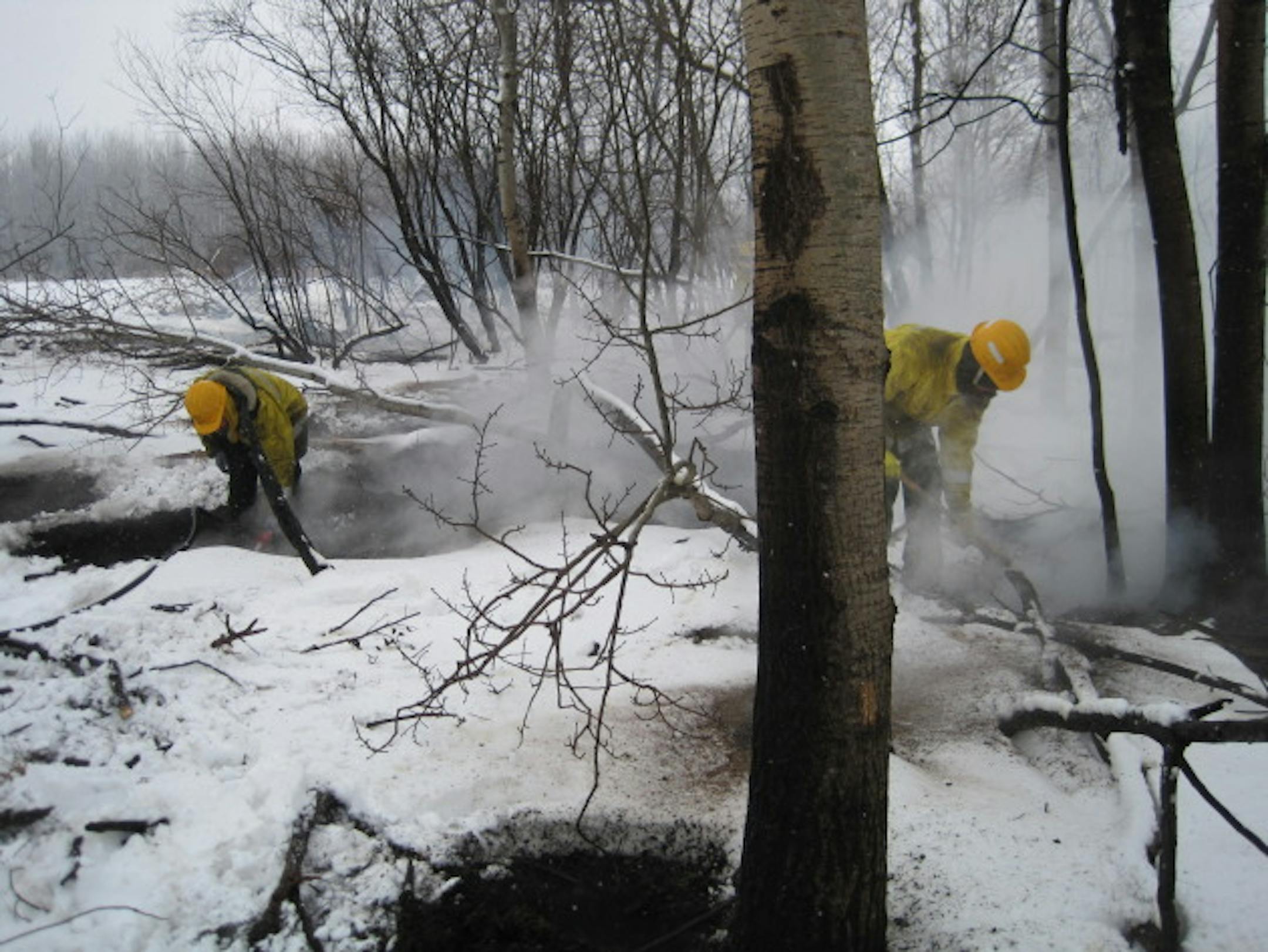 And once they start, peat fires can burn for years, creating huge pockets below the surface. They are also dangerous for firefighters. They smolder underground as a glowing combustion rather than an open flame. Windy conditions can move them around and bring embers to the surface where they ignite frozen grass and trees. Firefighters are at risk of severe burns on their feet and legs if they fall into pockets of burning peat.