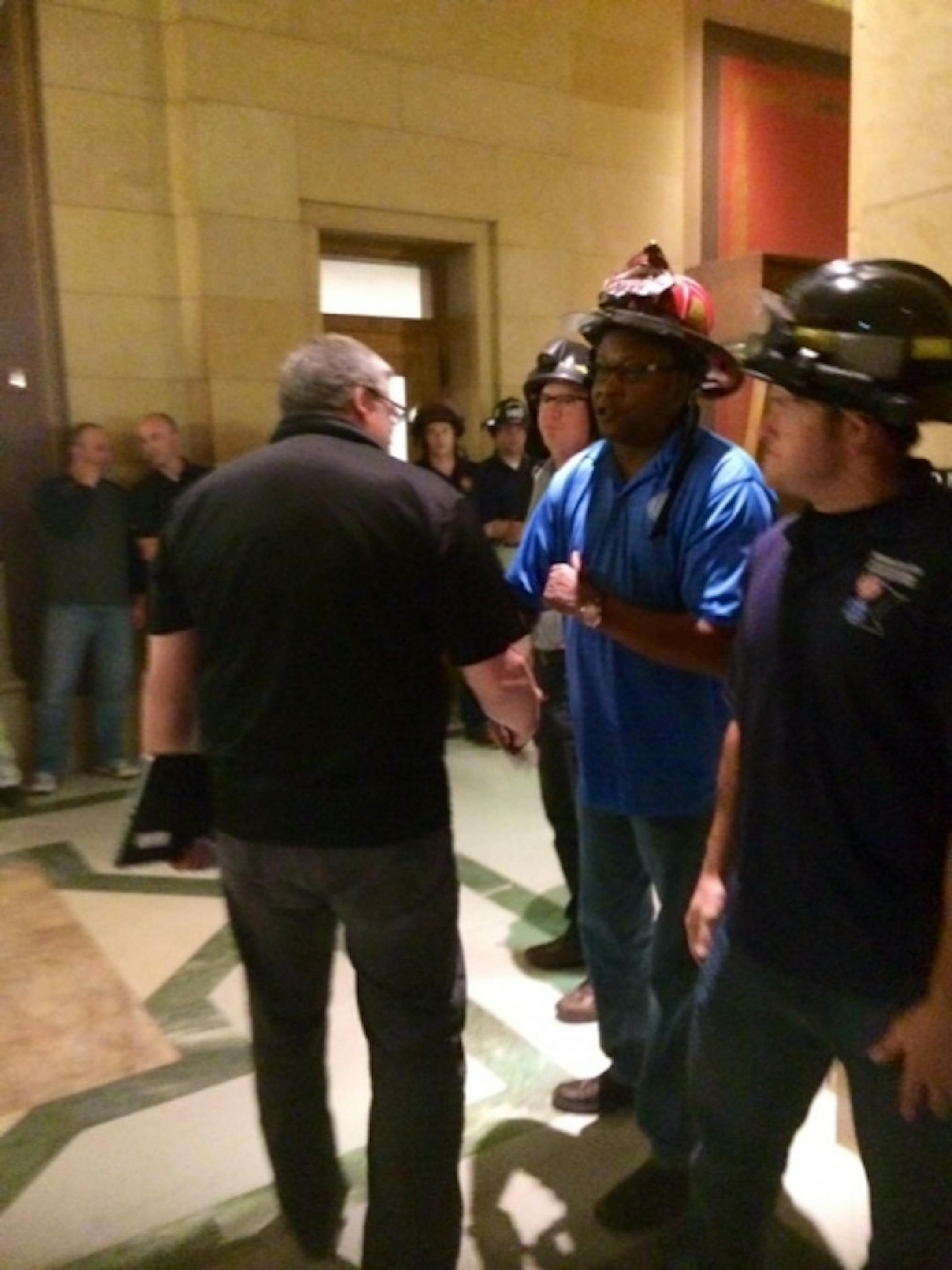 Photo: DFL Rep. Erik Simonson, an assistant Duluth fire chief, greets his fellow firefighters at the Capitol.