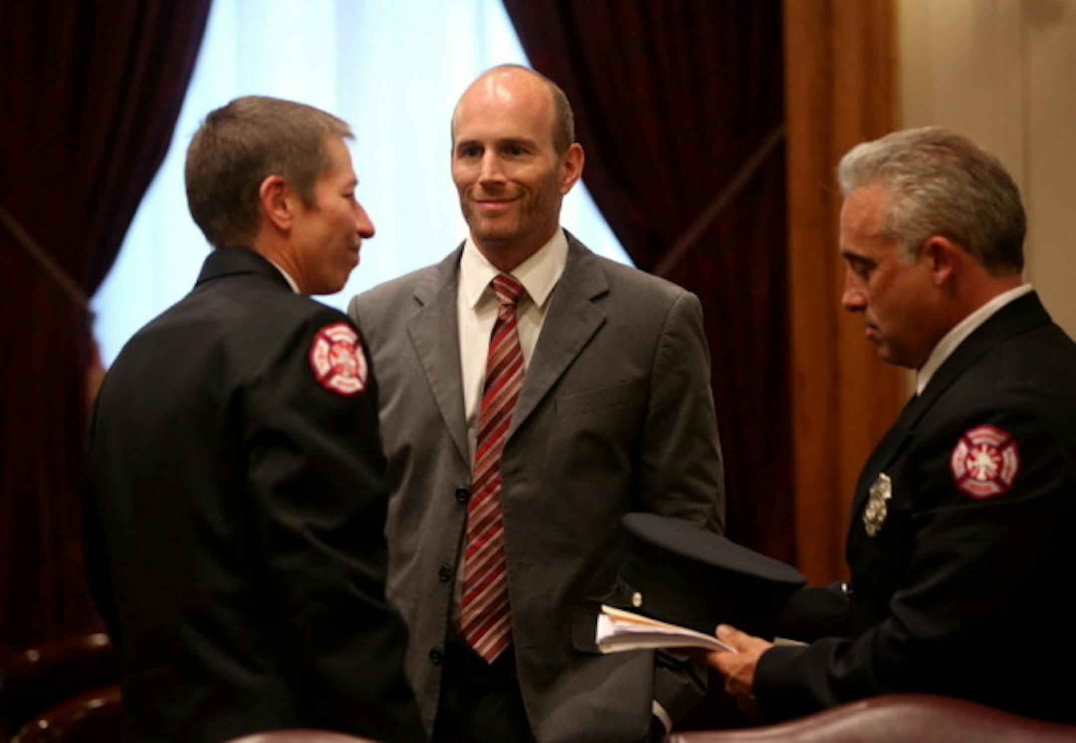 Photo: Schiff with Lakosky (right) and firefighter Christie Nixon (left) at the Capitol this June (Renee Jones Schneider)