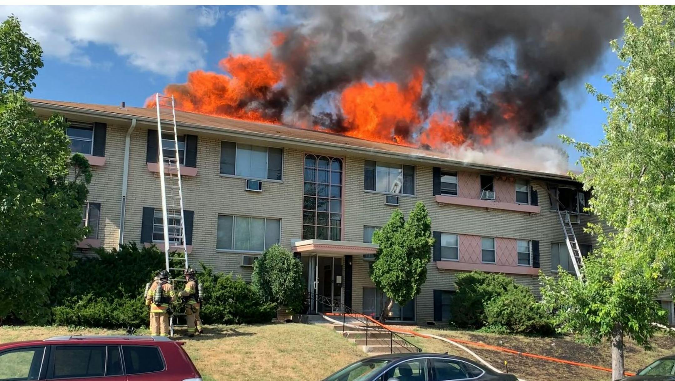 Fireworks are suspected of igniting a three-alarm fire that heavily damaged an apartment building Sunday afternoon in St. Paul's Highland Park neighborhood.